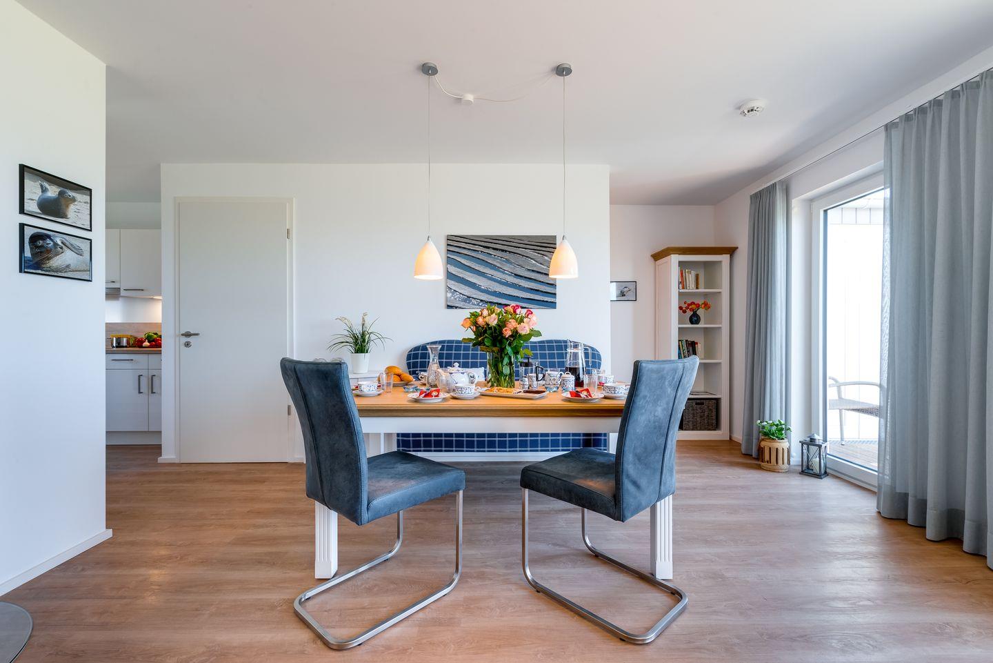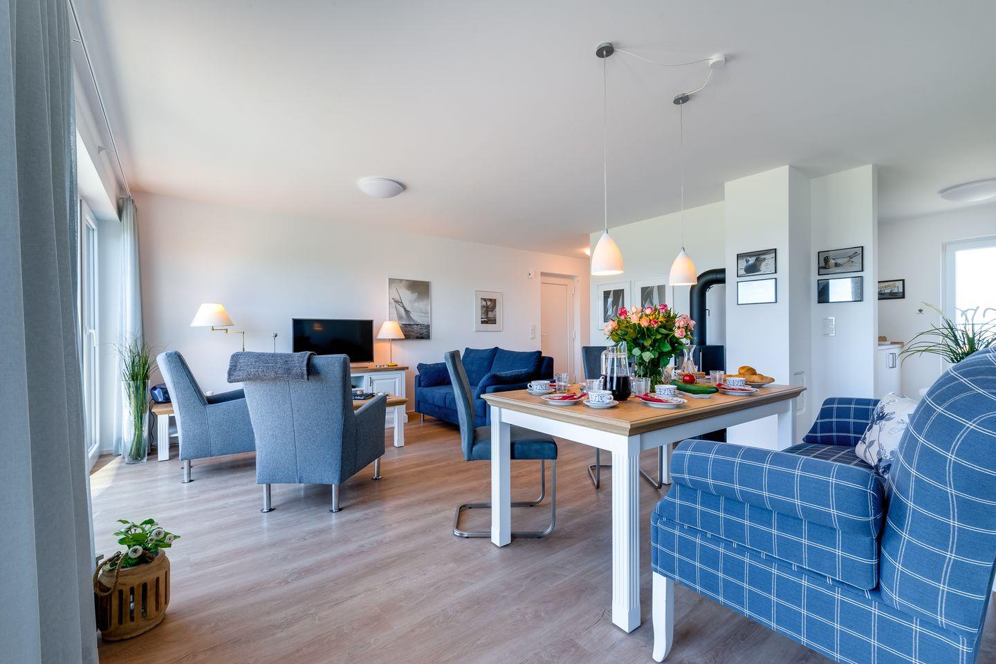 Mit Platz für bis zu 5 Personen bietet das Haus auf seinen 127 m² eine helle, voll ausgestattete Küche und einen gemütlichen Wohnessbereich, der zum Speisen und Relaxen einlädt. Der kommunikative Wohnbereich mit komfortablem Sofa und zwei Sesseln wird an kalten Tagen durch den wärmenden Kaminofen zum Mittelpunkt des Hauses.