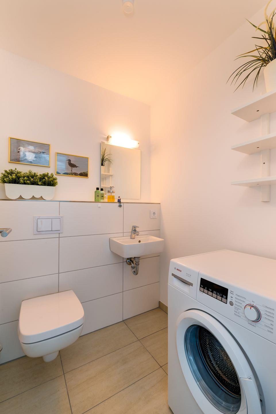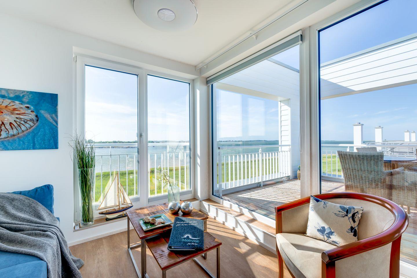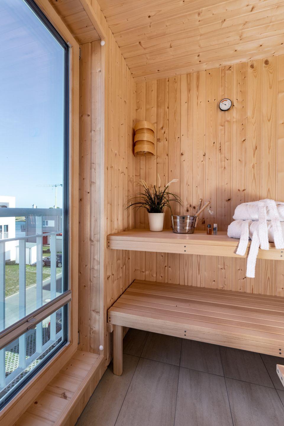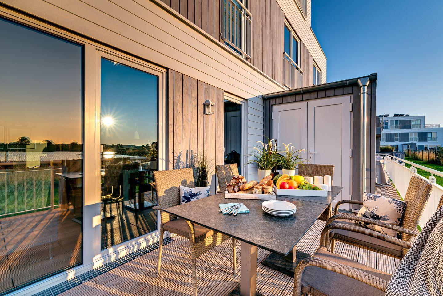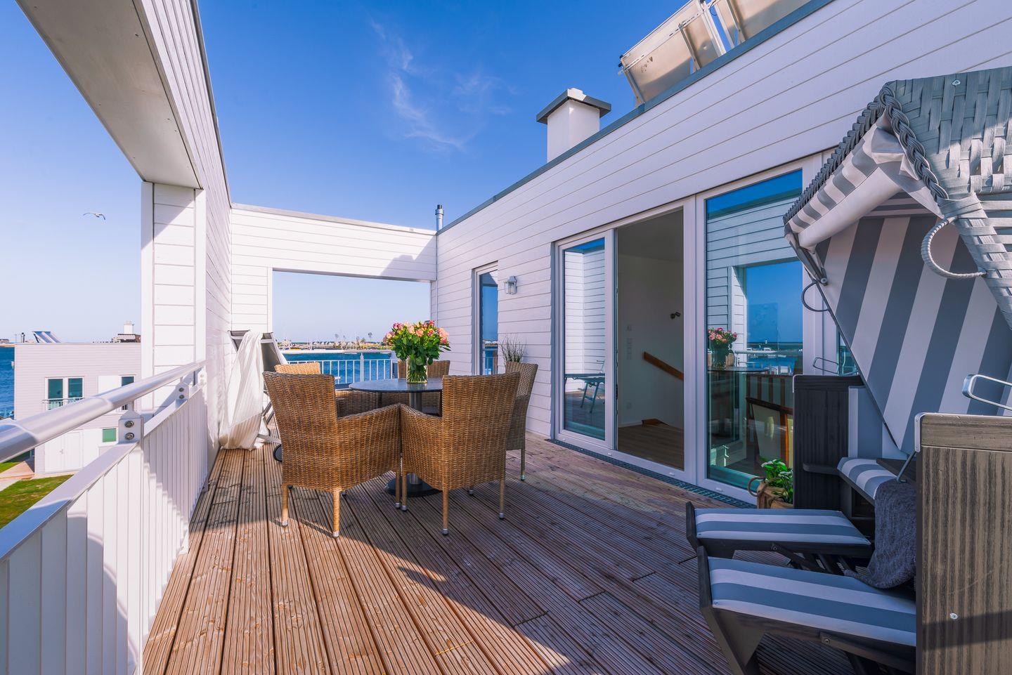 Für Wellness-Liebhaber befindet sich eine Sauna im Dachgeschoss. Nach einem Saunagang oder langen Spaziergang lädt die riesige Dachterrasse mit Liegen und Strandkorb zum Entspannen ein. Am Runden Tisch mit gemütlichen Korbsesseln steht einem langen Frühstück oder Abendessen mit Traumaussicht über Schlei und Ostsee nichts entgegen.