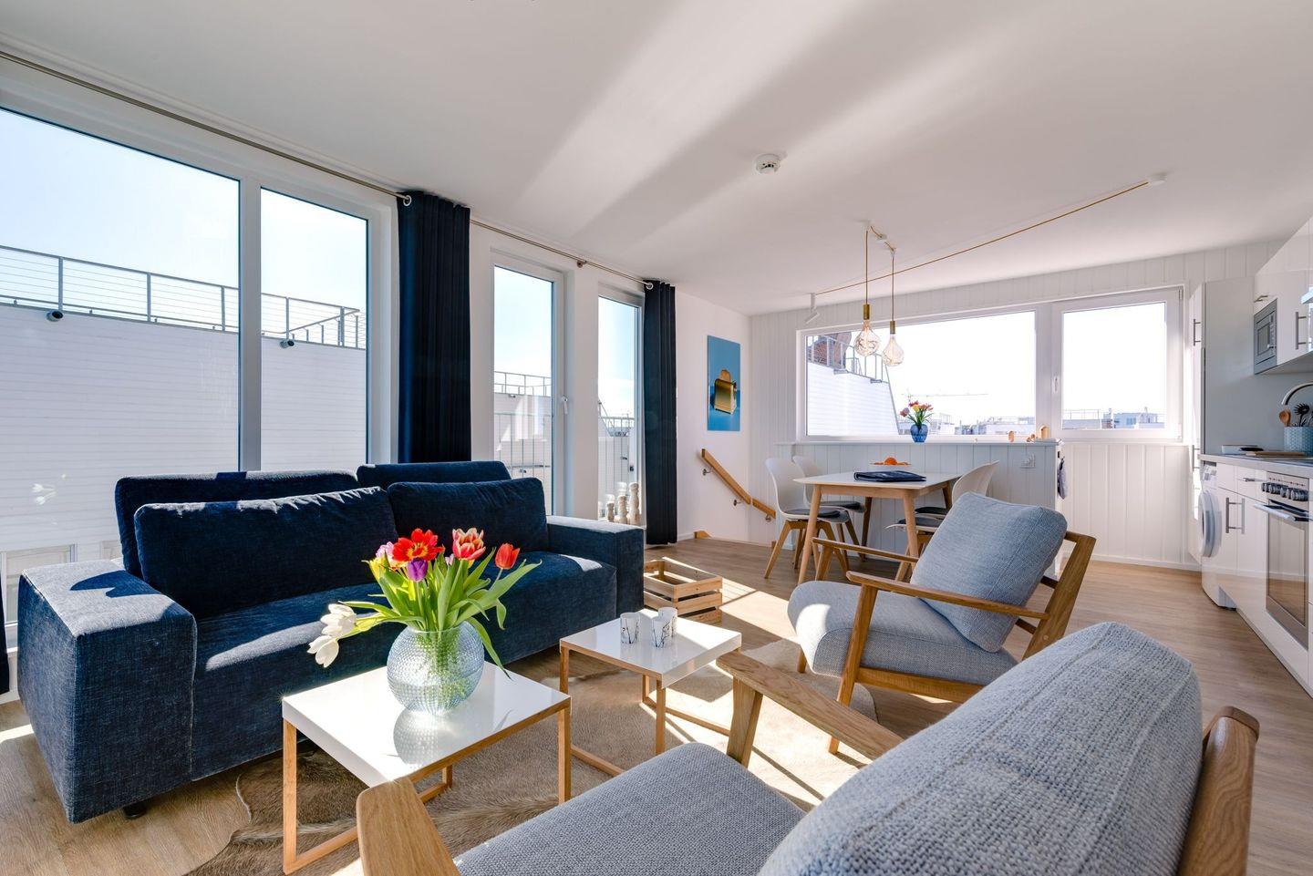 Von der Terrasse im Obergeschoss gelangen Sie zur 30 Quadratmeter großen Dachterrasse mit Strandkorb und bequemen Loungemöbeln. Hier können Sie die Sonne genießen und einen romantischen Sonnenuntergang über der Schlei und dem Hafen der Ostsee erleben.