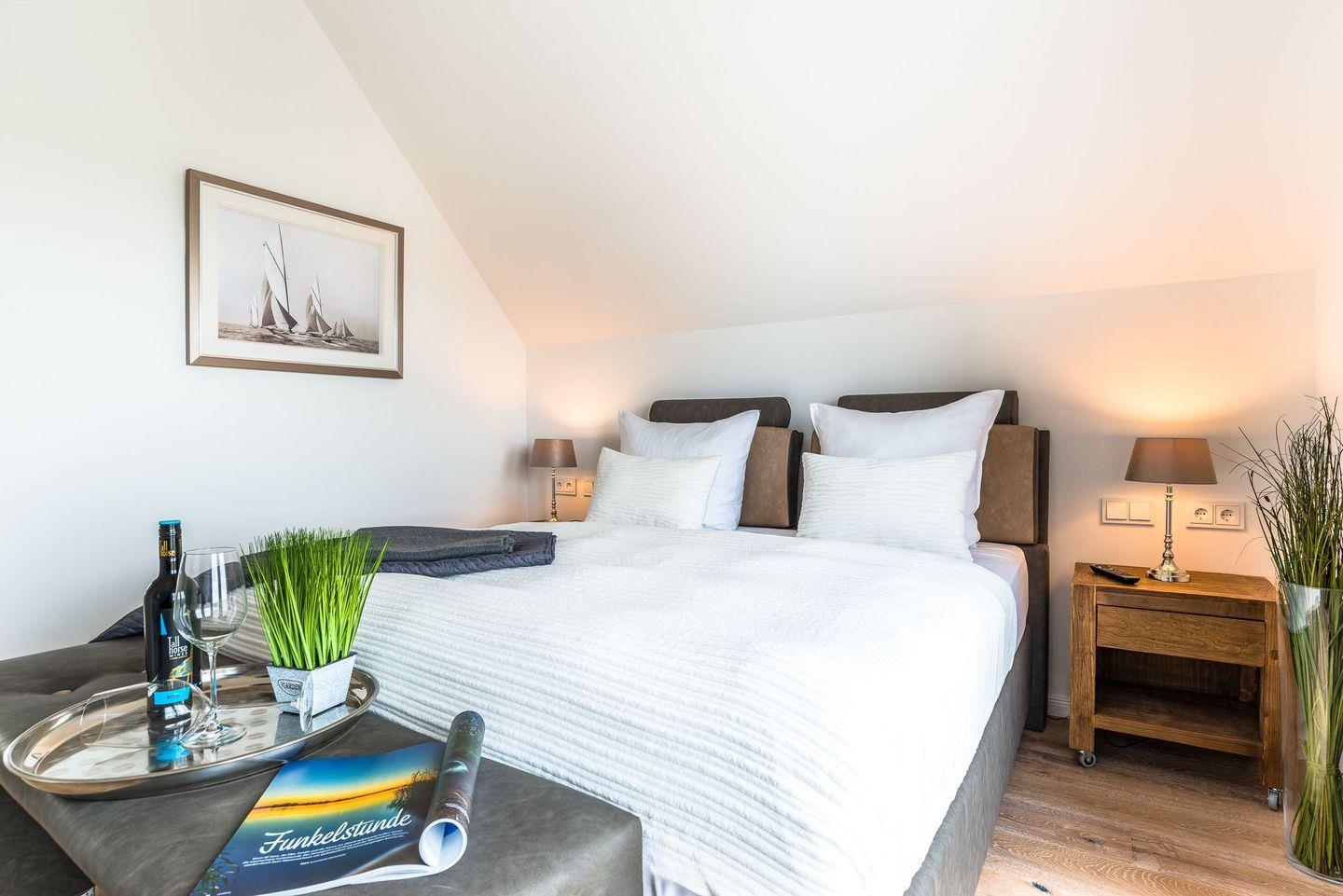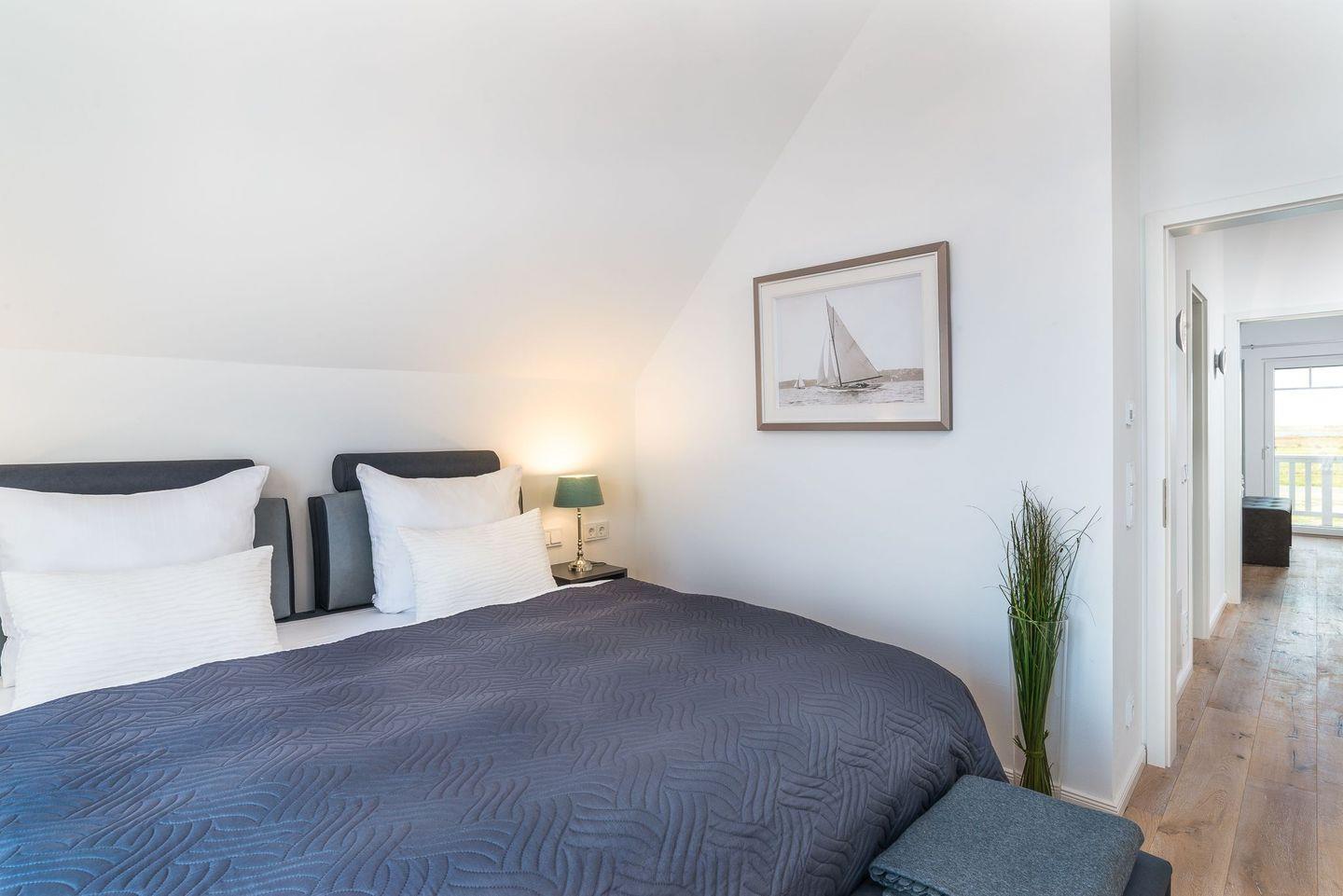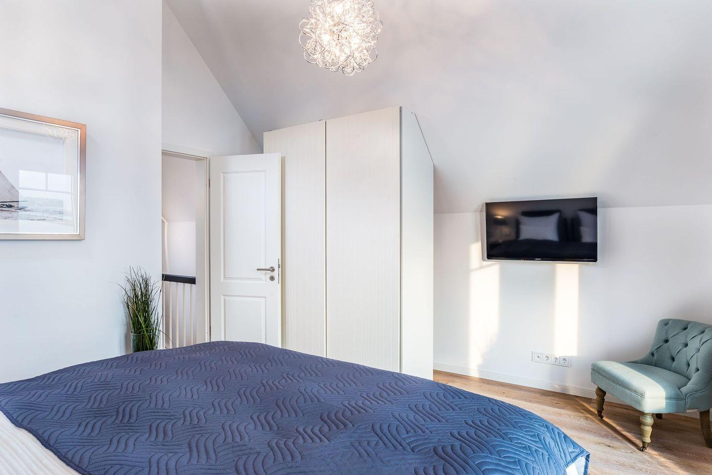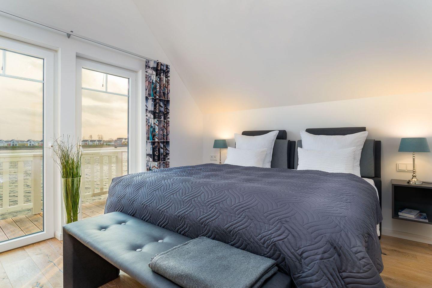 Im Obergeschoss befinden sich zwei Schlafzimmer mit hochwertigen Boxspringbetten (1,80 x 2,00 Meter) aus einer Bettenmanufaktur. Beide Schlafzimmer verfügen über einen eigenen TV sowie jeweils einen Balkon mit Blick auf das Wasser. Das Badezimmer bietet eine ebenerdige Dusche, einen Waschtisch, eine Badewanne, ein WC sowie eine finnische Sauna. Ein Bluetooth-Lautsprecher steht für musikalische Unterhaltung bereit. Ein weiteres WC befindet sich im Erdgeschoss.
