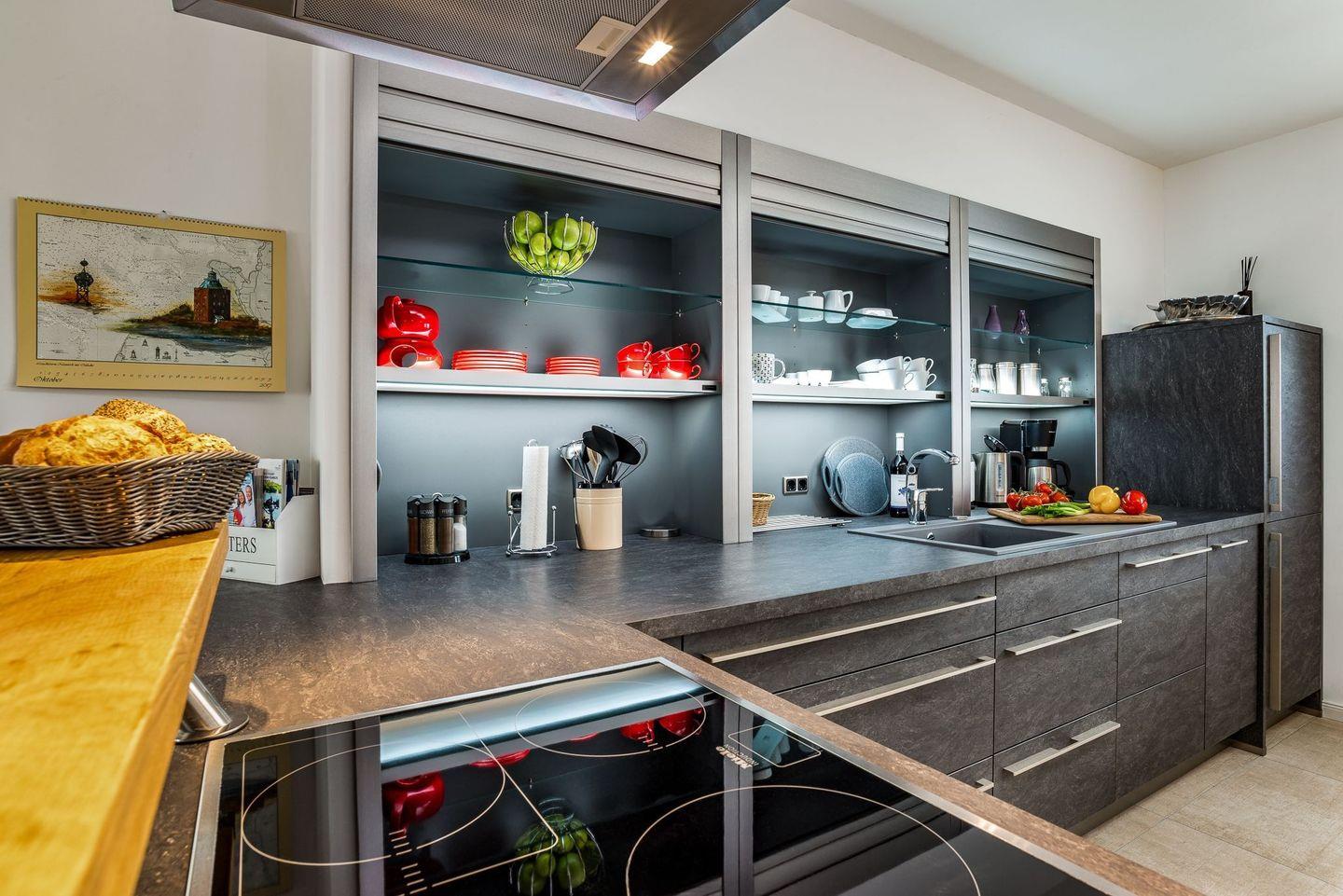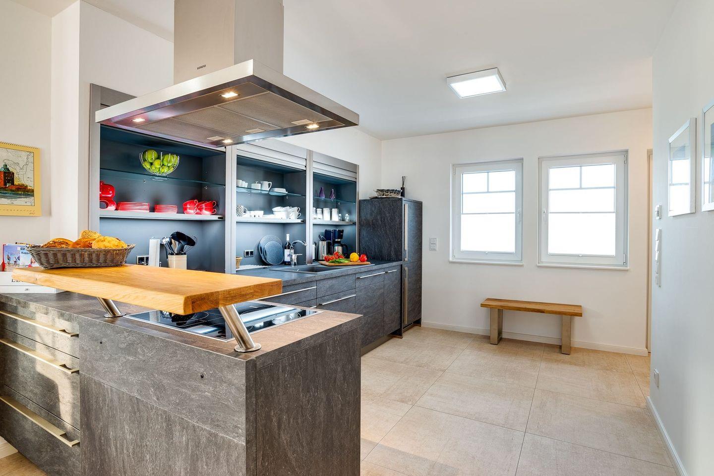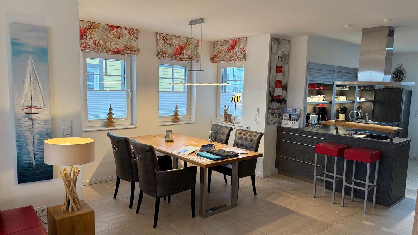 Im Erdgeschoss befindet sich eine moderne Küche, die unseren Gästen die Möglichkeit bietet, Speisen zuzubereiten und dabei den Blick auf vorbeifahrende Segelboote zu genießen. Im angrenzenden, offenen Esszimmer können Sie Ihre Mahlzeiten am Esstisch einnehmen. Anschließend lädt eine Loungeecke vor dem Kamin dazu ein, den Abend bei einem Glas Wein mit Blick auf das Wasser ausklingen zu lassen.