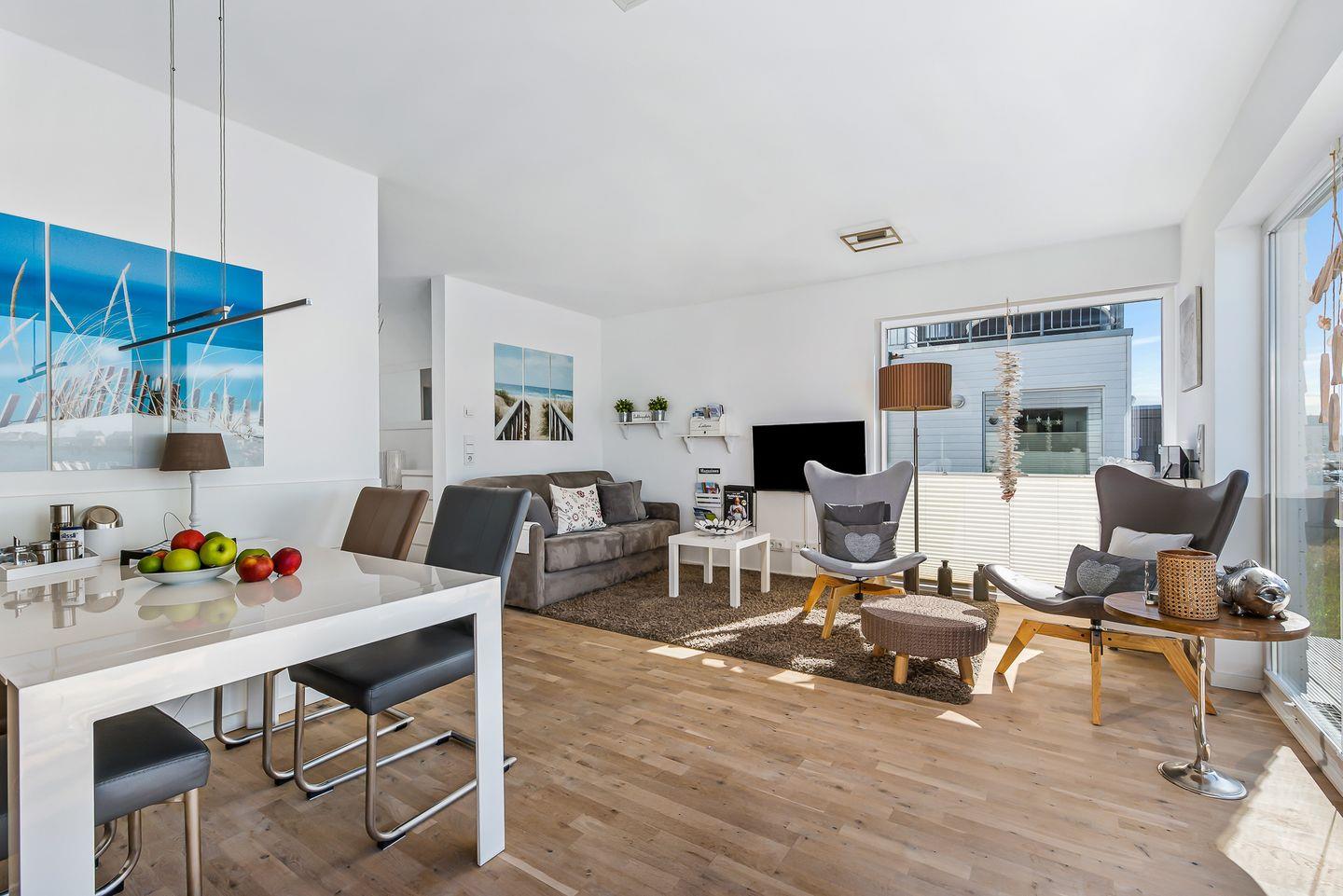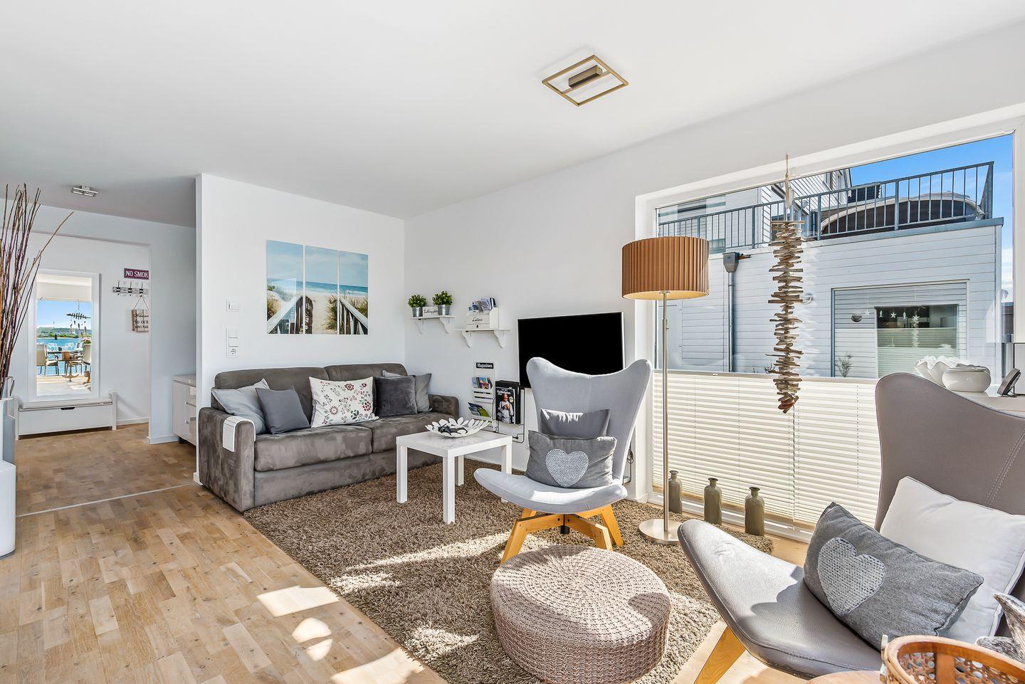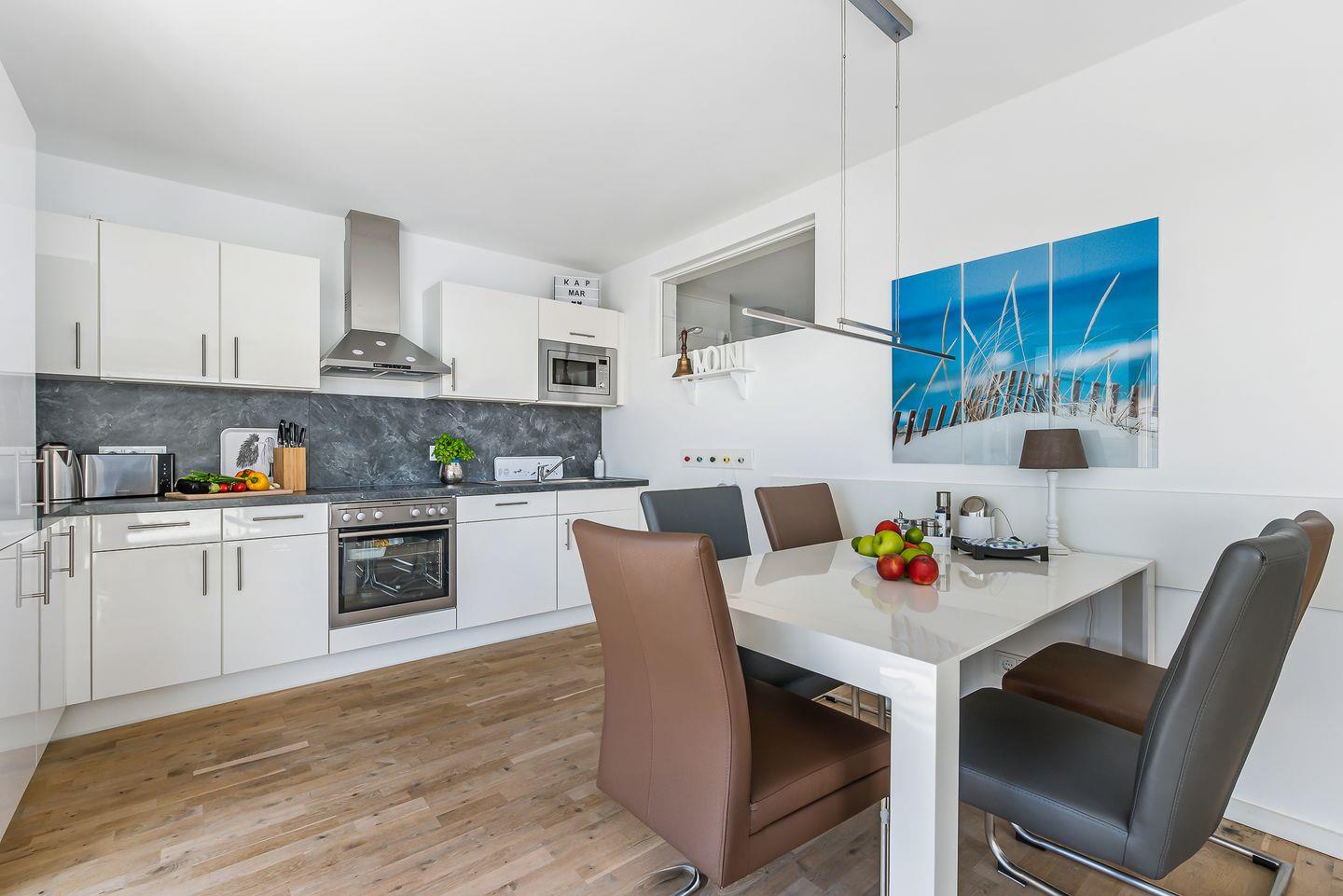 Die Ferienwohnung "KapMar" bietet Ihnen einen offenen Wohn-, Ess- und Kochbereich mit allem was das Ferienherz begehrt. Vom Eingangsbereich schreiten Sie in die lichtdurchflutete Wohnung wo Couch und TV, ausziehbarer Esstisch und bequeme Schwinstühle, sowie Terasse und Wasserblick auf Sie warten. In der erstklassig ausgerüsteten Küche können Sie regionale Spezialitäten selbst zubereiten und sich kulinarisch verwöhnen. Alternative zum Herd bzw. Kochfeld können Sie auch gern unseren elektrischen Webergrill nutzen.