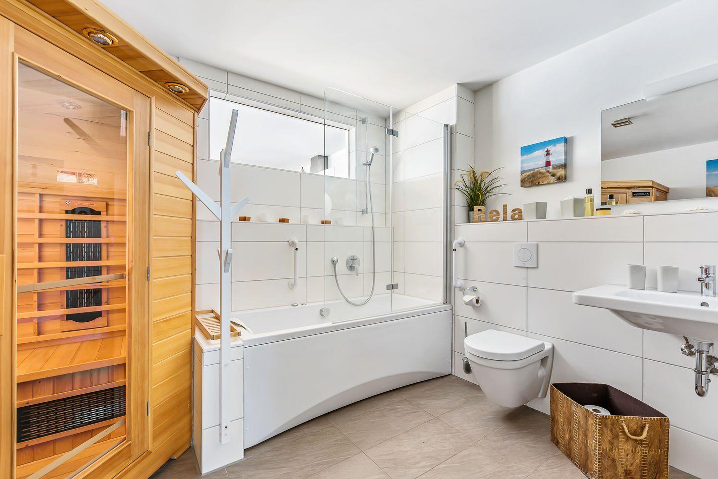 Für eine erholsame Nachtruhe und Entspannung vom Alltag sorgen die rückenschonenden Matratzen in beiden Schlafzimmern. Die Zimmer sind Richtung Norden ausgerichtet und bieten einen traumhaften Blick auf die Schlei und die vorbeiziehenden Segelschiffe, ausgestattet mit einem Doppelbett 180 x 200 bzw. 2 Einzelbetten 90 x 200, die bei Bedarf zusammengestellt werden können. Das exklusive Badezimmer ist neben den üblichen Utensilien zusätzlich mit einer Whirlpoolwanne und einer Infrarotsauna ausgestattet. Föhn und Vergrößerungsspiegel sind ebenfalls vorhanden.