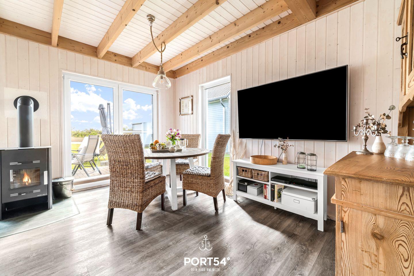 Herzlich Willkommen im "Haus Meerzeit" in Olpenitz. Ihr Feriendomizil besticht durch seine geschmackvolle Einrichtung und die liebevollen Details. Das freistehende Haus verfügt über einen offenen Wohn- und Essbereich, eine Küche, zwei Schlafzimmer und zwei Bäder. Die großen Fenster sorgen für ein lichtdurchflutetes, großzügiges Wohngefühl. Nach langen Strandspaziergängen können Sie auf dem gemütlichen Sofa vor dem Kamin entspannen und Ihre Lieblingsserie auf dem Flachbild-TV schauen. Die Küche bietet alles, was Sie für einen geselligen Kochabend mit der Familie benötigen. Im Obergeschoss finden Sie zwei Schlafzimmer, eins verfügt über ein Doppelbett (180x200cm), das zweite Schlafzimmer ist mit zwei Einzelbetten (90x200cm) ausgestattet. Ein Schlafsofa bietet zwei Kindern weitere Schlafmöglichkeiten. Damit einem erholsamen Schlaf nichts entgegen steht, sind beide Schlafzimmer mit Verdunkelungsmöglichkeiten ausgestattet. Außerdem finden Sie im Obergeschoss ein Badezimmer mit Badewanne zum Relaxen. Zudem befindet sich im Untergeschoss ein zweites Bad mit Dusche und als besonderes Highlight: eine Infrarot-Sauna. An sonnigen Tagen können Sie es sich auf der möblierten Terrasse gemütlich machen und an lauen Sommerabenden im Kreise Ihrer Liebsten den Urlaubsabend ausklingen lassen. Für die Kleinen steht ein Kinderhochstuhl sowie ein Babybett bereit. Für Ihren PKW stehen zwei Stellplätze vor dem Haus zur Verfügung. Das Haus wird für 4 Erwachsene und 2 Kinder angeboten.
