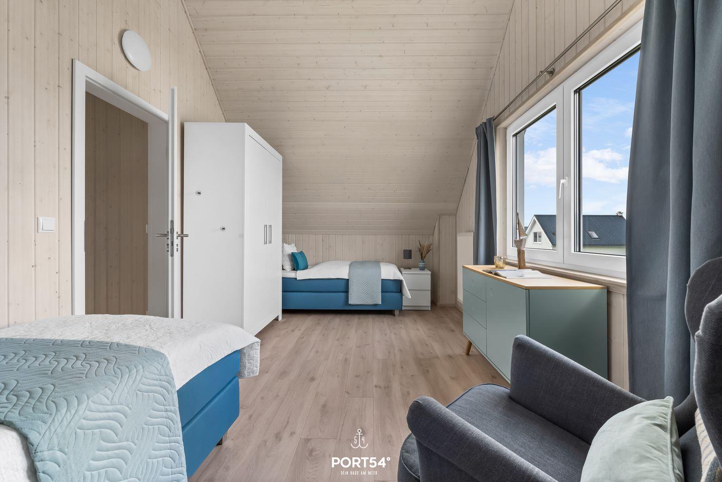 Im ersten Obergeschoss befinden sich die zwei Schlafzimmer. Das eine ist mit einem Doppelbett (180 x 200 cm), einem Kleiderschrank und einer Kommode ausgestattet, das andere verfügt über zwei Einzelbetten (je 100 x 200 cm), ebenfalls mit Kleiderschrank und Kommode. Für erholsame Nächte sind beide Schlafzimmer mit Verdunkelungsmöglichkeiten ausgestattet.