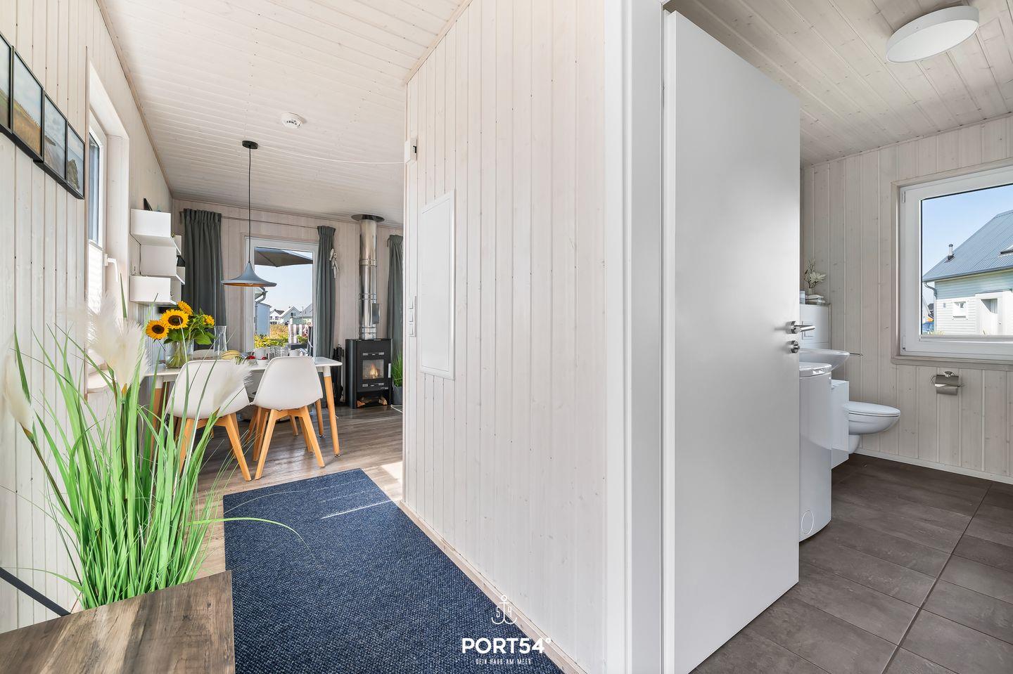 Das Ferienhaus bietet auf 50m² einen offenen Wohn- und Essbereich mit Küche, einem Schlafzimmer, ein Badezimmer und eine Terrasse. In der vollausgestatteten Küche lassen sich leckere Gerichte zaubern. Das eine Schlafzimmer bietet ein Doppelbett. Im Bad ist neben einer Dusche die Infrarot-Sauna. Ein Außenstellplatz und ein abschließbarer Fahrradschuppen sind vorhanden.