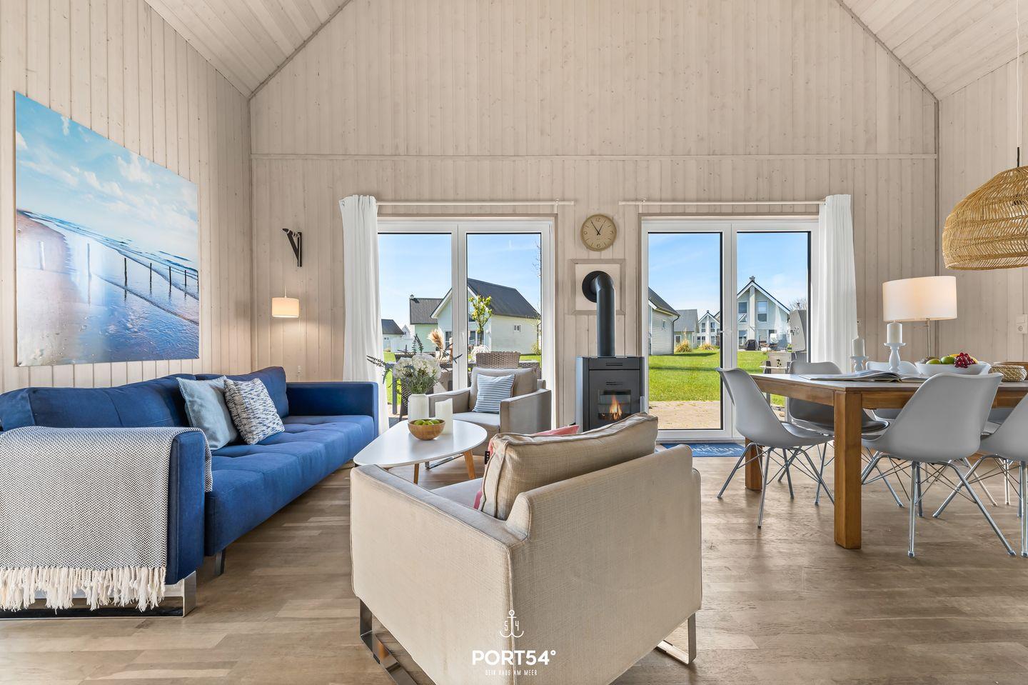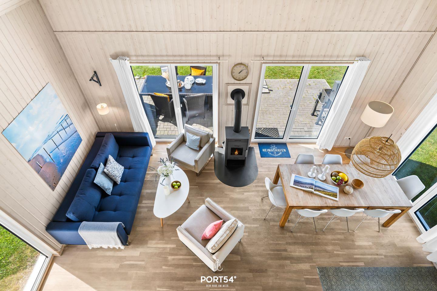Im Erdgeschoss befinden sich zwei der insgesamt drei Schlafzimmer sowie der große, loftartig angelegte Wohn- und Essbereich. Hohe Decken und große Panoramafenster sorgen für besonders viel Lichteinfall und ein herrlich großzügiges Wohngefühl. Nach langen Strandspaziergängen kannst Du auf dem gemütlichen Sofa vor dem Kamin entspannen, ein gutes Buch lesen oder Deine Lieblingsserie auf dem Flachbild-TV schauen. Das Sofa verfügt über eine Schlaffunktion (155 x 200 cm) und bietet Platz für zwei Kinder.