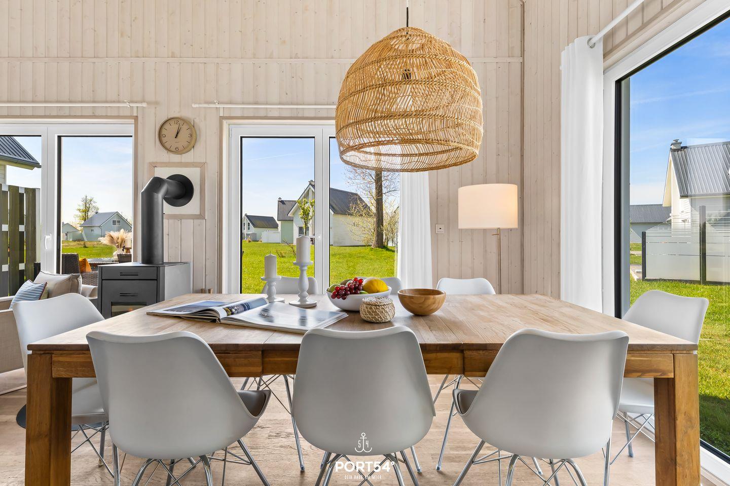 Das freistehende, 98 m² große Haus verfügt über einen offenen Wohn- und Essbereich, eine Küche, drei Schlafzimmer und zwei Bäder. Es besticht durch seine Lage im Grünen und die unmittelbare Nähe zur Ostsee.