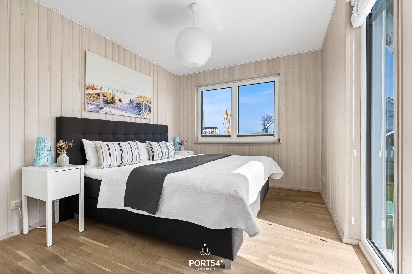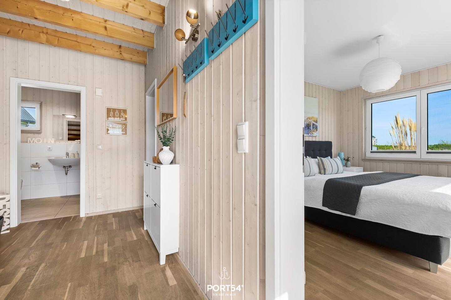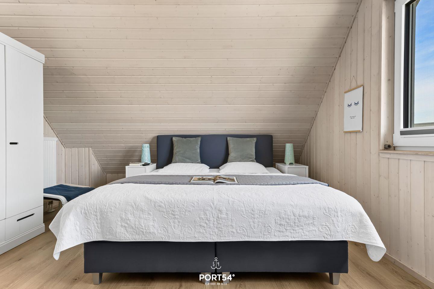 Eines der beiden Schlafzimmer im Erdgeschoss ist mit einem Kleiderschrank und einem gemütlichen Doppelbett (180 x 200 cm) ausgestattet. Das zweite Schlafzimmer verfügt ebenfalls über einen Schrank sowie zwei Einzelbetten (je 90 x 200 cm). Ein weiteres Schlafzimmer befindet Sich im Obergeschoss und bietet ein Doppelbett (180 x 200 cm), einen Schrank sowie einen Smart-TV. Alle Schlafzimmer sind mit Verdunkelungsmöglichkeiten und Insektenschutzgittern ausgestattet. Zusätzlich sorgt eine Trittschalldämmung für einen besonders erholsamen Schlaf.