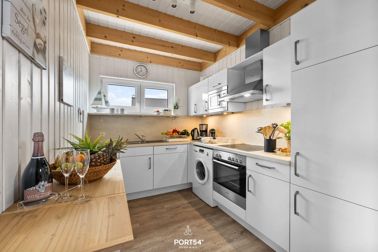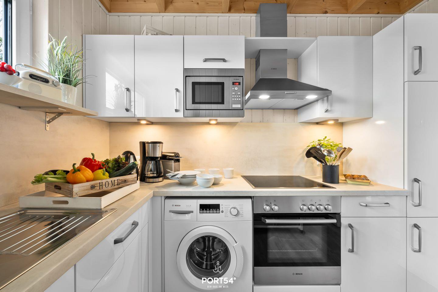 Die voll ausgestattete Küche lässt keine Wünsche offen. Sie verfügt über eine eingebaute Waschmaschine, ein Ceranfeld, einen Backofen, eine Spülmaschine und eine Mikrowelle. Besteck sowie Geschirr und Gläser sind ebenfalls ausreichend vorhanden. Hier findest Du alles, um Dich und Deine Familie kulinarisch zu verwöhnen.