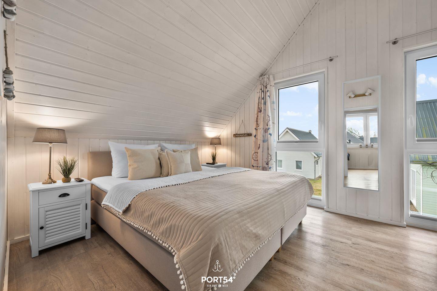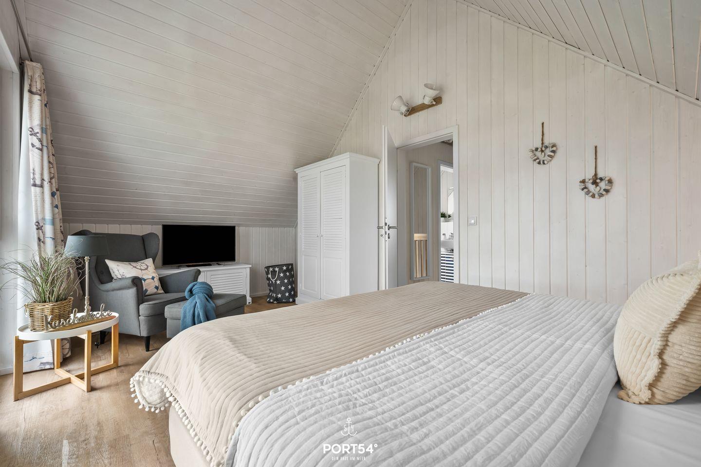 Im ersten Schlafzimmer findest Du ein großes Doppelbett (180x200 cm), einen Kleiderschrank und eine Kommode für viel Stauraum. Insektenschutzgitter und Verdunkelungsmöglichkeiten sorgen für ungestörten Schlaf, während ein Smart-TV für entspannte Abende im Bett bereitsteht.