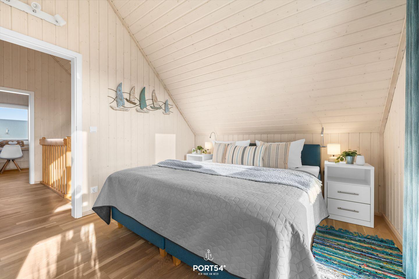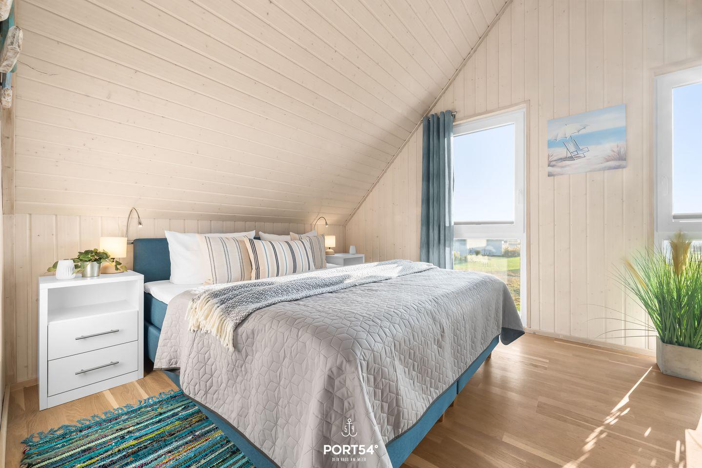 Im ersten Obergeschoss befinden sich die zwei Schlafzimmer. Das eine ist mit einem Doppelbett (180x200 cm) und einem Flachbild-TV ausgestattet, das andere verfügt über zwei Einzelbetten (je 90x200 cm). Beide Schlafzimmer sind jeweils mit einem Kleiderschrank und Verdunkelungsmöglichkeiten ausgestattet.
