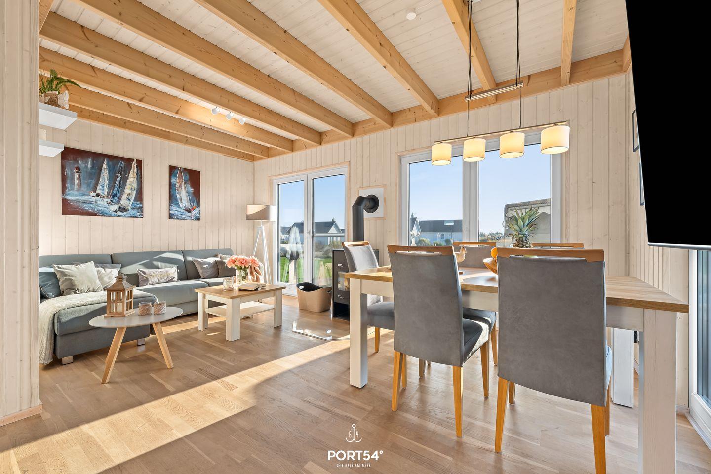 Das Haus verfügt über einen offenen Wohn- und Essbereich mit Kamin, eine voll ausgestattete Küche, zwei Schlafzimmer und zwei Bäder. Das Schlafsofa bietet Dir einen weiteren Schlafplatz, der für ein Kind geeignet ist. Die zwei Schlafzimmer bieten Dir ein Doppelbett und zwei Einzelbetten. Die Bäder verfügen über eine Badewanne, eine Dusche und eine Infrarot-Sauna. Deine Fellnasen kannst Du gerne mitbringen! Vor dem Haus sind zwei PKW-Stellplätze und ein abschließbarer Fahrradschuppen vorhanden.