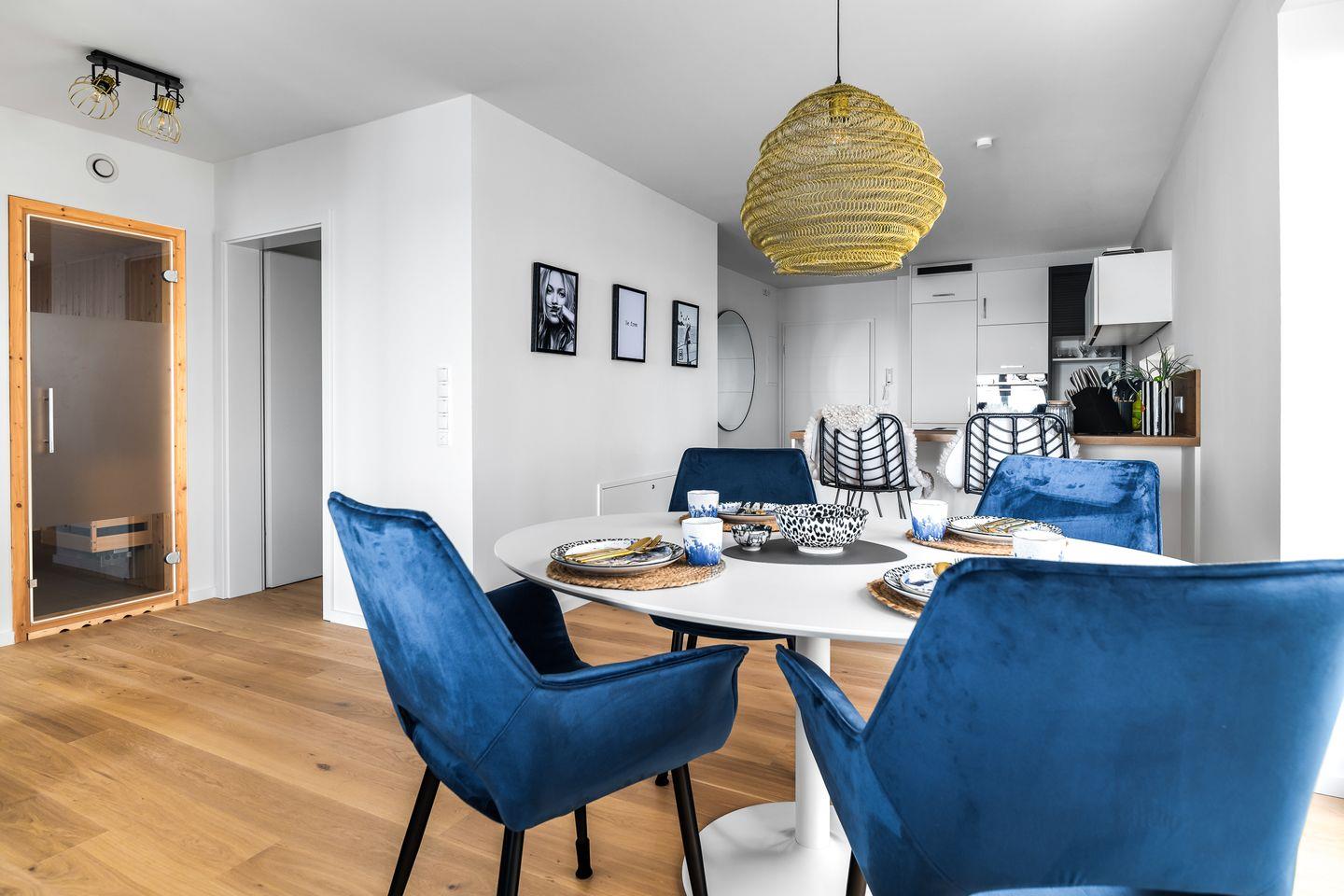 Die Ferienwohnung "Blue Sea" im OstseeResort Olpenitz verzaubert mit stilvoller Einrichtung und traumhaftem Meerblick. Auf 112 m² bietet die Wohnung einen offenen Wohn-Essbereich mit Küche, ideal für gesellige Stunden. Zwei Schlafzimmer, jeweils mit Smart TV und eigenem Bad, garantieren entspannten Schlaf. Eine private Sauna und eine Terrasse mit freiem Blick auf die Ostsee laden zum Entspannen ein. Nur wenige Schritte vom Strand entfernt - optimale Bedingungen für einen perfekten Ostseeurlaub.