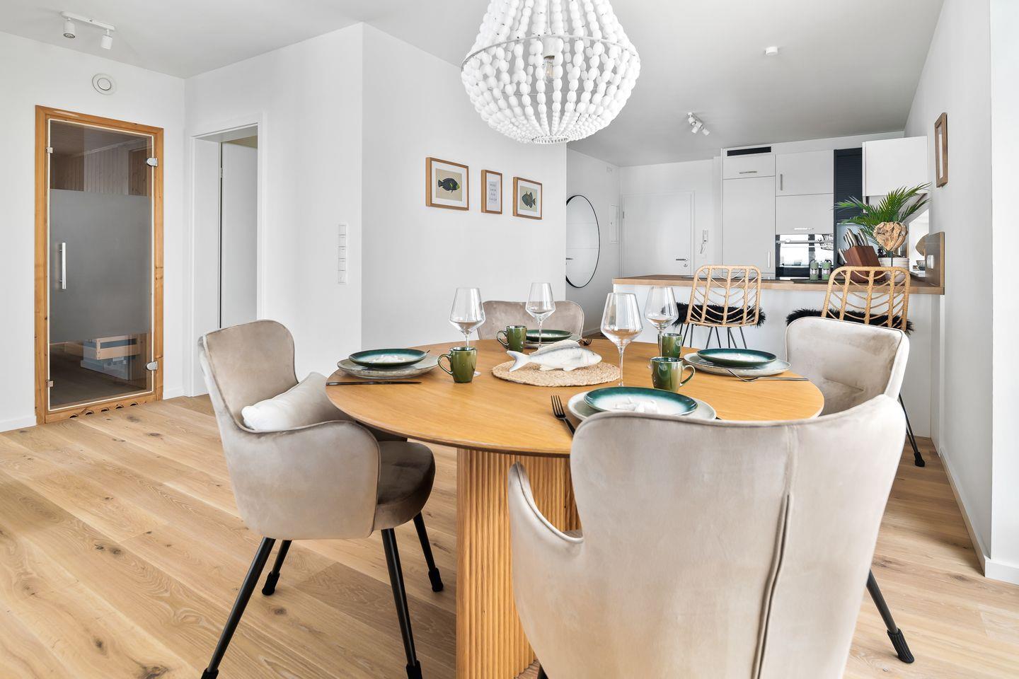 Der großzügige Wohn- und Essbereich ist mit einem weichen Samtsofa und zwei eleganten Sesseln ausgestattet sowie mit einem Kamin, ideal für entspannte Abende mit Blick auf die Ostsee. Die hochwertige Küche mit Frühstückstresen integriert sich nahtlos in den Wohnbereich und macht das Kochen zum Vergnügen. Ein runder Esstisch lädt zu geselligen Stunden ein.