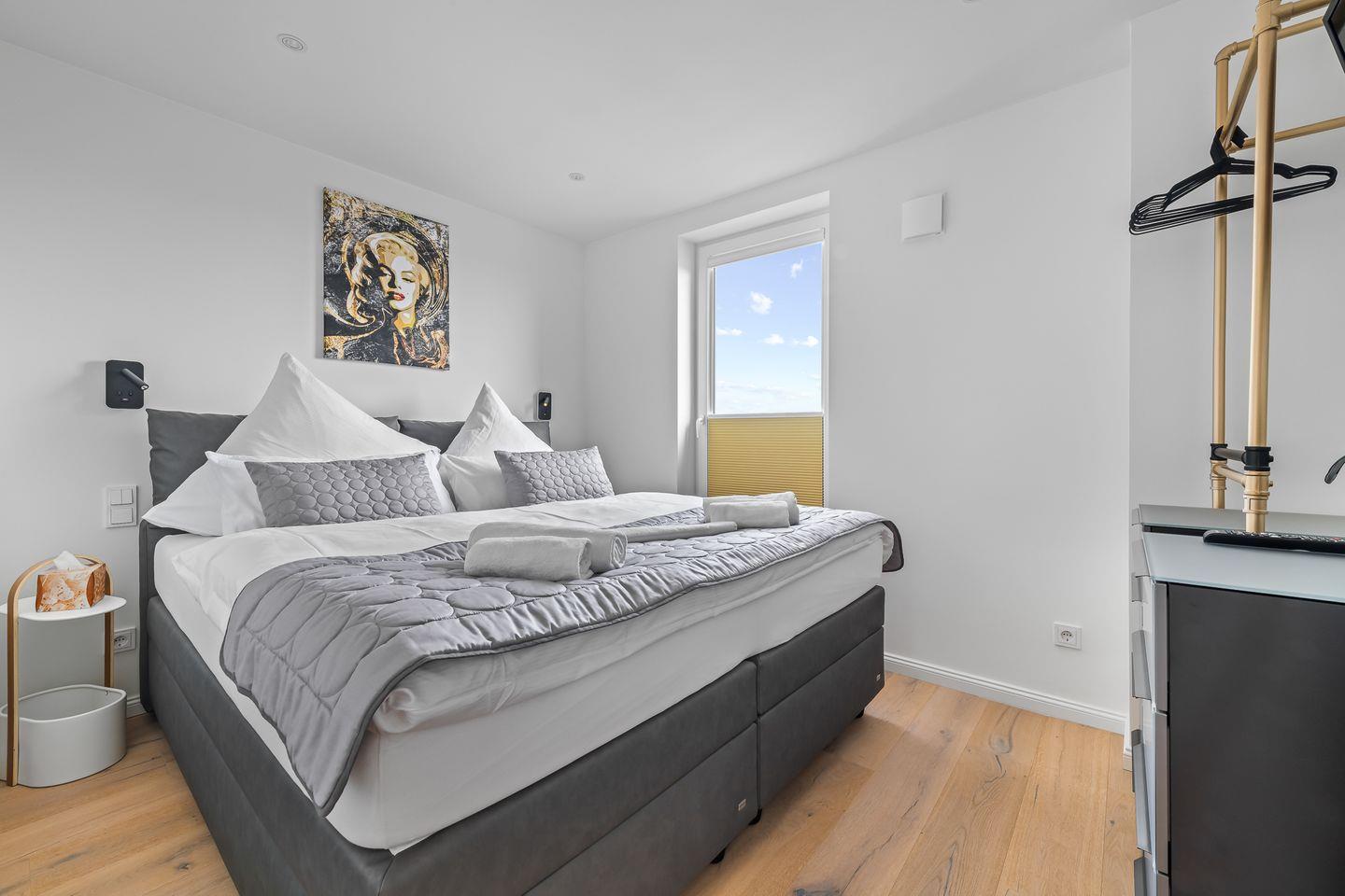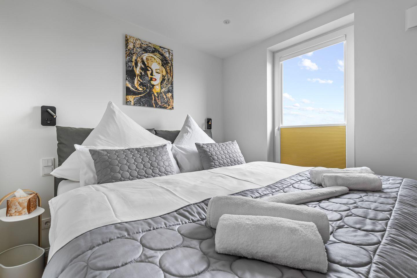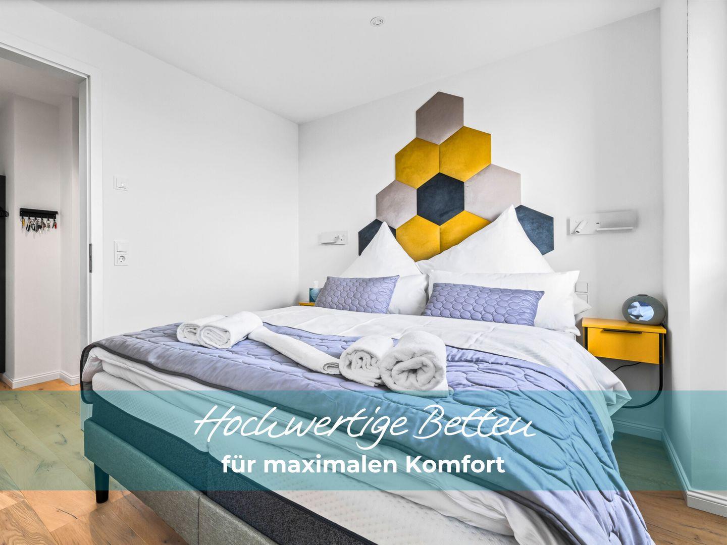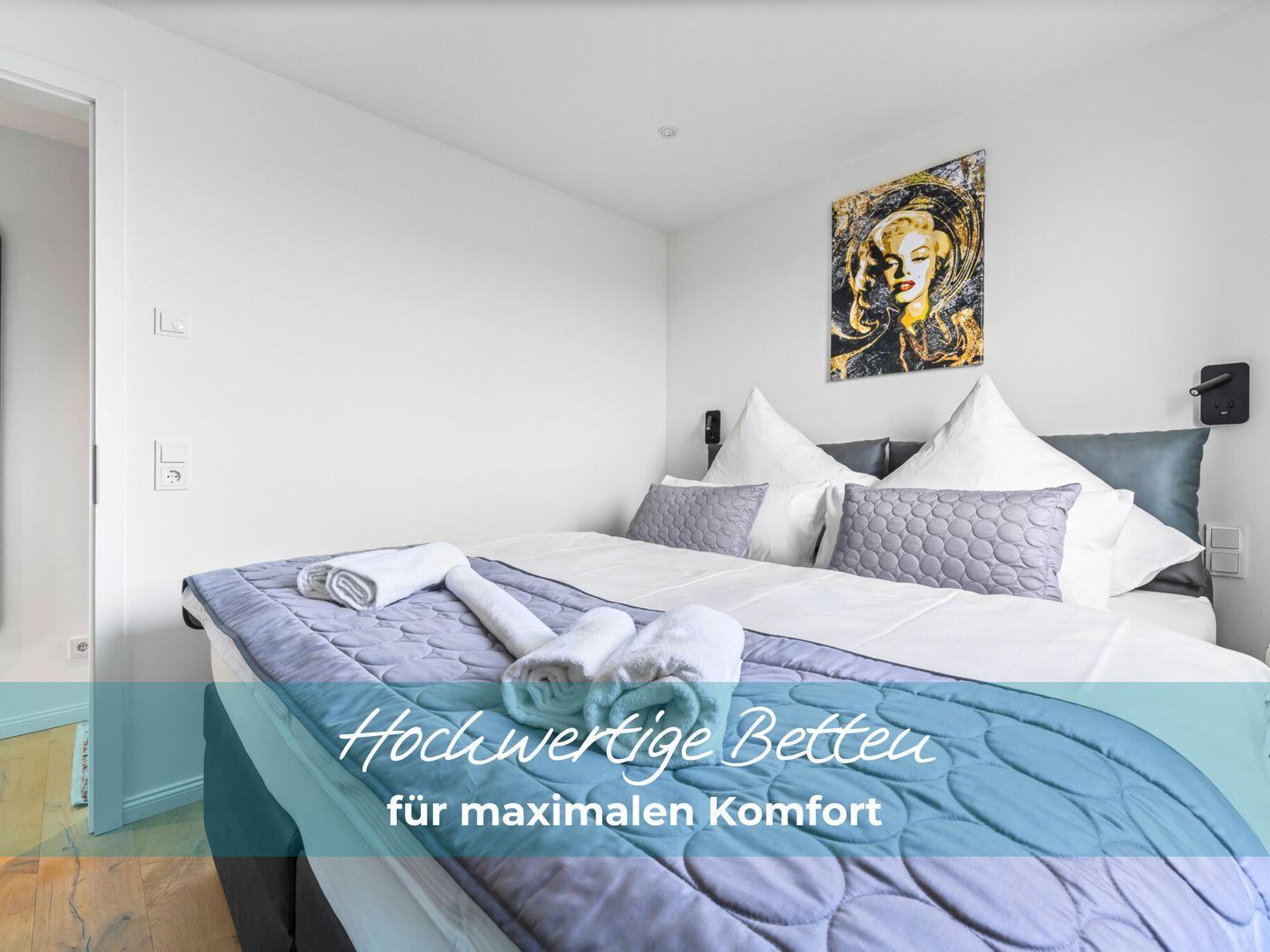 Die beiden Schlafzimmer verfügen über hochwertige Boxspringbetten in Hotelqualität, verschiedene Kissen und allergikerfreundliche Bettwäsche. Im Wohnbereich sorgt eine bequeme Récamiere mit Boxspringmatratze und Topper für einen erholsamen Schlaf. Moderne Plissees ermöglichen eine vollständige Verdunkelung der Wohn- und Schlafbereiche. Beide Schlafzimmer sind mit Fliegengittern ausgestattet.