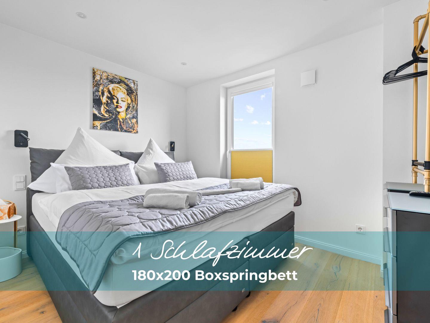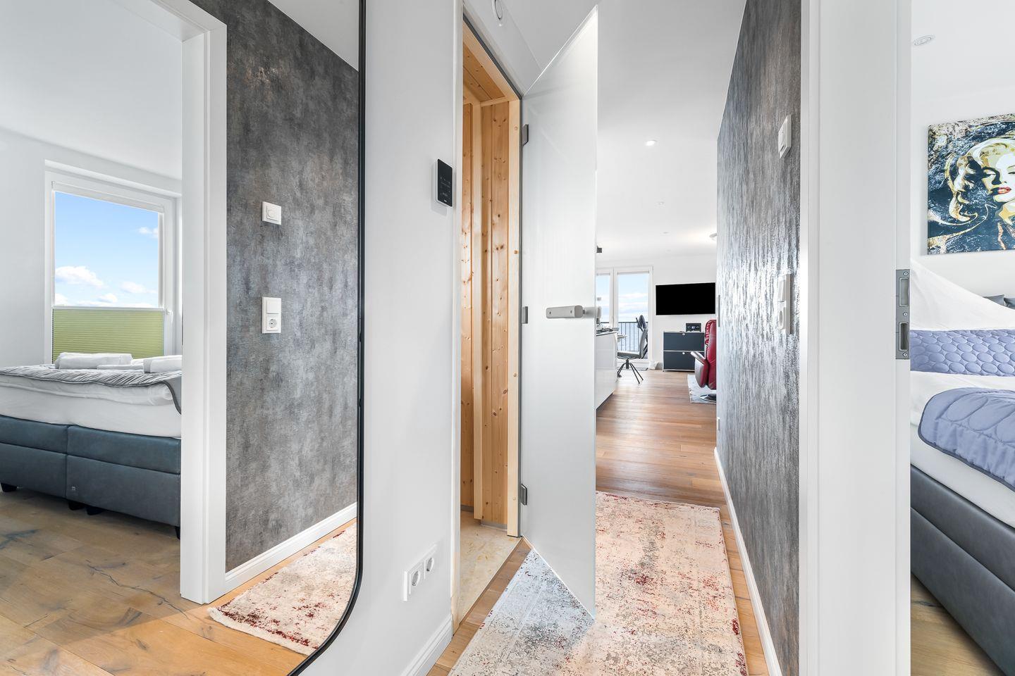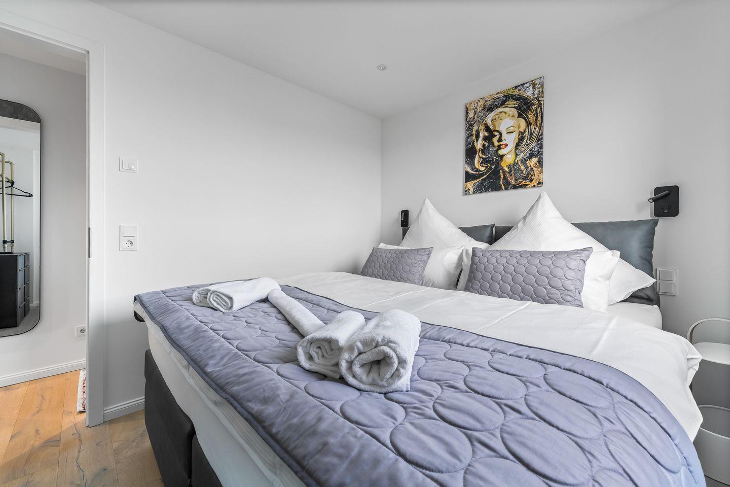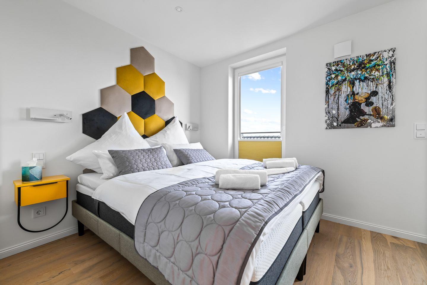 Die beiden Schlafzimmer verfügen über hochwertige Boxspringbetten in Hotelqualität, verschiedene Kissen und allergikerfreundliche Bettwäsche. Im Wohnbereich sorgt eine bequeme Récamiere mit Boxspringmatratze und Topper für einen erholsamen Schlaf. Moderne Plissees ermöglichen eine vollständige Verdunkelung der Wohn- und Schlafbereiche. Beide Schlafzimmer sind mit Fliegengittern ausgestattet.