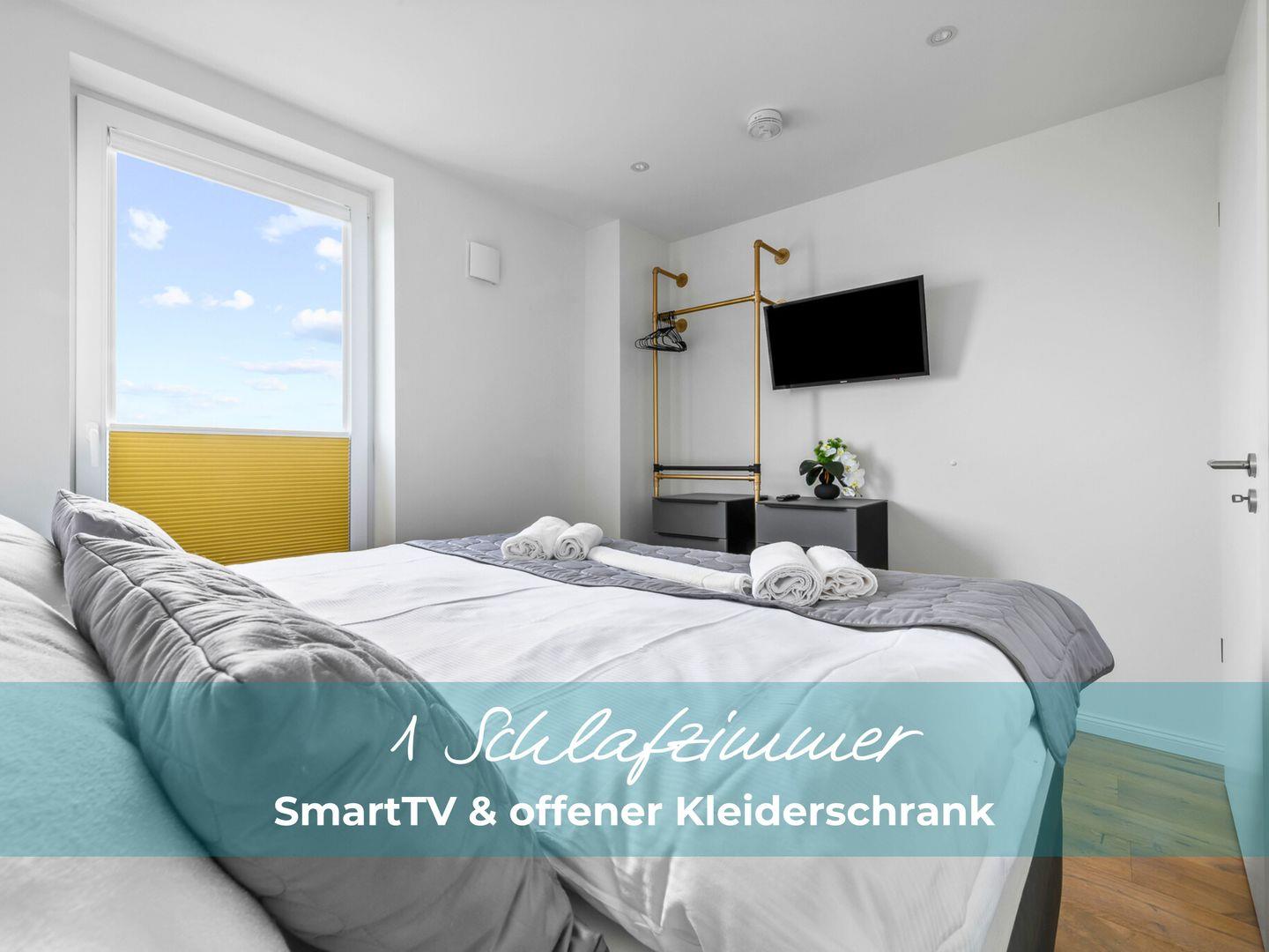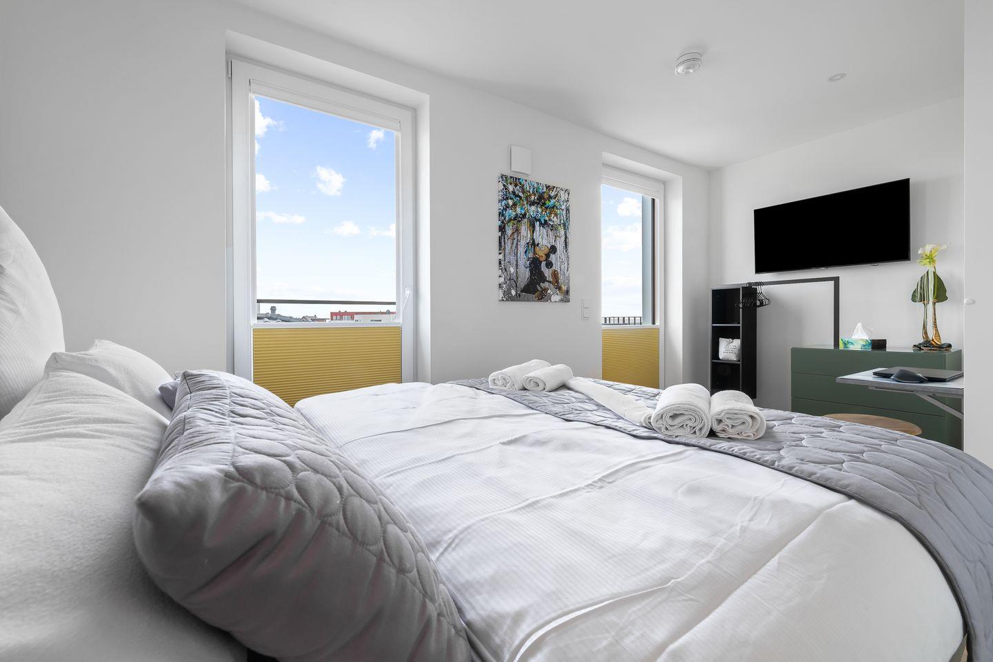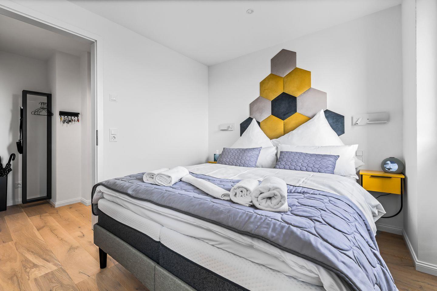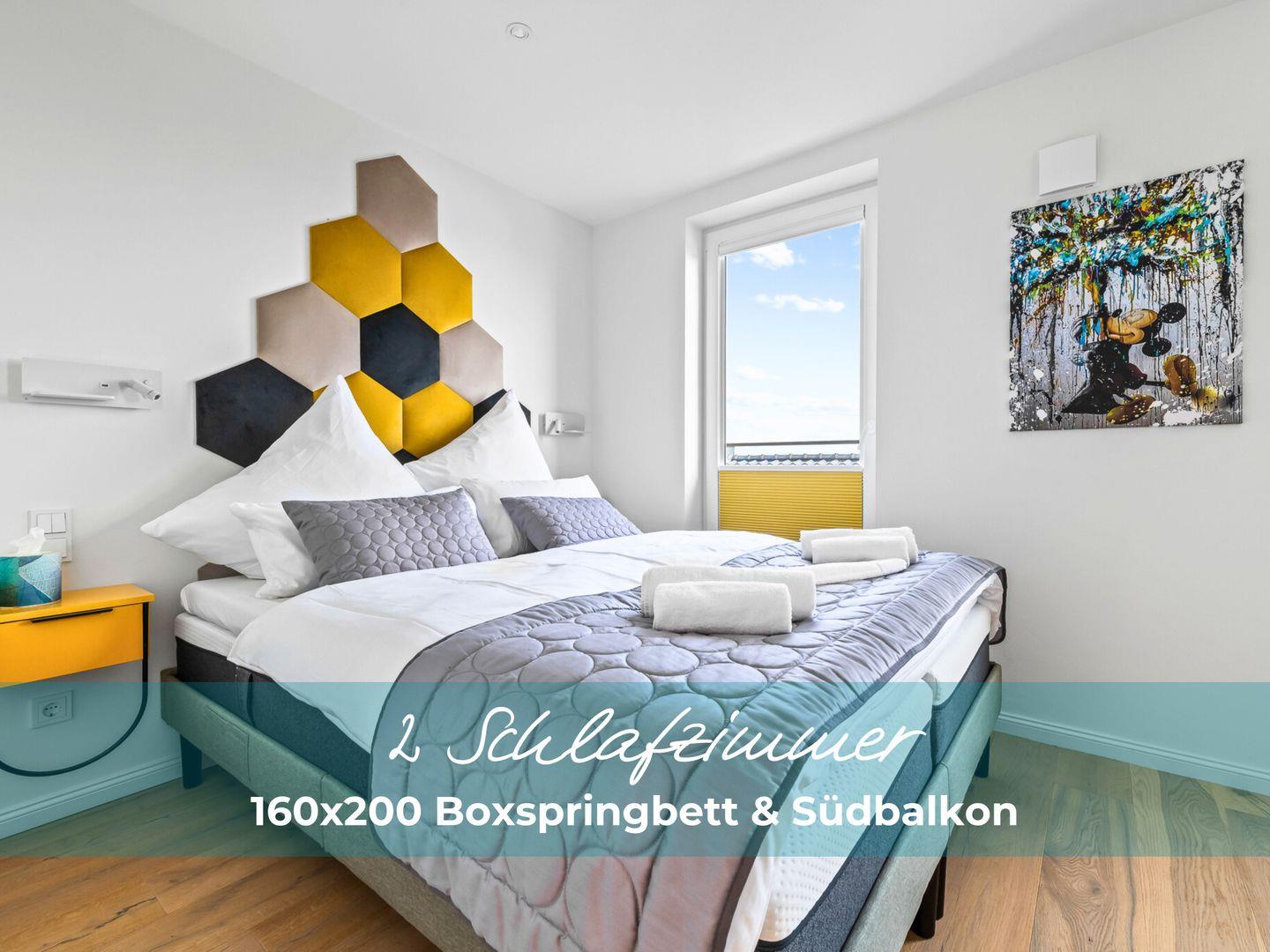 Die beiden Schlafzimmer verfügen über hochwertige Boxspringbetten in Hotelqualität, verschiedene Kissen und allergikerfreundliche Bettwäsche. Im Wohnbereich sorgt eine bequeme Récamiere mit Boxspringmatratze und Topper für einen erholsamen Schlaf. Moderne Plissees ermöglichen eine vollständige Verdunkelung der Wohn- und Schlafbereiche. Beide Schlafzimmer sind mit Fliegengittern ausgestattet.