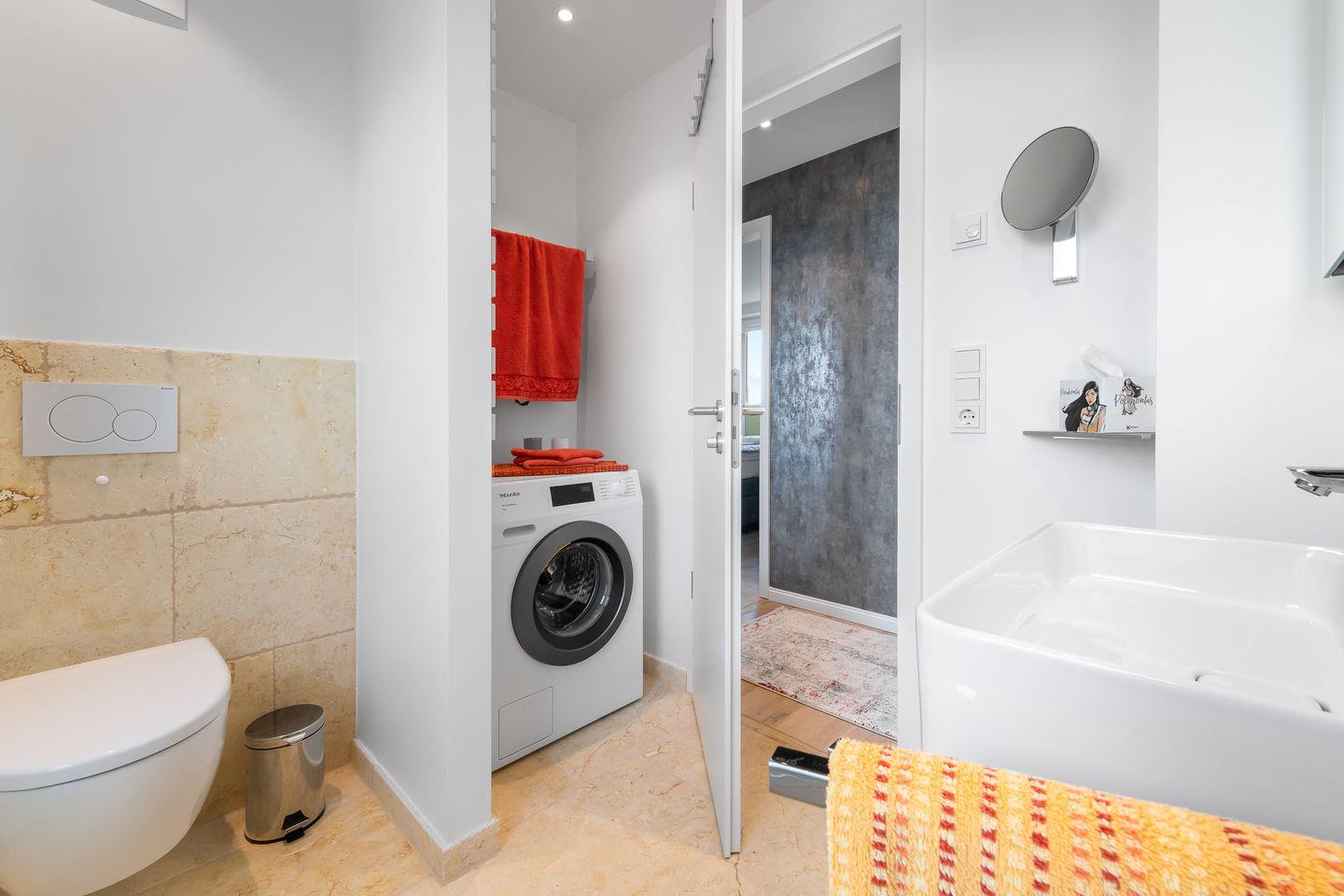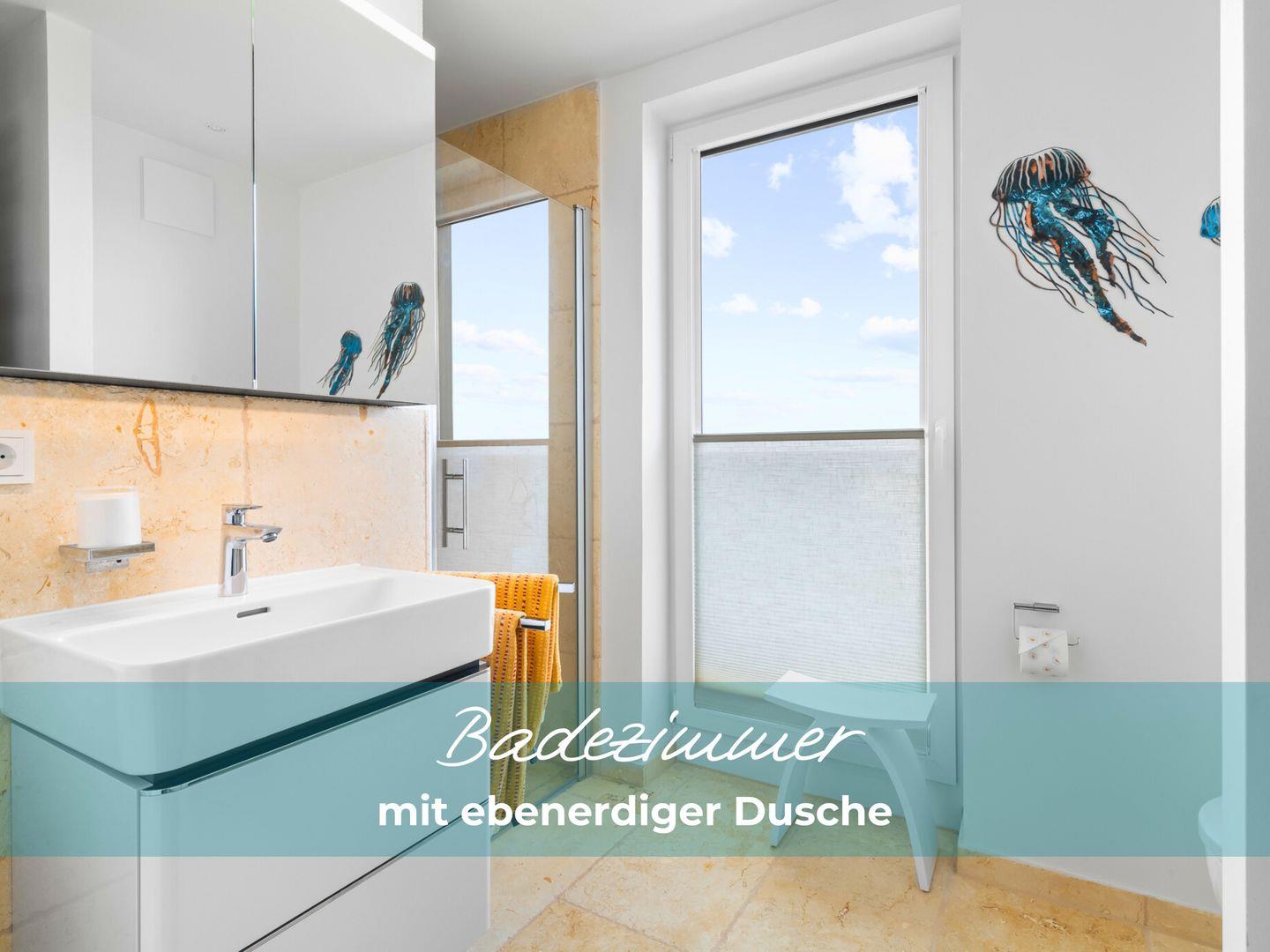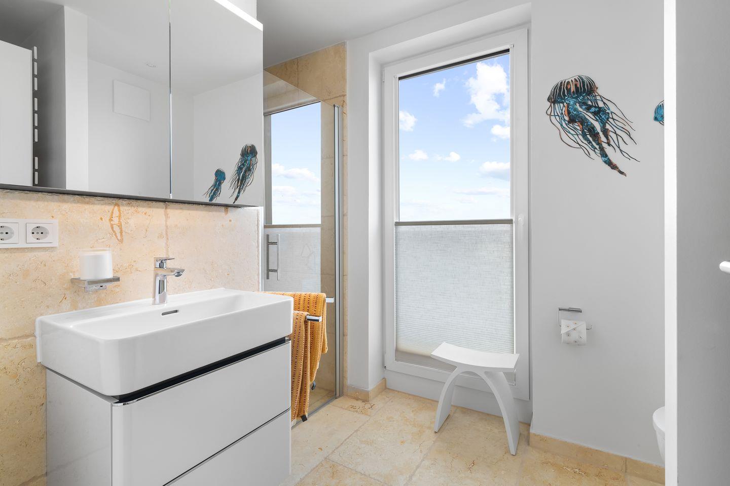 Das Badezimmer mit Meerblick erwartet Sie mit einer großzügigen bodentiefen Dusche, einem Waschtisch mit Unterschrank, einem geräumigen Spiegelschrank, WC, Sichtschutzplissees, Waschmaschine, Handtuchheizkörper und edlen Jura-Marmorfliesen. Die Fußbodenheizung sorgt für angenehme Wärme.