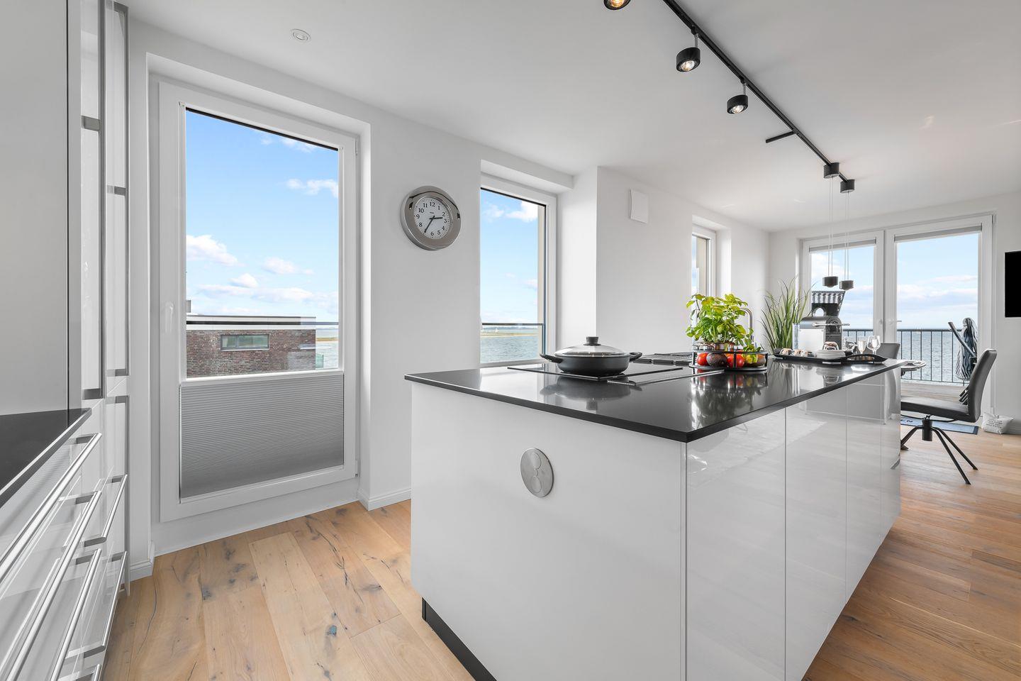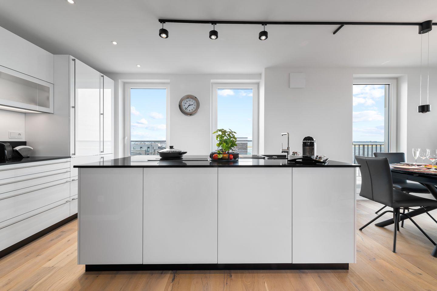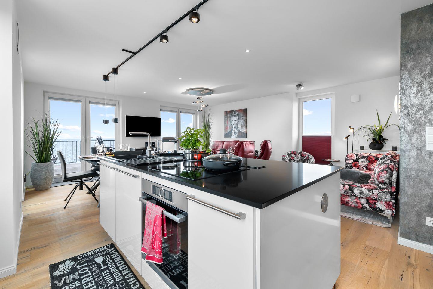 Entspannen Sie in bequemen Relax-Sesseln, genießen Sie Mahlzeiten in der gemütlichen Essecke oder zaubern Sie kulinarische Köstlichkeiten in der offenen Profiküche. Die bodentiefen Fenster bieten Ihnen einen atemberaubenden Blick auf die Ostsee, Schleimünde, Olpenitz-Strand und den Hafen.