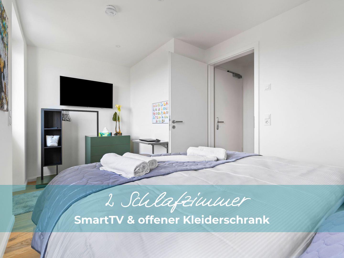 Drei Smart-TVs im Wohnzimmer und den Schlafzimmern bieten Zugang zu verschiedenen Streaming-Diensten wie MAGENTA und YouTube. Kostenloses Highspeed-WLAN steht Ihnen zur Verfügung. Vor dem Haus befindet sich ein Parkplatz mit einer Wallbox zum Laden Ihres Elektroautos.