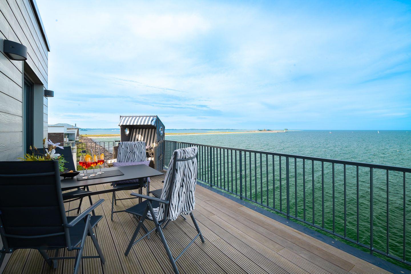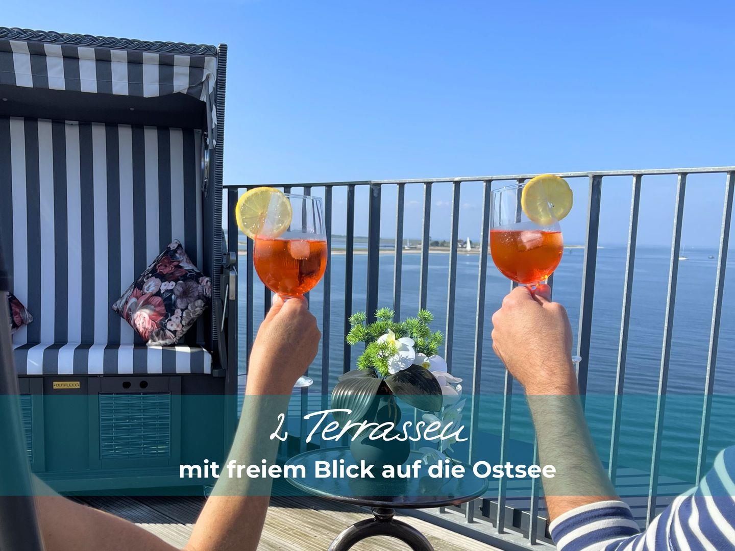 Das herausragende Merkmal des Apartments ist zweifellos die großzügige Terrassenfläche von insgesamt 90 qm. Besonders beeindruckend ist die 50 qm große Dachterrasse, die über eine Außentreppe erreichbar ist. Von hier aus genießen Sie einen unvergleichlichen Blick auf die Ostsee und die Schlei auf der einen Seite sowie auf die Marina des Ostseeresorts auf der anderen Seite. Komfortable Gartenmöbel und zwei Doppelstrandkörbe laden dazu ein, sich zu entspannen, die Sonne zu genießen und die Umgebung zu beobachten.