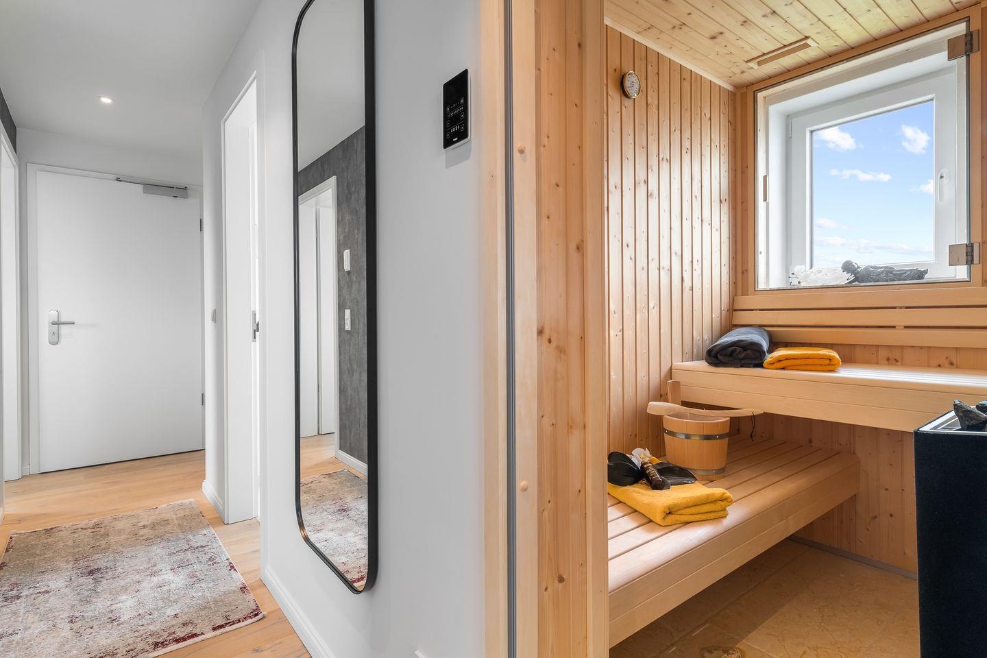 Genieße die exklusive Penthaus-Wohnung "Sea Point", im Ostseeresort Olpenitz, mit 115qm und freiem Blick auf die Ostsee. Ideal für bis zu 5 Personen, mit Aufzug und einer großen Dachterrasse. Entspanne in luxuriösen Boxspringbetten, koche in einer Profiküche und genießen den Meerblick durch bodentiefe Fenster. Das Apartment bietet hochwertige Technik inklusive Sauna und smarten TVs. Nur wenige Schritte von der Olpenitz Badebucht entfernt, mit privatem Parkplatz und Elektroauto-Lademöglichkeit.