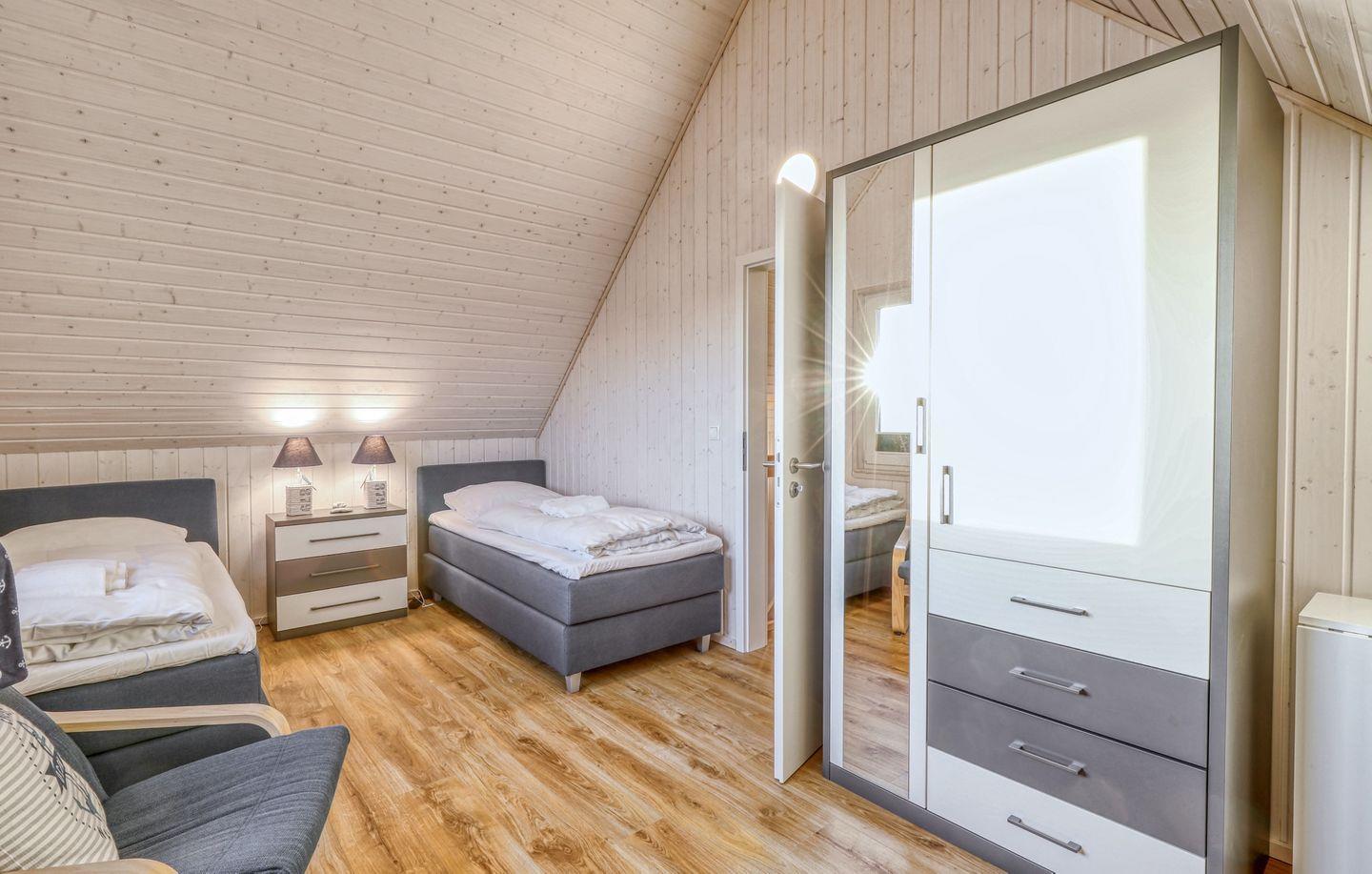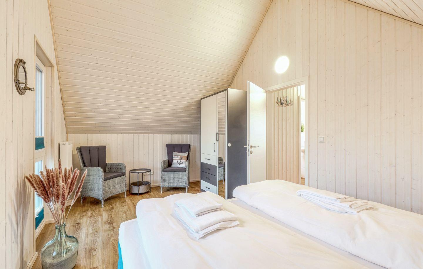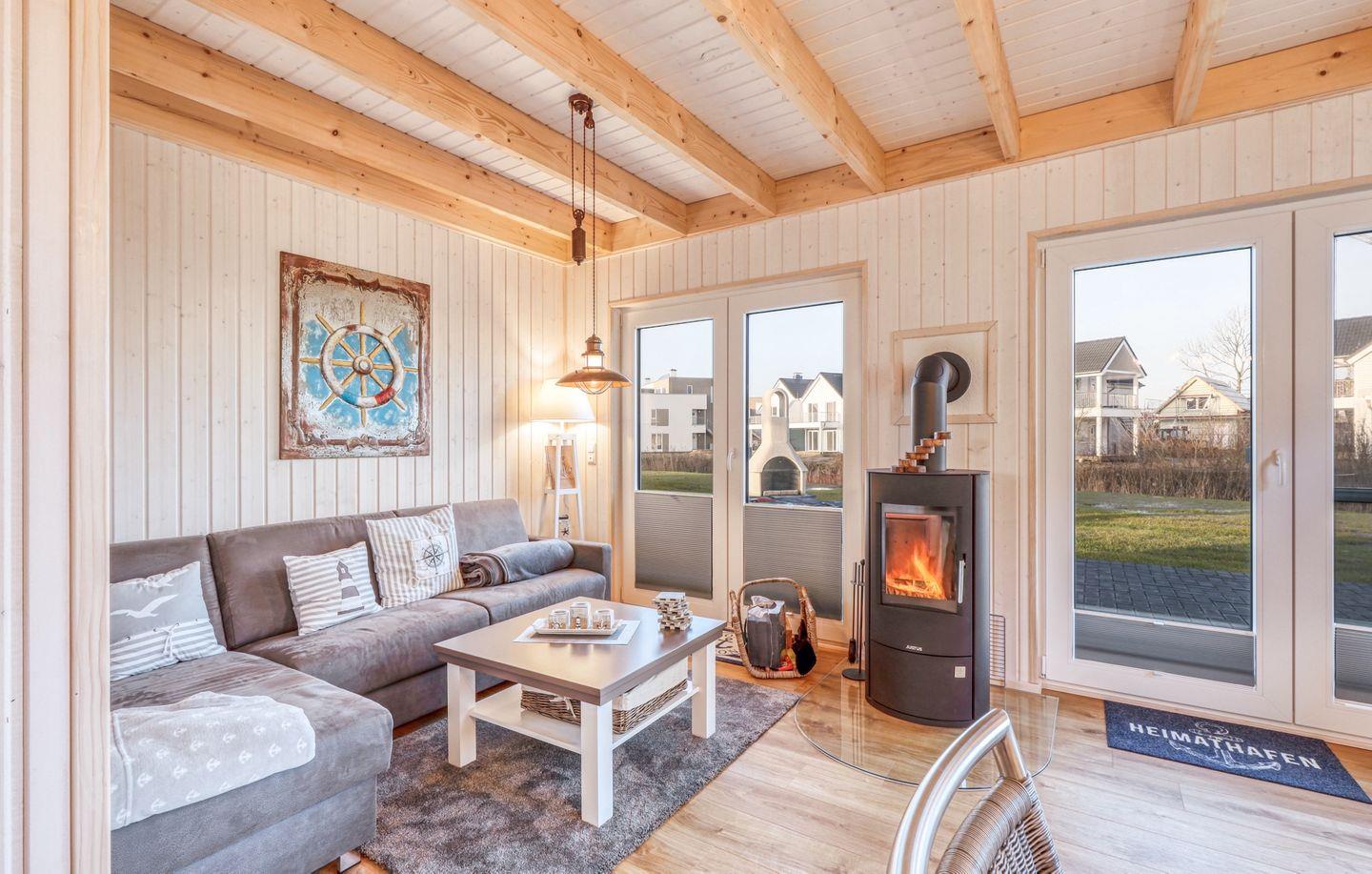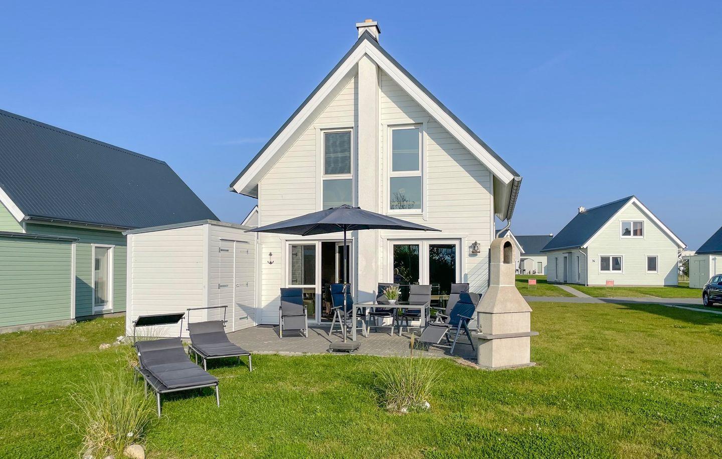 Willkommen in "Störtebekers Koje". Dieses freistehende Ferienhaus mit 80m² bietet Ihnen den perfekten Rückzugsort für unvergessliche Urlaubstage. Im Untergeschoss erwartet Sie ein offener Wohn- und Essbereich, der mit Liebe zum Detail eingerichtet wurde. Bodentiefe Fenster sorgen für eine helle und freundliche Atmosphäre. Im Wohnbereich empfängt Sie ein gemütliches Sofa, welches Sie zudem als Schlafsofa (140x200cm) nutzen können, ideal für zusätzliche Gäste. An kühlen Abenden können Sie es sich vor dem knisternden Kamin gemütlich machen und Ihre Lieblingsserie auf dem Flachbild-TV schauen. Die voll ausgestattete Küche lässt keine Wünsche offen – mit Spülmaschine, Mikrowelle, Ceranfeld und Waschmaschine sind Sie bestens gerüstet. Das großzügige Bad ist ein Highlight: Hier finden Sie eine Infrarotkabine, eine ebenerdige Dusche und eine Handtuchheizung, die für zusätzlichen Komfort sorgt. Im Obergeschoss erwarten Sie zwei geschmackvoll eingerichtete Schlafzimmer. Das erste Schlafzimmer verfügt über ein gemütliches Boxspringbett (180x 200cm), einen Schrank und zwei bequeme Sessel, die sich perfekt als Leseecke eignen. Das zweite Schlafzimmer ist mit zwei Einzelbetten (90x200cm), einem Schrank, einer Kommode und einem Flachbild-TV ausgestattet. Beide Schlafzimmer bieten Insektenschutz und eine Verdunkelungsmöglichkeit, sodass einem erholsamen Schlaf nichts im Wege steht. Für unsere kleinen Gäste wird ein Kinderreisebett und ein Kinderhochstuhl vorgehalten. Genießen Sie die frische Luft auf der Terrasse, die mit bequemen Outdoormöbeln, einem Sonnenschirm und zwei Sonnenliegen ausgestattet ist. Ein Holzkohlegrill lädt zu geselligen Grillabenden ein, während Strandspiele und ein Roller für zusätzlichen Spaß sorgen. Für Ihre Fahrräder steht ein abschließbarer Fahrradschuppen zur Verfügung, und ein eigener Parkplatz direkt vor dem Haus rundet das Angebot ab. Erleben Sie unvergessliche Momente in diesem charmanten Ferienhaus – Ihr perfekter Ort für Erholung und Abenteuer!