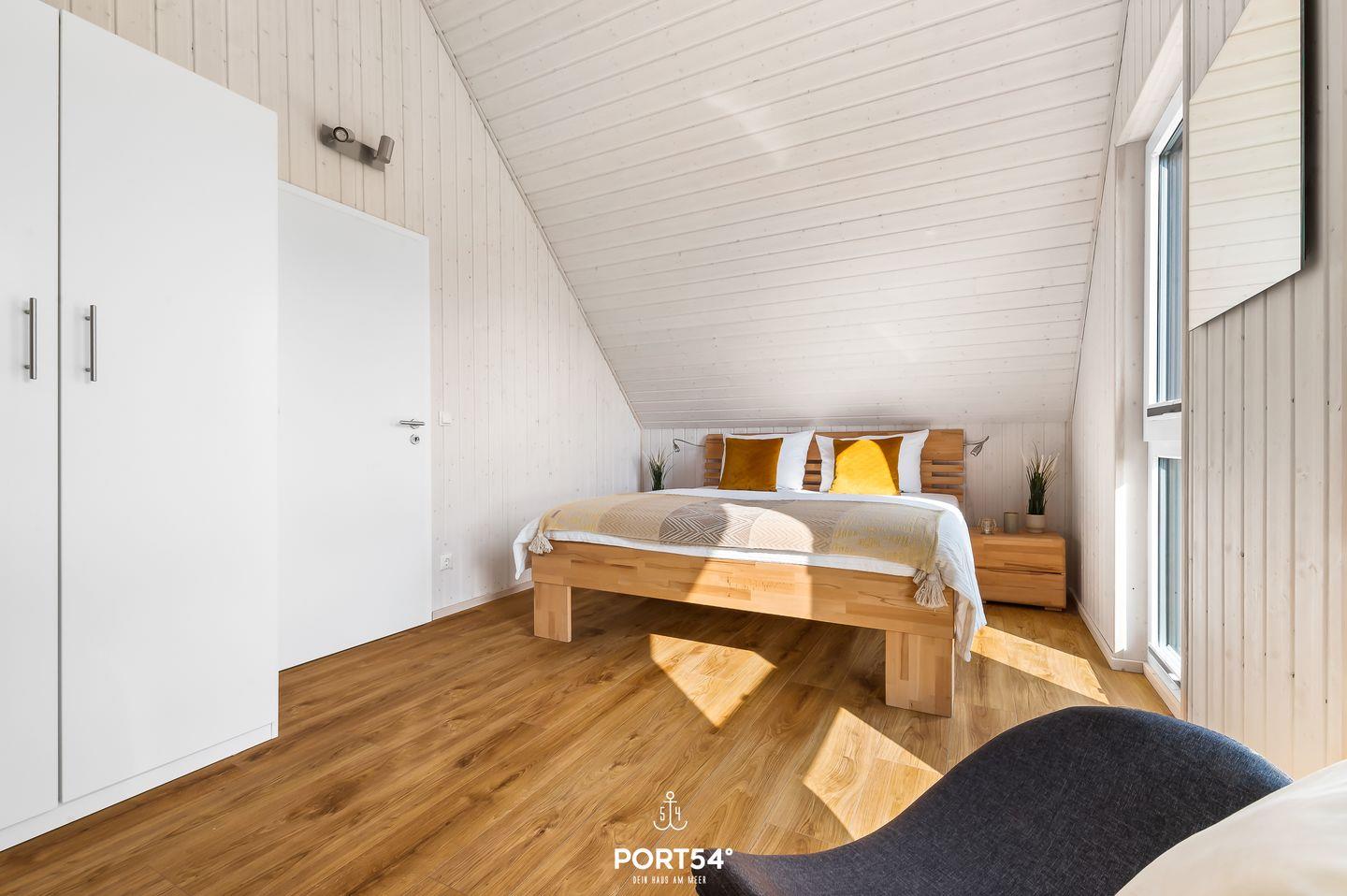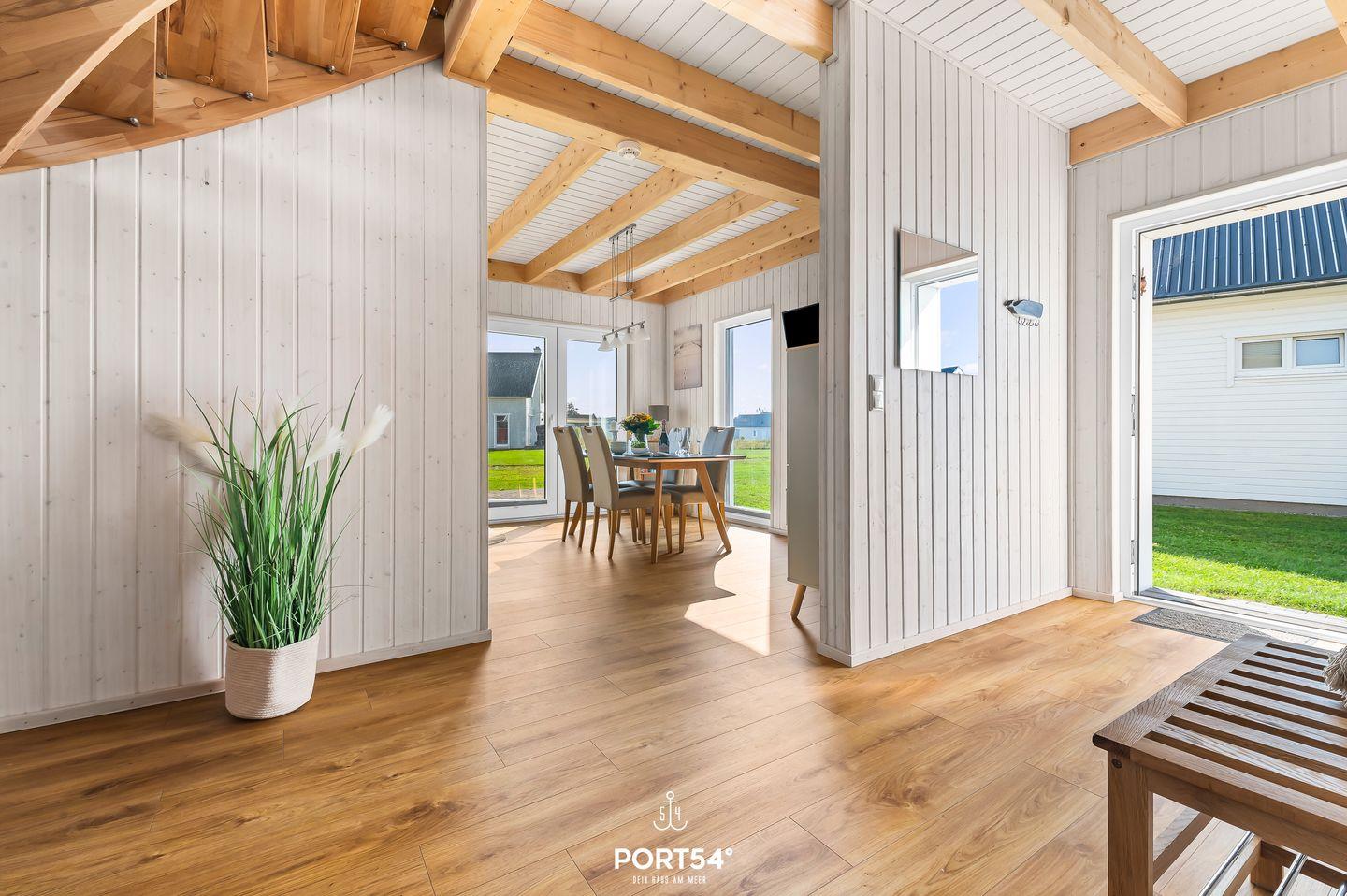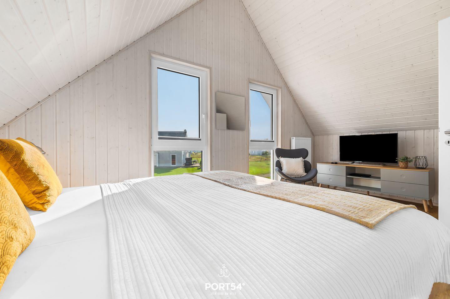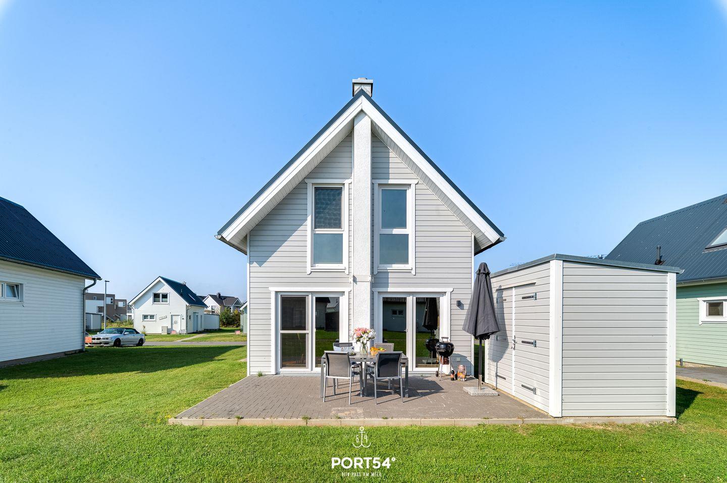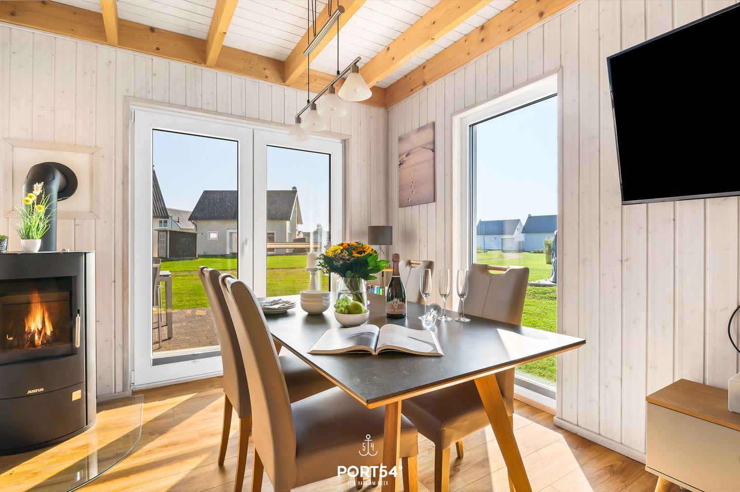Auf 82m² erwartet Sie ein freistehendes Haus mit lichtdurchflutetem Wohn- und Essbereich, gemütlicher Couch und Kamin. Die Küche ist voll ausgestattet. Das großzügige Badezimmer hat eine Dusche und eine Infrarot-Sauna. Im Obergeschoss finden Sie zwei Schlafzimmer: eines mit Doppelbett (180x200cm) und Smart-TV, das andere mit zwei Einzelbetten (90x200cm). Genießen Sie die ca. 25m² große Terrasse mit Outdoormöbeln und Grill. Ein Fahrradschuppen und Parkplatz runden das Angebot ab.