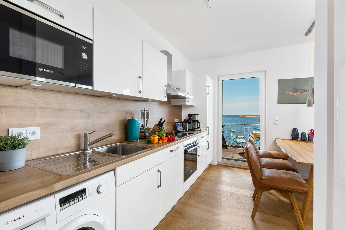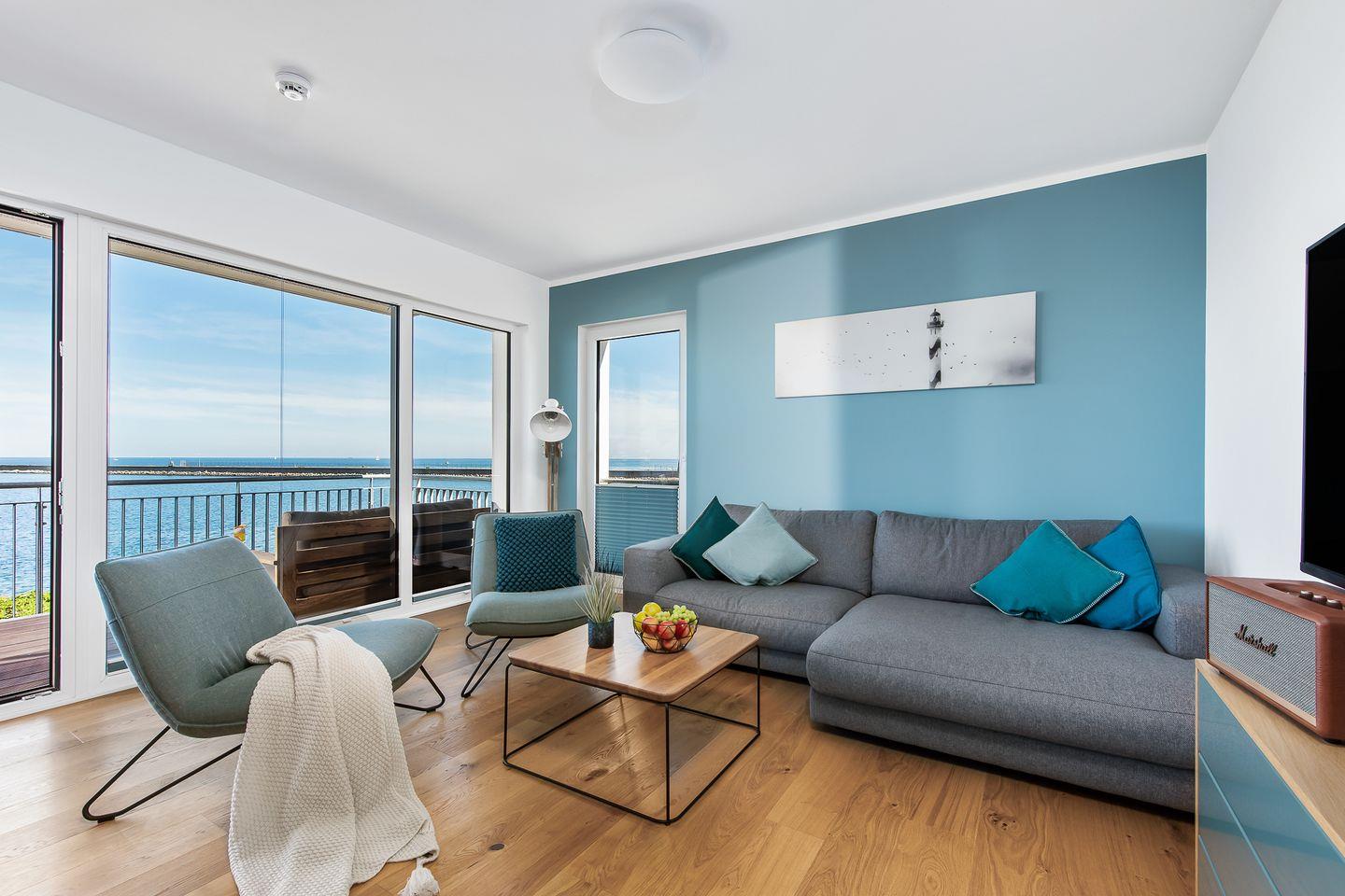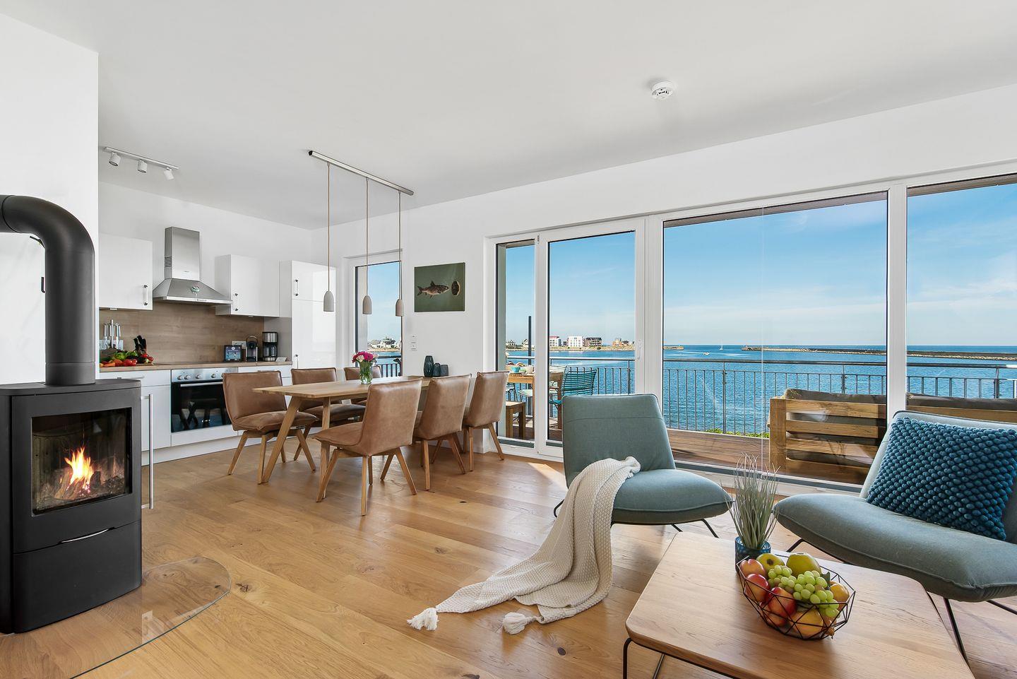 Direkt an der Ostsee gelegen, mit einem traumhaften Weitblick auf die freie Ostsee, bietet die Ferienwohnung "Perlentaucher" auf ca. 98m² Platz für 6 Personen. Vom Wohn- und Essbereich aus, mit bodentiefen Fenstern, haben Sie Zugang zum Herzstück dieser Ferienwohnung: den großen Balkon mit einem unvergesslichen Blick auf die freie Ostsee und die Hafeneinfahrt. Bestaunen Sie die Segelboote und genießen Sie die einzigartige Panoramasicht. Erholen Sie sich an kälteren Tagen auf dem Sofa mit der wohligen Wärme des gemütlichen Kaminofens und schauen Sie auf dem Flachbild-Fernseher Ihre Lieblingsserie. Die hochwertig ausgestattete Küche mit Meerblick ist offen zum Wohn- und Essbereich gestaltet und lädt zu gemeinsamen Kochabenden ein. Diese Ferienwohnung verfügt über zwei komfortable Doppelschlafzimmer mit Boxspringbetten (180x200cm), Kleiderschränken und Verdunkelungsmöglichkeiten, eines mit TV und eines mit Wasserblick. Das dritte Schlafzimmer sorgt mit zwei Einzelbetten (90x200cm) für Entspannung. Beide Badezimmer bieten ausreichend Platz, eine ebenerdige Dusche, einen Handtuchtrockner und einen großen Spiegel. Genießen Sie Ihr Frühstück auf den gemütlichen Gartenmöbeln bei Sonnenaufgang oder verbringen Sie gesellige Grillabende bei einem kühlen Getränk. Für die kleinen Gäste ist bestens gesorgt: Ein Kinderreisebett, ein Kinderhochstuhl und ein praktischer Kindertritthocker im Bad stehen bereit. Ein kostenfreier Parkplatz für ein Fahrzeug steht in der Tiefgarage zur Verfügung, ebenso wie ein gemeinschaftlicher abschließbarer Fahrradschuppen für Ihre Fahrräder.