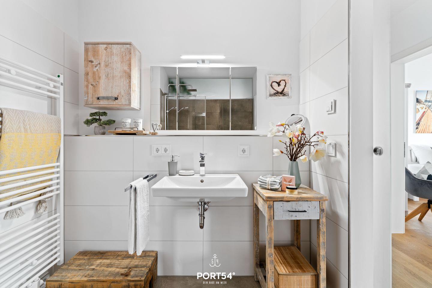 Das 2. Bad mit ebener Dusche, WC und Waschbecken hat eine Milchglastür, sodass Sie auch hier Tageslicht haben. Die Deckenlampe lässt einen blauen Himmel mit Schäfchenwölkchen sehen- ein wenig Illusion muss sein.