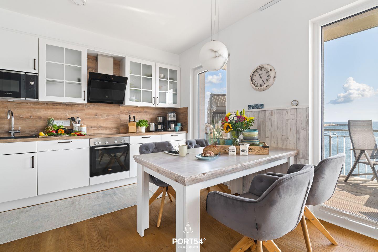 Luxus mit Seel, so lautet das Motto dieses außergewöhnlichen Apartments. Und genauso empfinden wir es. Dieses sehr exklusive Apartment ist direkt an der Ostseeküste gelegen. Aus dem 3. Stock schauen Sie Richtung Sonnenaufgang. Und wie die Natur das so möchte, geht die Sonne im Winter etwas weiter links der Hafeneinfahrt und im Sommer etwas rechts der Hafeneinfahrt auf. Durch die zwei Leuchtfeuer der Hafeneinfahrt fahren je nach Jahreszeit die Segler und Fischer und auch mal die Küstenwache. Mit unserem Fernglas können Sie das wunderbar beobachten. Aus jedem Zimmer ist dieser Blick gegeben.