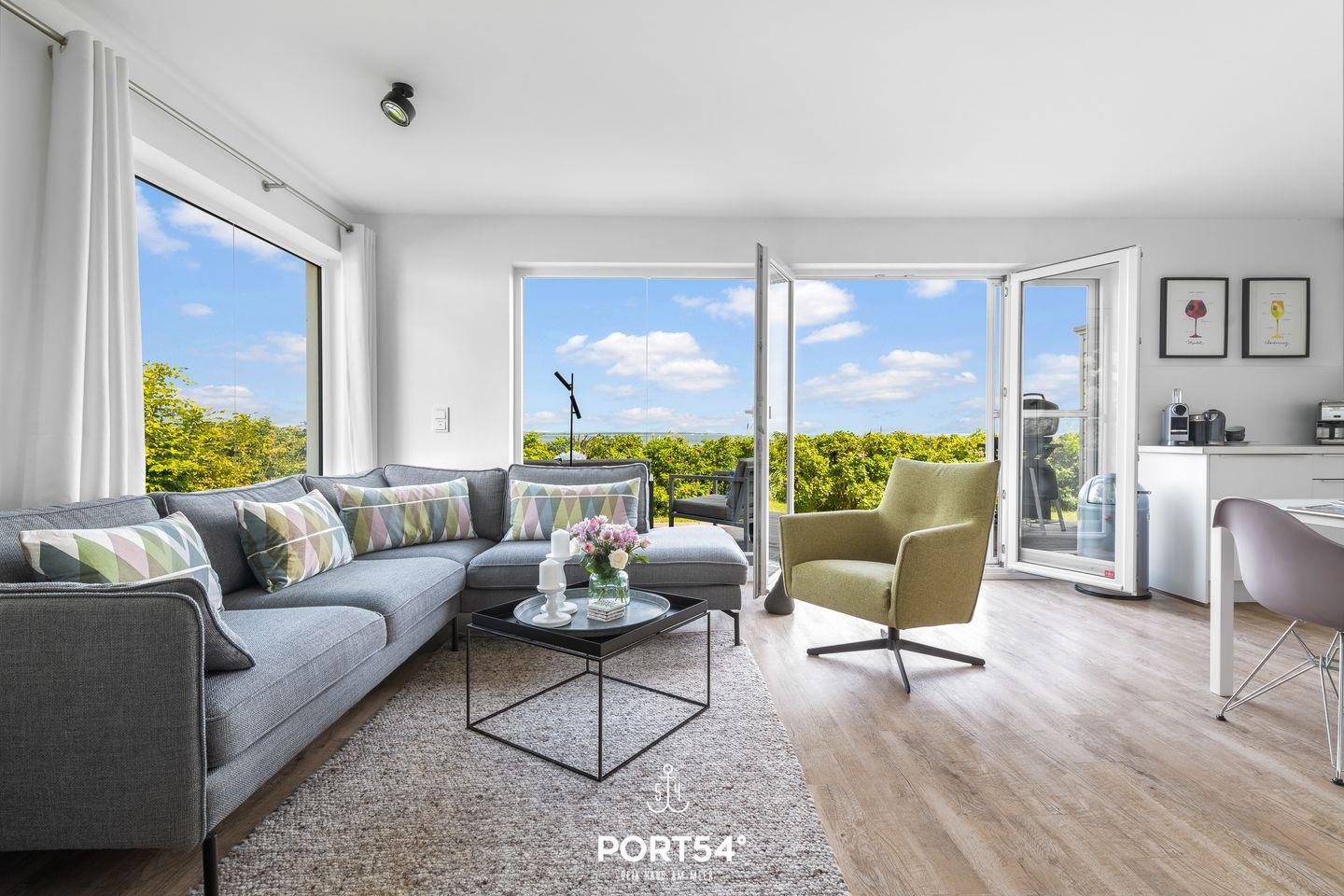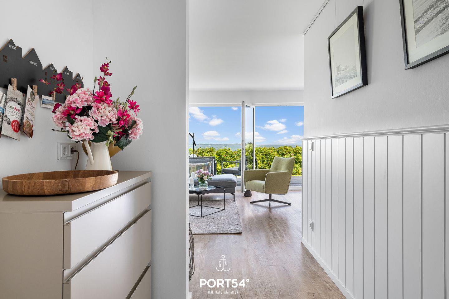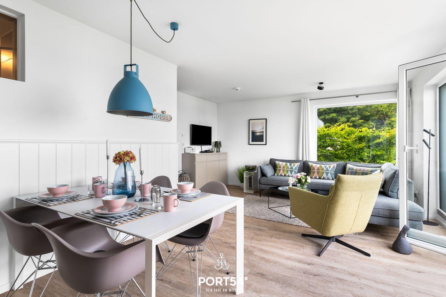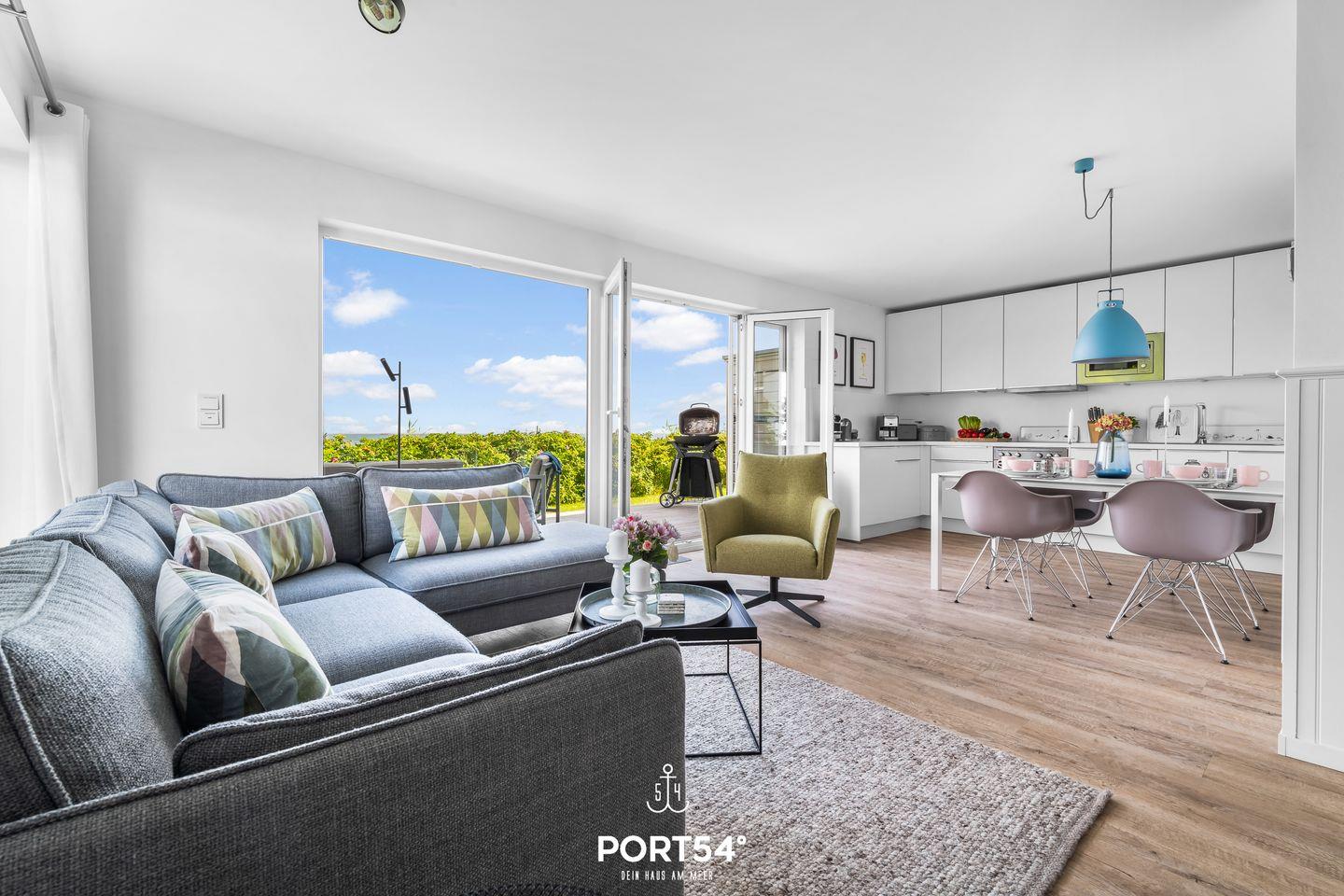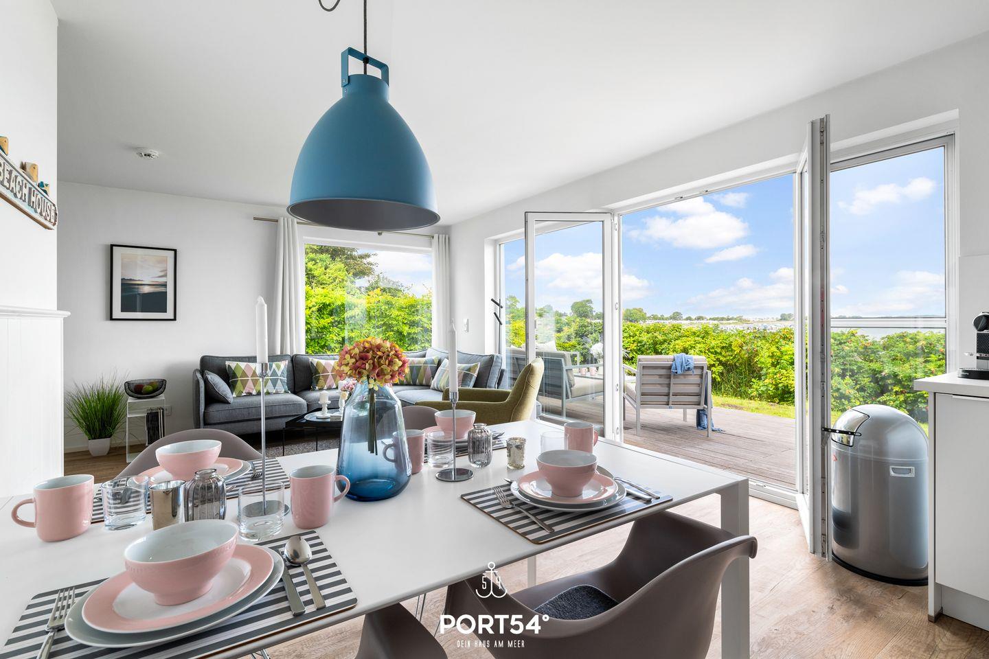 Vom Flur aus gelangst Du ebenfalls zu dem gemütlichen und offenen Wohn- und Essbereich. Von hier aus hast Du einen fantastischen Ausblick auf die Schlei und die Schleimündung. Genieße einen spannenden Film auf dem Sofa, oder verbringe gemeinsame Spieleabende am Esstisch.