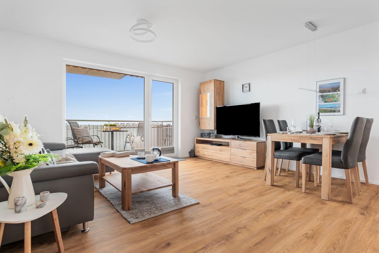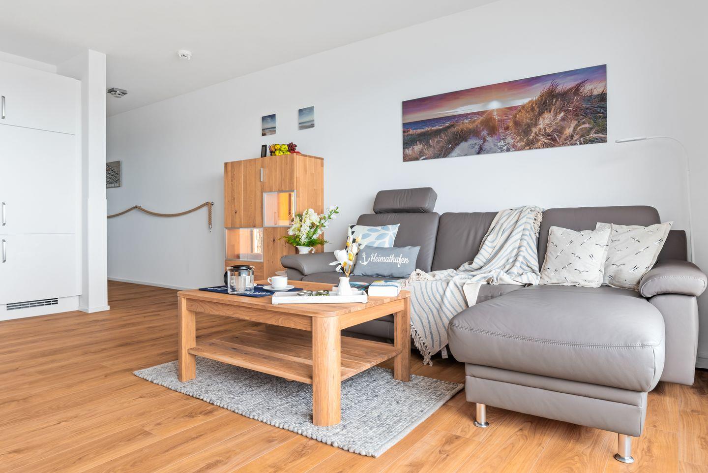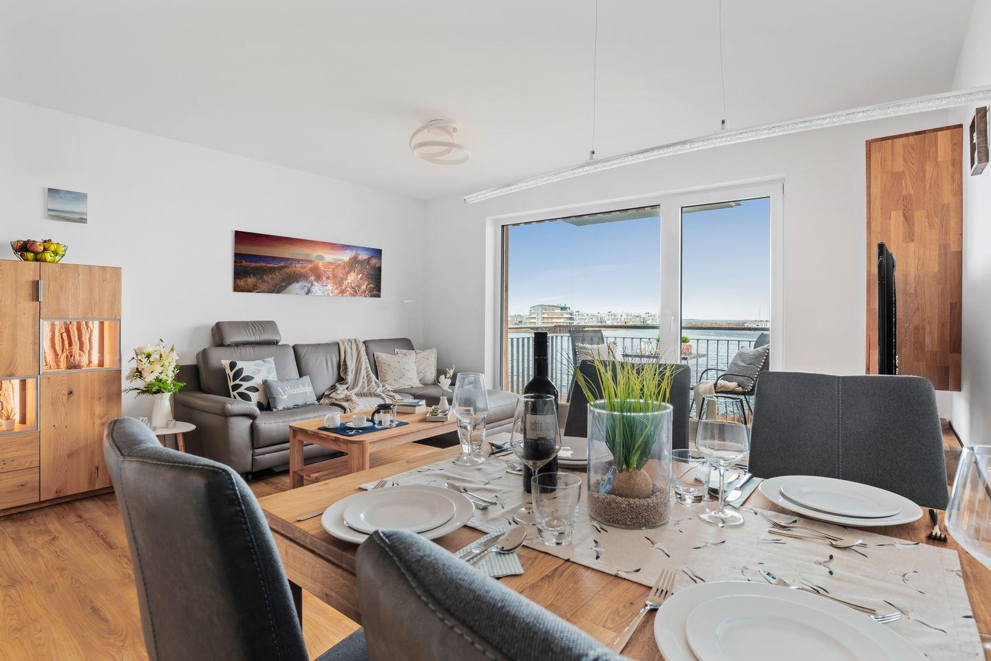 Entspanne Dich bei einem unterhaltsamen Film auf dem Sofa und genieße den grandiosen Ausblick auf das Hafenbecken des OstseeResorts.