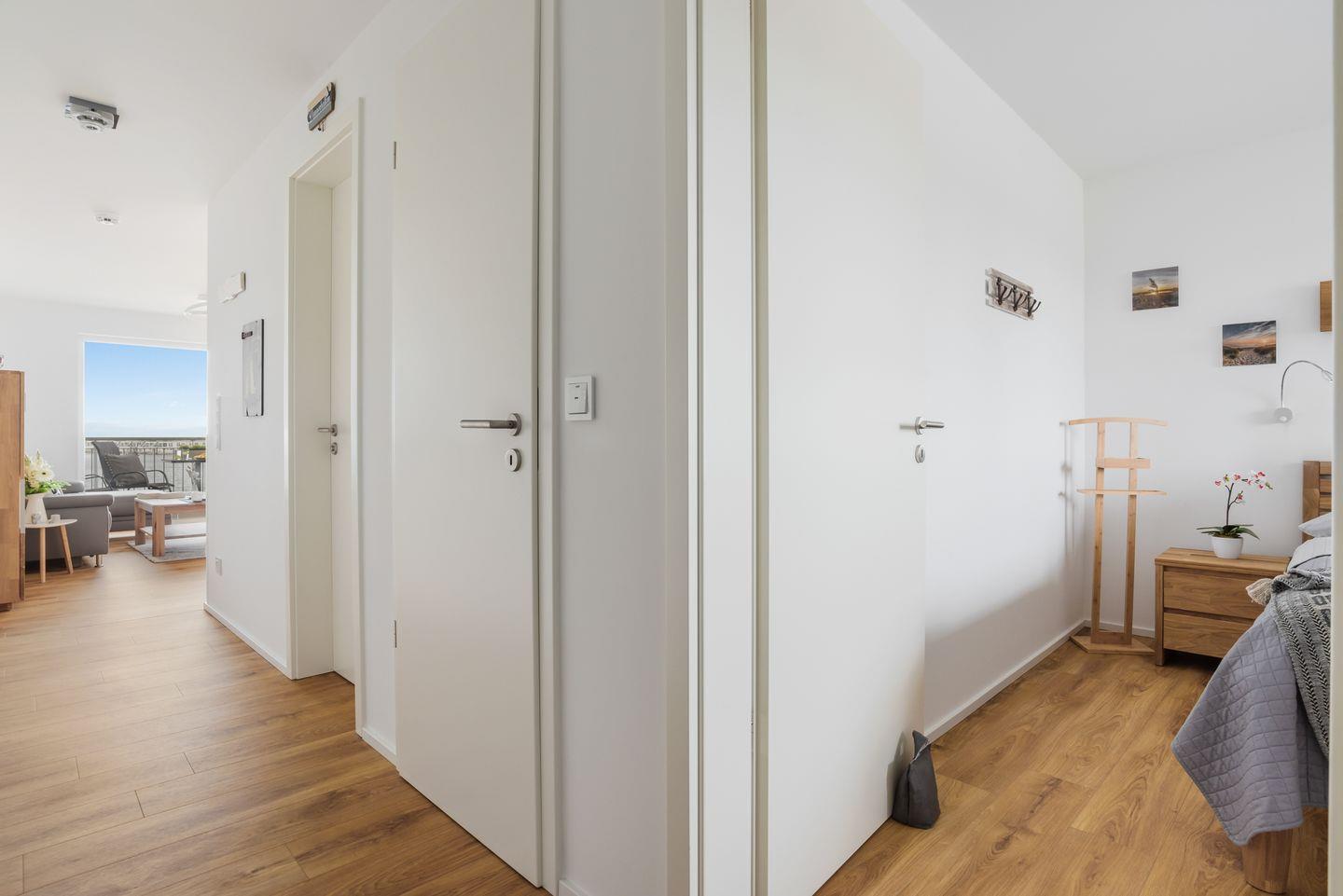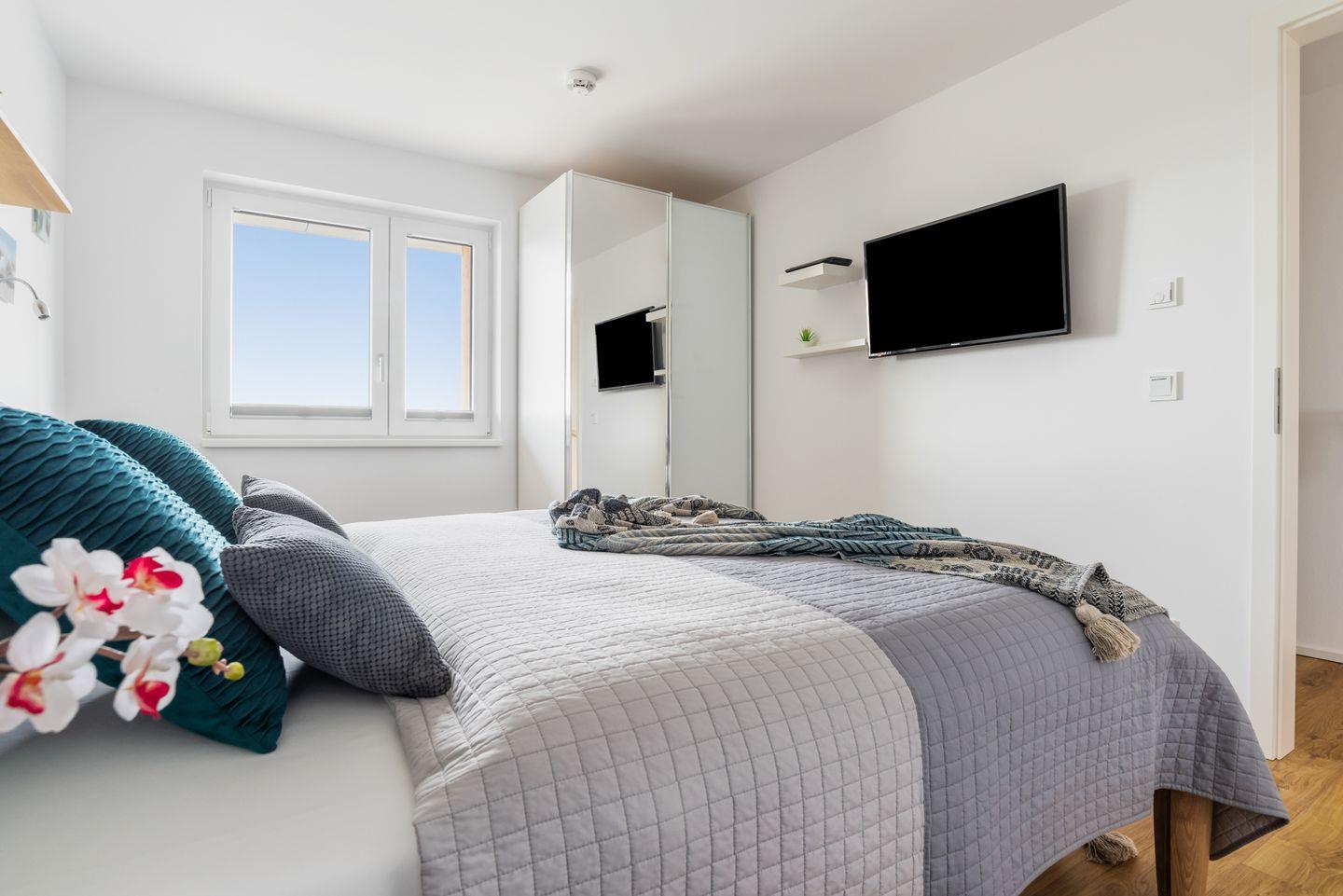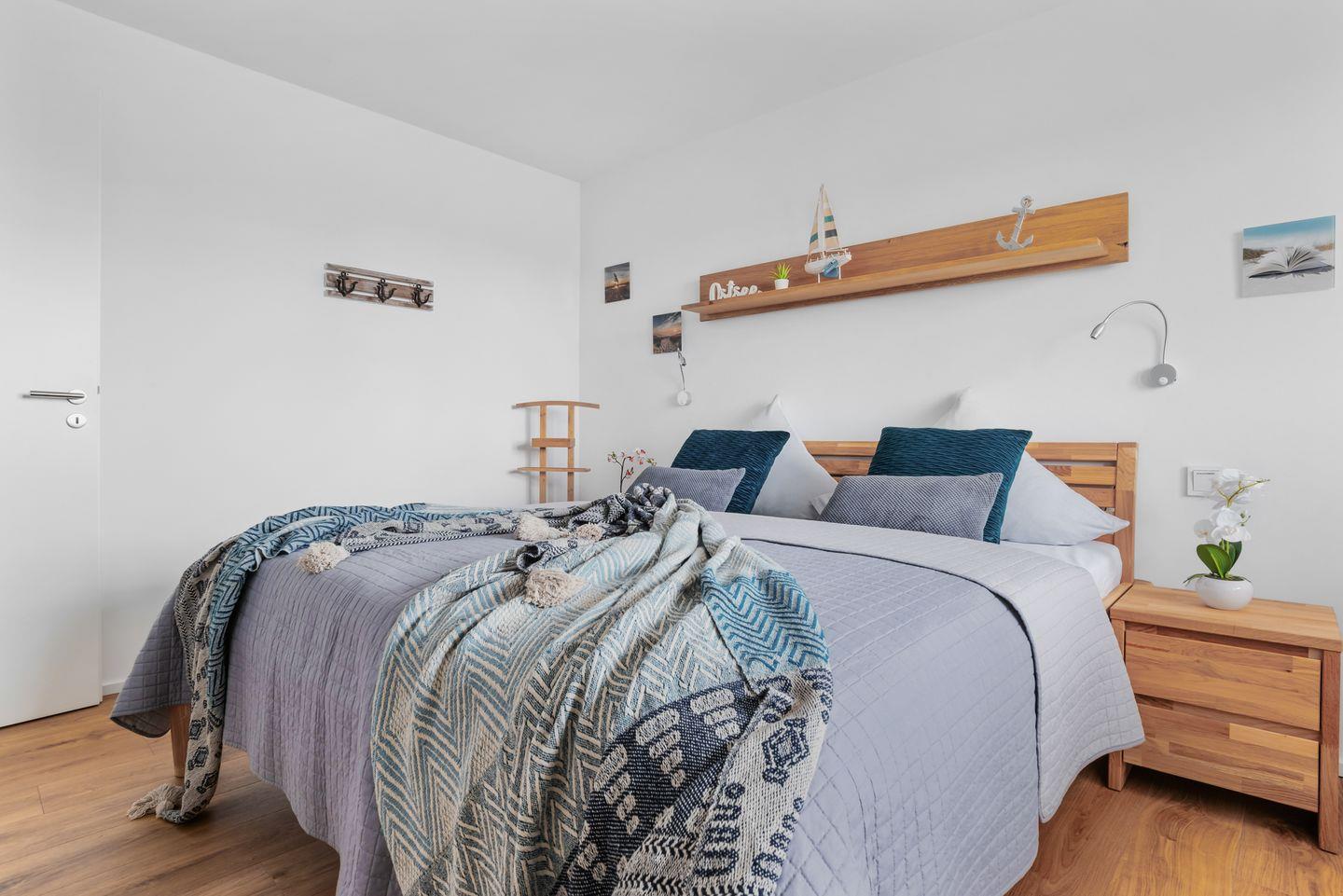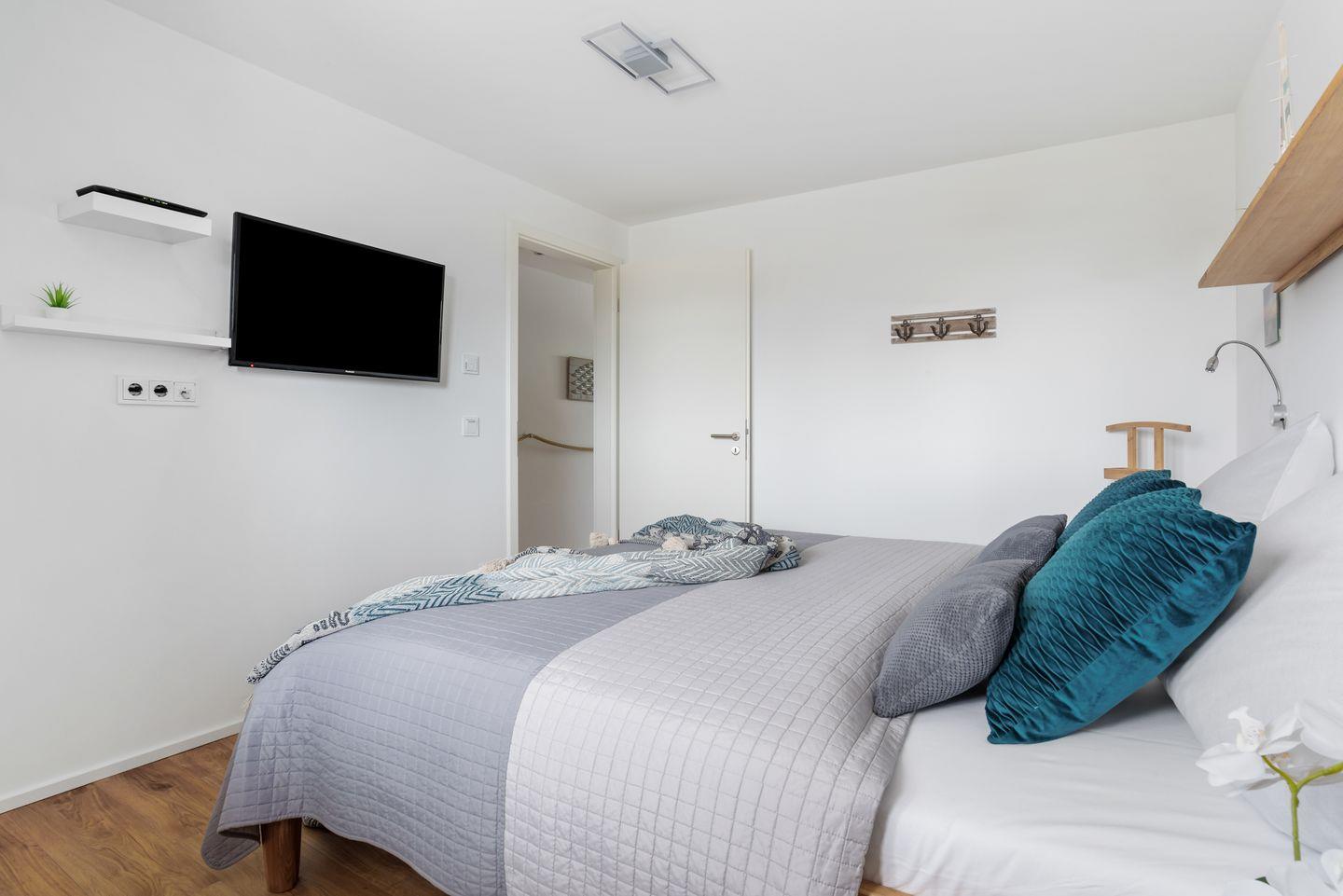 Im Schlafzimmer erwartet Dich ein großzügiges Doppelbett (180 × 200 cm), ein Kleiderschrank und ein Flachbild-Fernseher.