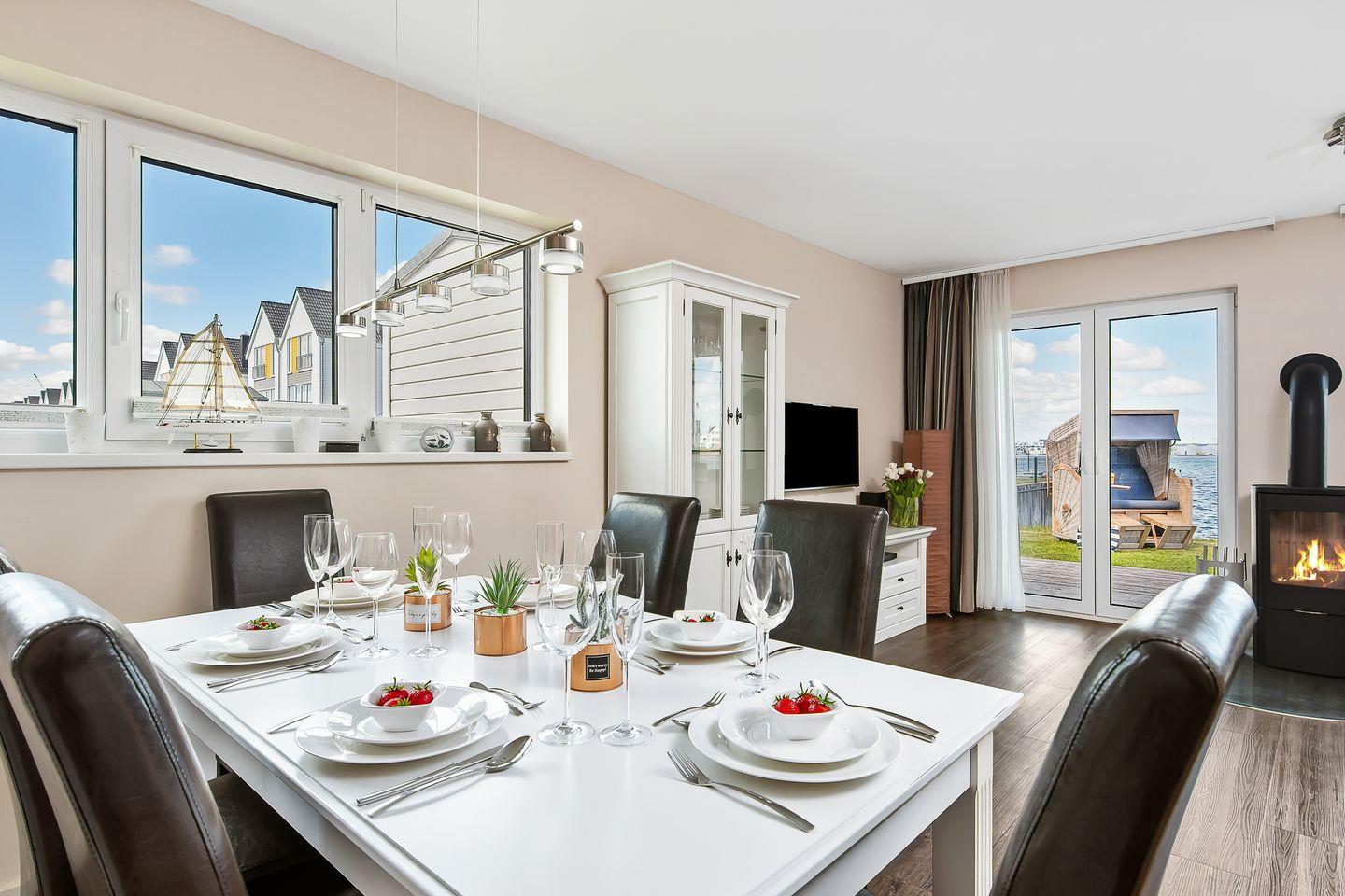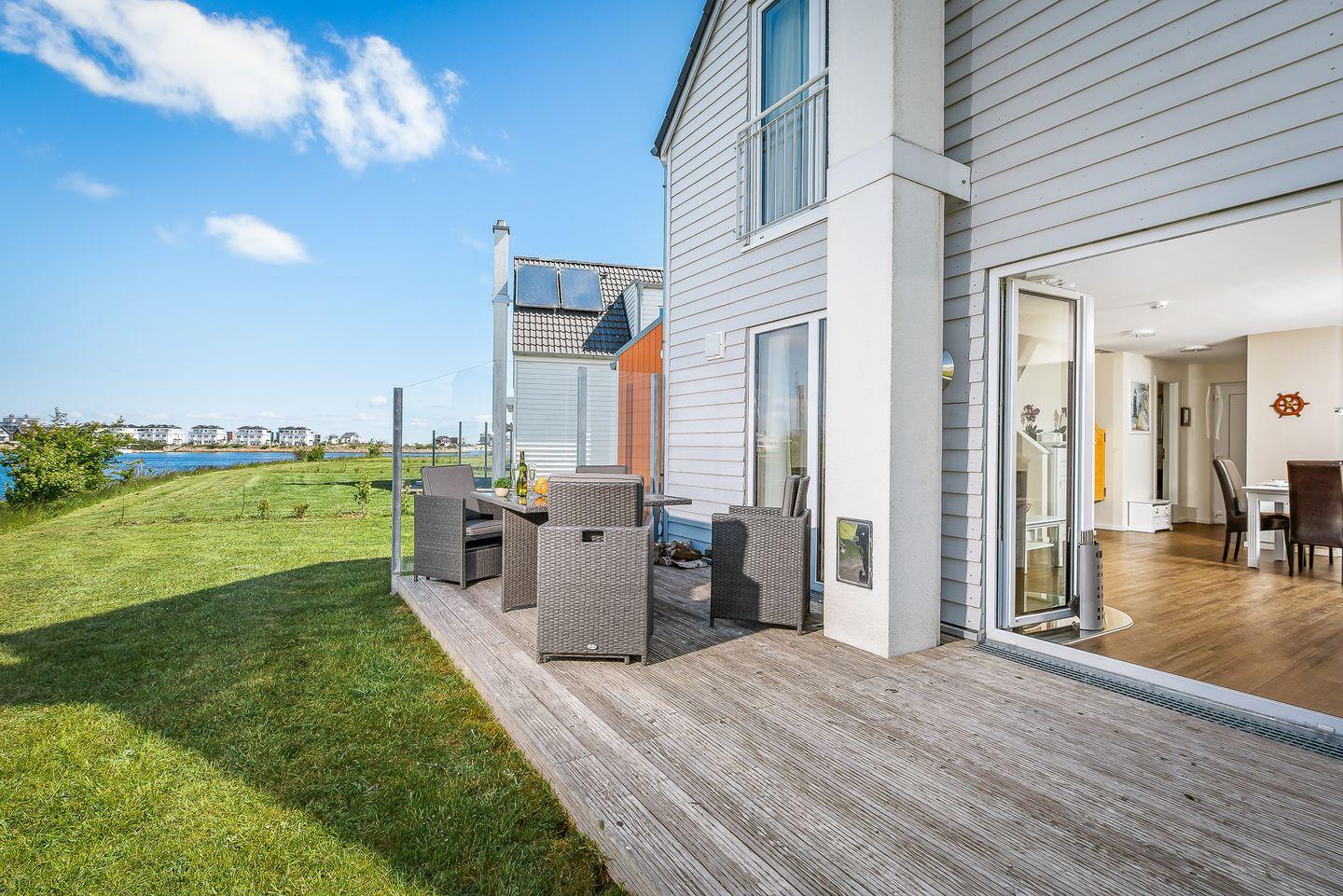 Das Ferienhaus "Hansekogge" im OstseeResort Olpenitz bietet Platz für bis zu sechs Personen. Direkt am Hafenbecken gelegen, bietet der großzügige Wohn- und Essbereich mit offener Küche einen traumhaften Blick auf die Marina. Die Küche ist voll ausgestattet, und der Wohnbereich lädt mit Kamin ein. Die Terrasse mit Gartenmöbeln, Strandkorb und Grill bietet Erholung pur. Zwei Schlafzimmer, Wellnessbad mit Whirlwanne und Infrarot-Sauna, PKW-Stellplätze und Nähe zum Strand runden das Angebot ab.