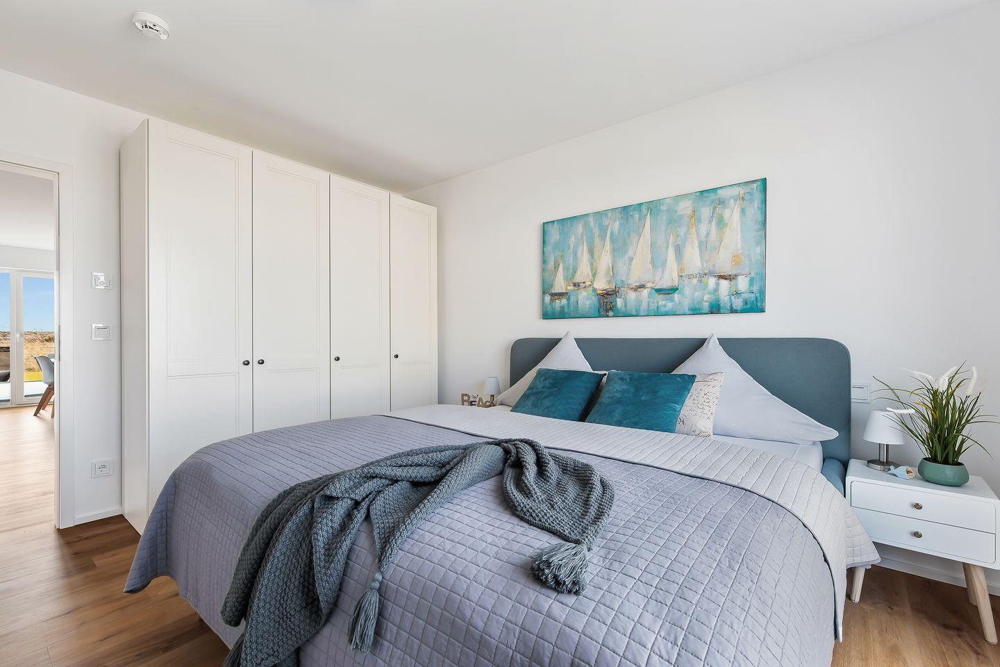Der großzügige Wohn- und Essbereich mit integrierter, voll ausgestatteter Küche ist durch bodentiefe Fenster lichtdurchflutet und lädt Dich zu tollen Kochabenden mit der ganzen Familie ein. Von hier aus gelangst Du direkt auf die möblierte Terrasse, die mit einem Grill zum Verweilen im Freien einlädt. Schon frühmorgens kannst Du die ersten Sonnenstrahlen genießen und den herrlichen Ausblick in die Natur und in Richtung Osten bewundern. Zwei Terrassen sowie die angrenzende Wiese sorgen dafür, dass Du den ganzen Tag über die Sonne genießen kannst. Der Strand ist nur einen kurzen Spaziergang entfernt, und auch das Hafenbecken erreichst Du in wenigen Minuten zu Fuß.