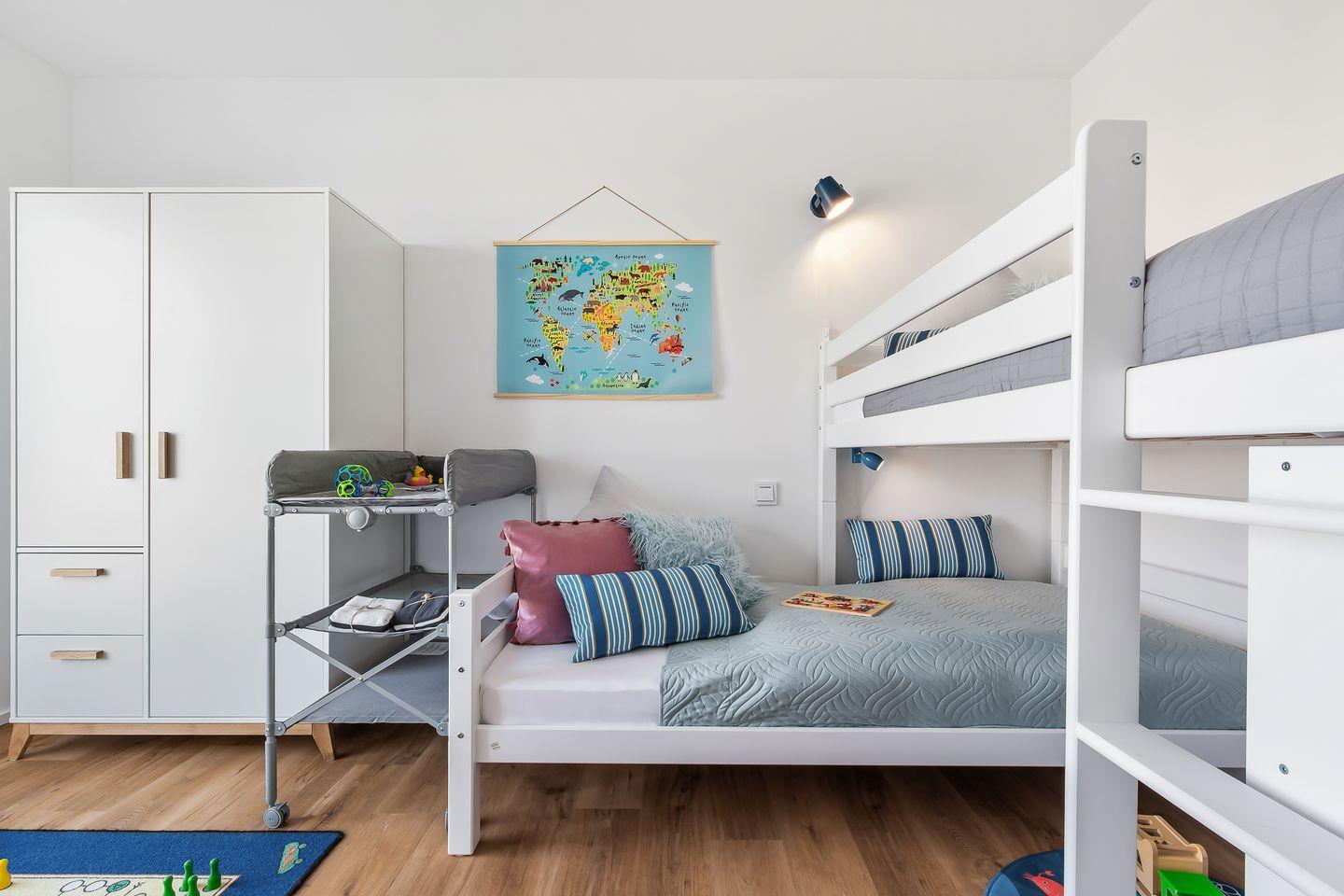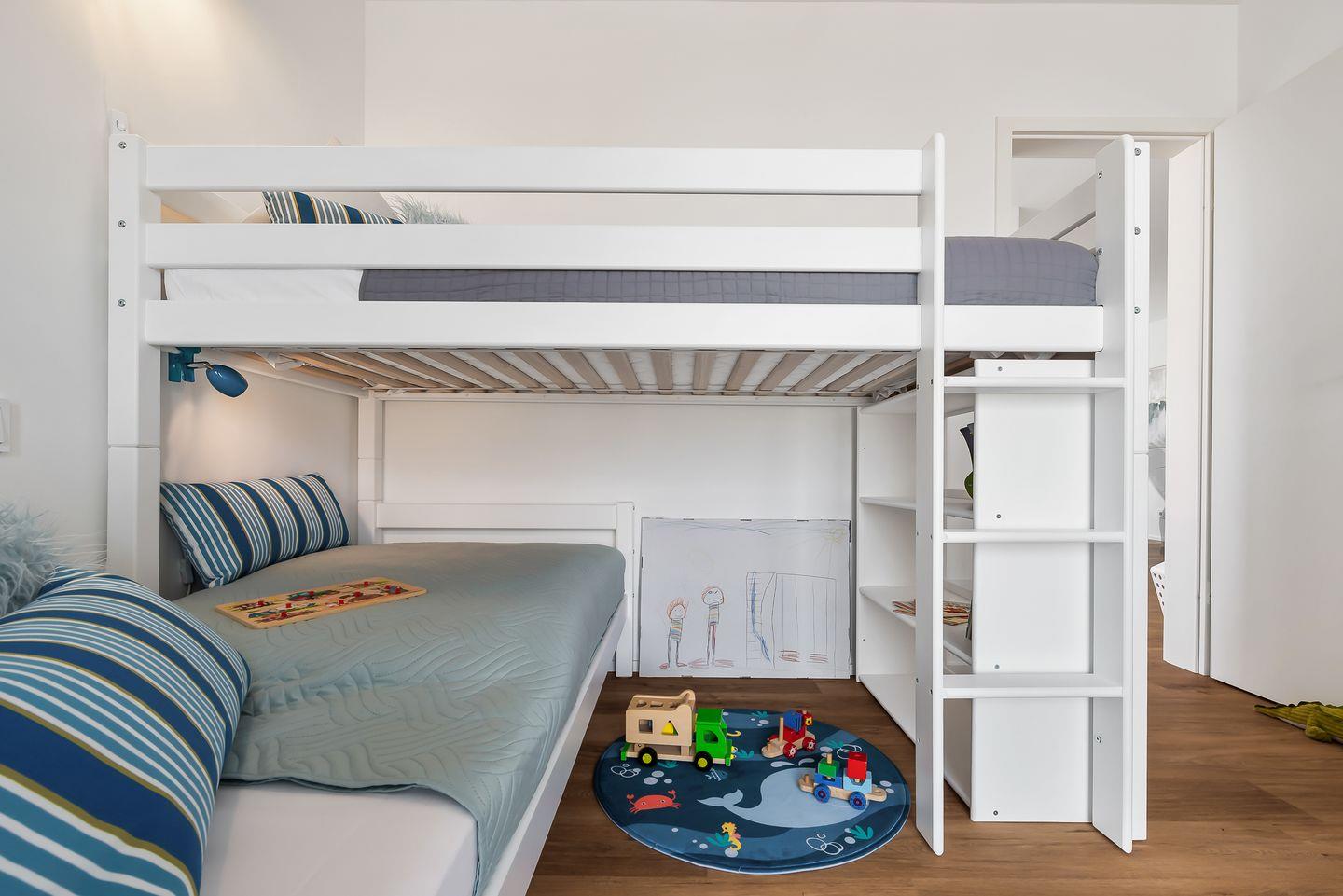 Das Doppelschlafzimmer ist mit einem bequemen Doppelbett (180x200 cm), einem großen Kleiderschrank und einem TV ausgestattet. Im Kinderzimmer stehen Dir ein Hochbett (90x190 cm) sowie ein Etagenbett (2 x 90x200 cm) zur Verfügung. Für die Kleinsten kann bei Bedarf ein Babybett bereitgestellt werden, das auch im Elternschlafzimmer aufgestellt werden kann. Ein mobiler Wickeltisch erleichtert Dir die Babypflege. Spielsachen wie Puzzle, Spiele, Lego Duplo und Bücher sorgen dafür, dass auch an Regentagen keine Langeweile aufkommt.