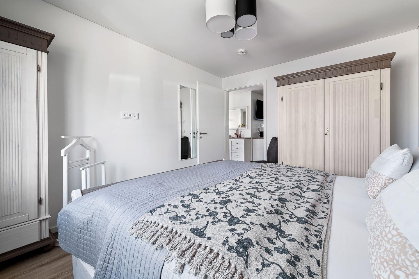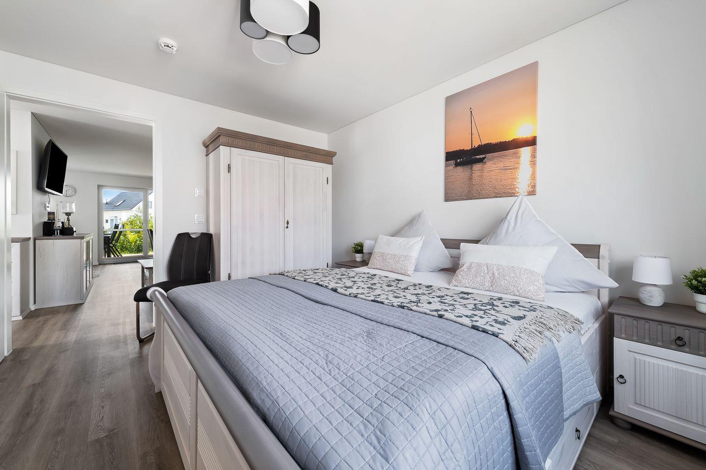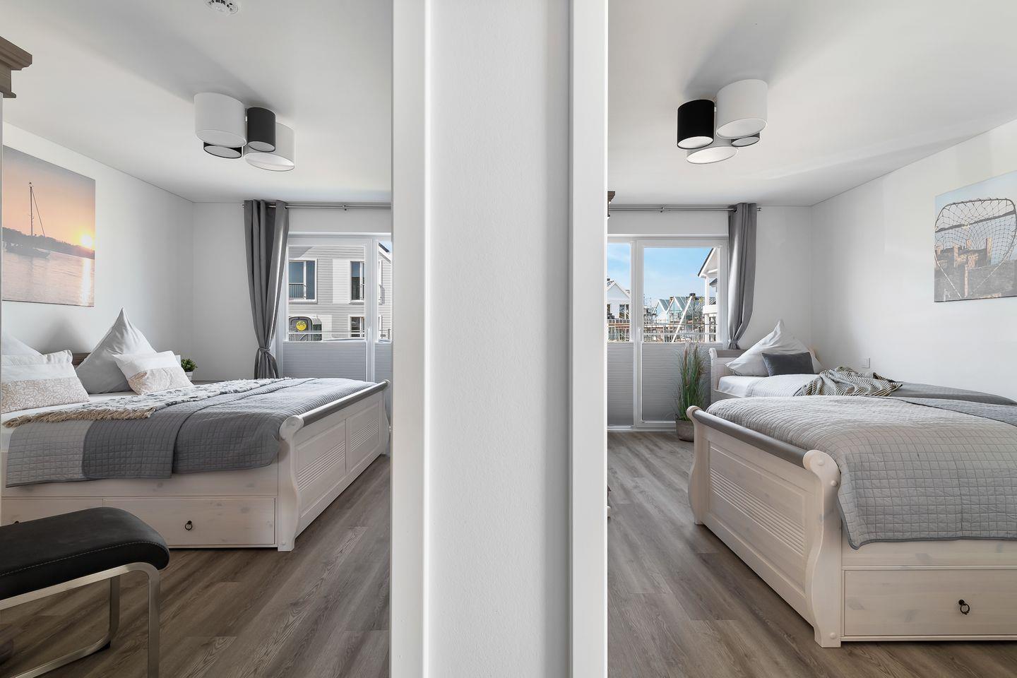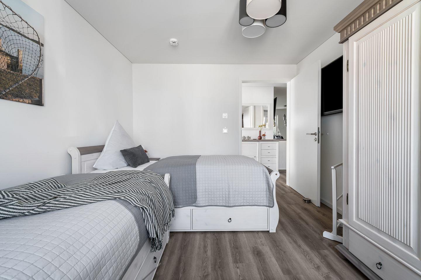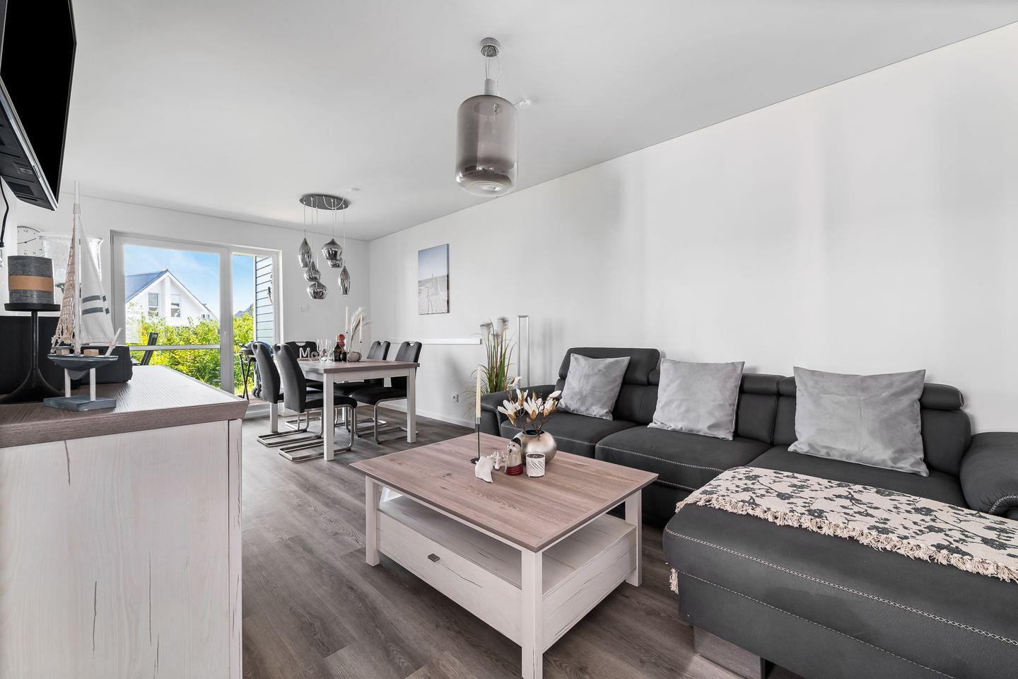 In dieser barrierearmen und gemütlich eingerichteten Wohnung fühlen Sie sich schnell wie zu Hause. Die Wohnung "Krosse Krabbe'' bietet mit 2 Schlafzimmern und einem großen offenen Wohn-/Essbereich reichlich Platz für bis zu 6 Personen. Die Türen in dieser Wohnung haben eine Breite von ca. 1m. Der fußläufig erreichbare Weidefelder Strand bringt sofort Entspannung pur, sodass der Alltag schnell in Vergessenheit gerät. Der große Wohn- und Essbereich ist modern eingerichtet und durch bodentiefe Fenster sehr hell. In der kalten Jahreszeit können Sie es sich vor dem Kamin im Wohnzimmer gemütlich machen. Machen Sie es sich auf dem Sofa mit Schlaffunktion (135x200cm) bei einem spannenden Film gemütlich oder verbringen Sie gemeinsame Spieleabende am Esstisch. In dem Möbeltresor können alle wichtigen Gegenstände sicher verstaut werden. An warmen Sommertagen sorgen zwei Ventilatoren für einen kühlen Kopf. Die offene und hochwertige Küche ist voll ausgestattet lädt zu gemeinsamen Kochabenden ein. Ein Schlafzimmer verfügt über ein Doppelbett (180x200cm) und das zweite Zimmer über zwei Einzelbetten (je 100x200cm), sowie einen Flachbild-Fernseher. Beide Schlafzimmer sind mit je einem Kleiderschrank, Verdunkelungsmöglichkeiten und Insektenschutzgitter ausgestattet. Das Tageslicht-Duschbad hält für Sie ein Fön, einen Kosmetikspiegel und einen Handtuchheizkörper bereit. Nach einem Spaziergang an der frischen Ostseeluft können Sie sich in der Infrarot-Sauna entspannen. Die Ost-Terrasse bietet wunderschöne Sonnenaufgänge bei einem ausgiebigen Frühstück. Dank des Elektrogrills steht auch einem gemütlichen Grillabend nichts mehr im Weg. Für die Kleinen sind ein Kinderhochstuhl und ein Kinderreisebett vorhanden. Ein kostenloser PKW-Stellplatz mit E-Ladesäule und ein abschließbarer Fahrradschuppen befinden sich vor dem Haus. Für einen unvergesslichen Ostsee-Urlaub finden Sie in Ferienwohnung "Krosse Krabbe" einen Faltbollerwagen, einen Tretroller, ein Federball-Set und ein Botscha-Spiel.