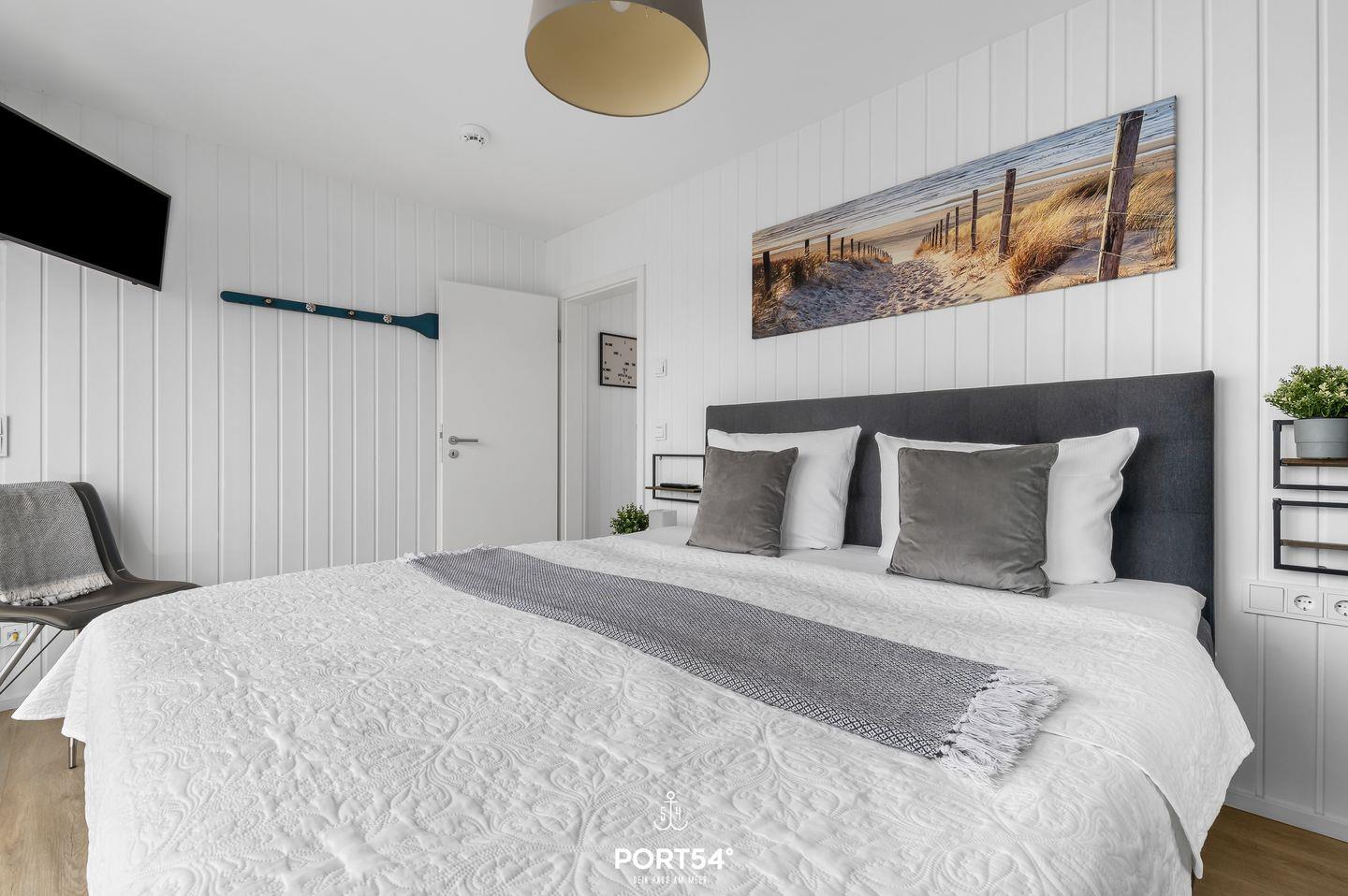 Das Hauptschlafzimmer bietet Dir einen exklusiven Blick auf das Wasser direkt aus dem Bett.
