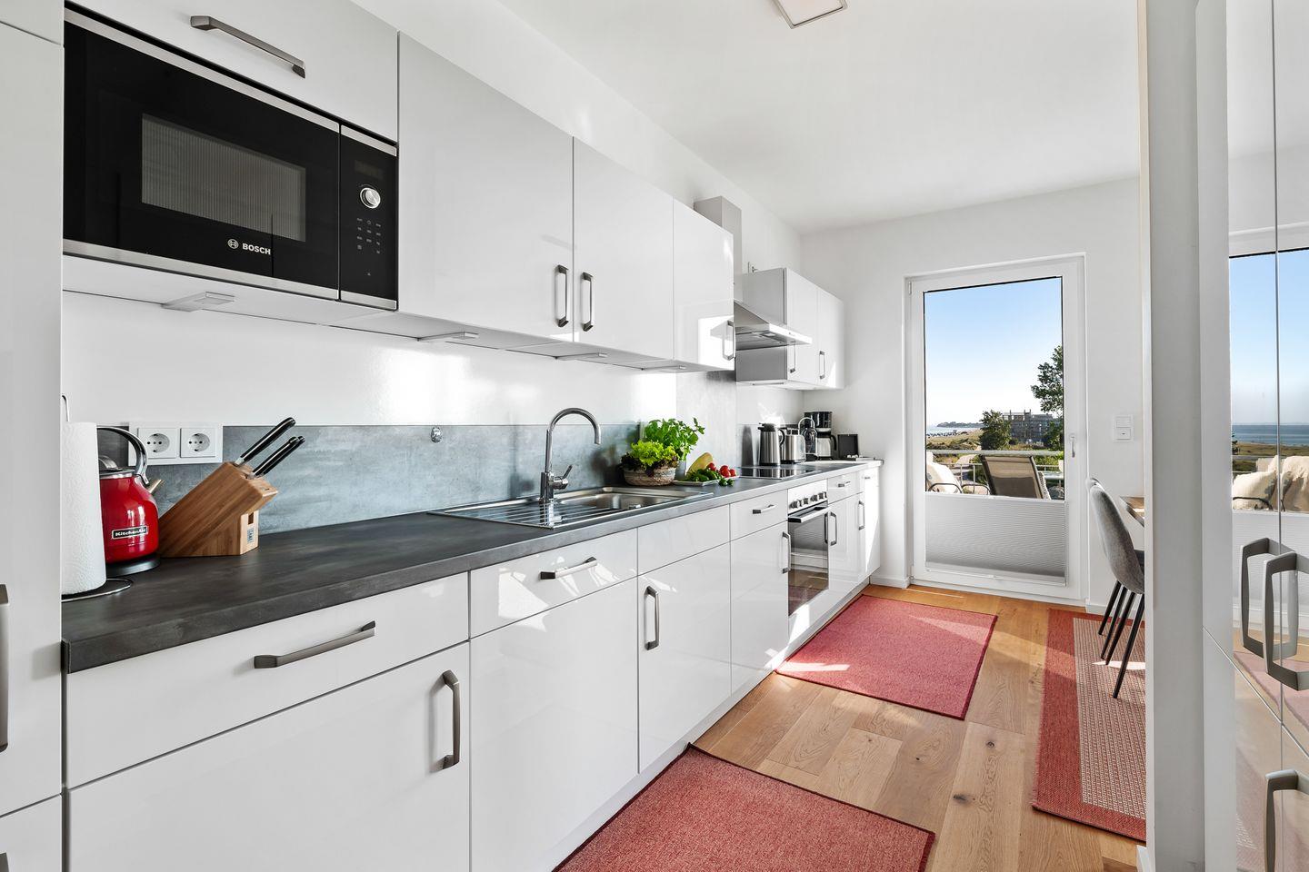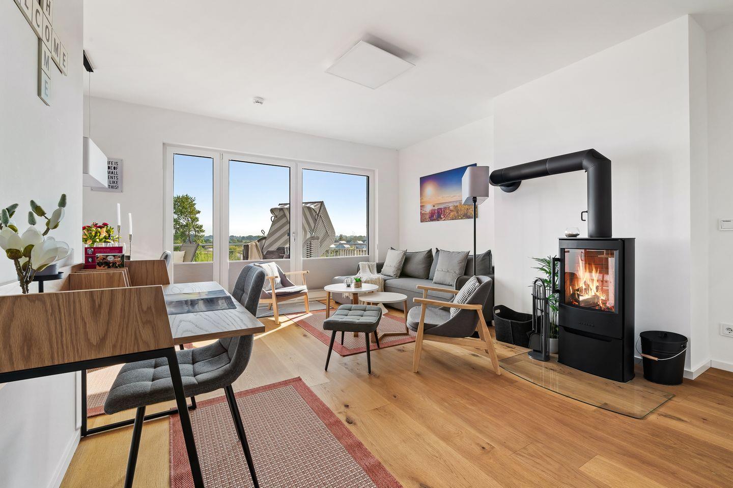 Die Ferienwohnung "Ostseerauschen" bietet auf 78m² die perfekte Kulisse für einen erholsamen Urlaub an der Ostsee. Schon beim Betreten der Wohnung spürt man die entspannte Atmosphäre, die durch die geschmackvolle Einrichtung entsteht. Der großzügige Balkon mit traumhaftem Blick auf die Ostsee und den Weidefelder Strand lädt dazu ein, den Alltag hinter sich zu lassen. Hier können Sie gemütlich in den Gartenmöbeln Platz nehmen, die frische Meeresluft einatmen und bei einem Buch abschalten. Ein Sonnenschirm bietet Schatten und mit dem Elektrogrill können Sie direkt auf dem Balkon frische Meeresfrüchte oder andere Köstlichkeiten zubereiten, während die Wellen im Hintergrund sanft rauschen. Im Inneren der Wohnung finden Sie im Wohn- und Essbereich alles, was Sie für entspannte Stunden brauchen. Der Kaminofen sorgt an kühleren Tagen für wohlige Wärme, während Sie auf dem bequemen Sofa bei einem guten Film vorm Flachbild-TV die Seele baumeln lassen. Ein Schreibtisch steht bereit, falls Sie doch einmal den Drang verspüren sollten, ein wenig zu arbeiten oder einfach nur ein paar Postkarten zu schreiben. Die offene, voll ausgestattete Küche bietet Ihnen die Möglichkeit Ihre Lieblingsgerichte zuzubereiten und dabei den Ausblick auf die Ostsee zu genießen. Die beiden Schlafzimmer sind wahre Ruheoasen, jedes mit einem hochwertigen Boxspring-Doppelbett (180x200cm) ausgestattet, das für einen erholsamen Schlaf sorgt. Beide Schlafzimmer bieten in den Kleiderschränken viel Stauraum für Ihre Garderobe. Die sanfte Meeresbrise, die durch das Fenster weht, begleitet Sie in den Schlaf, während die Verdunklungsmöglichkeiten für Nachtruhe sorgen. Das Badezimmer bietet mit seiner ebenerdigen Dusche und dem Tageslicht die perfekte Möglichkeit, nach einem Strandtag abzuschalten. Ein kleiner Kosmetikspiegel, ein Fön und ein Handtuchheizkörper tragen zum Komfort bei. Auch an die kleinen Gäste wurde mit einem Kindertritt-Hocker gedacht. Ein weiterer Komfortfaktor ist die Fußbodenheizung, die in der gesamten Wohnung für eine gleichmäßige Wärme sorgt. Zudem steht eine Waschmaschine zur Verfügung, sodass Sie sich auch bei längeren Aufenthalten um nichts sorgen müssen. Die Nähe zum Weidefelder Strand macht diese Wohnung zum idealen Rückzugsort für alle, die sich nach Ruhe, Natur und dem wohltuenden Klang der Ostseewellen sehnen. Hier können Sie den Alltag hinter sich lassen und einfach nur die Erholung genießen, die diese wunderschöne Umgebung bietet. Das Apartmentgebäude ist mit einem Aufzug ausgestattet, der Ihnen einen bequemen Zugang zu Ihrem Refugium ermöglicht. Ihren PKW können Sie auf dem zur Ferienwohnung gehörenden Parkplatz in der Tiefgarage (Einfahrt 2m hoch) parken. Für Ihre Fahrräder steht ein gemeinschaftlicher abschließbarer Fahrradkeller zur Verfügung.