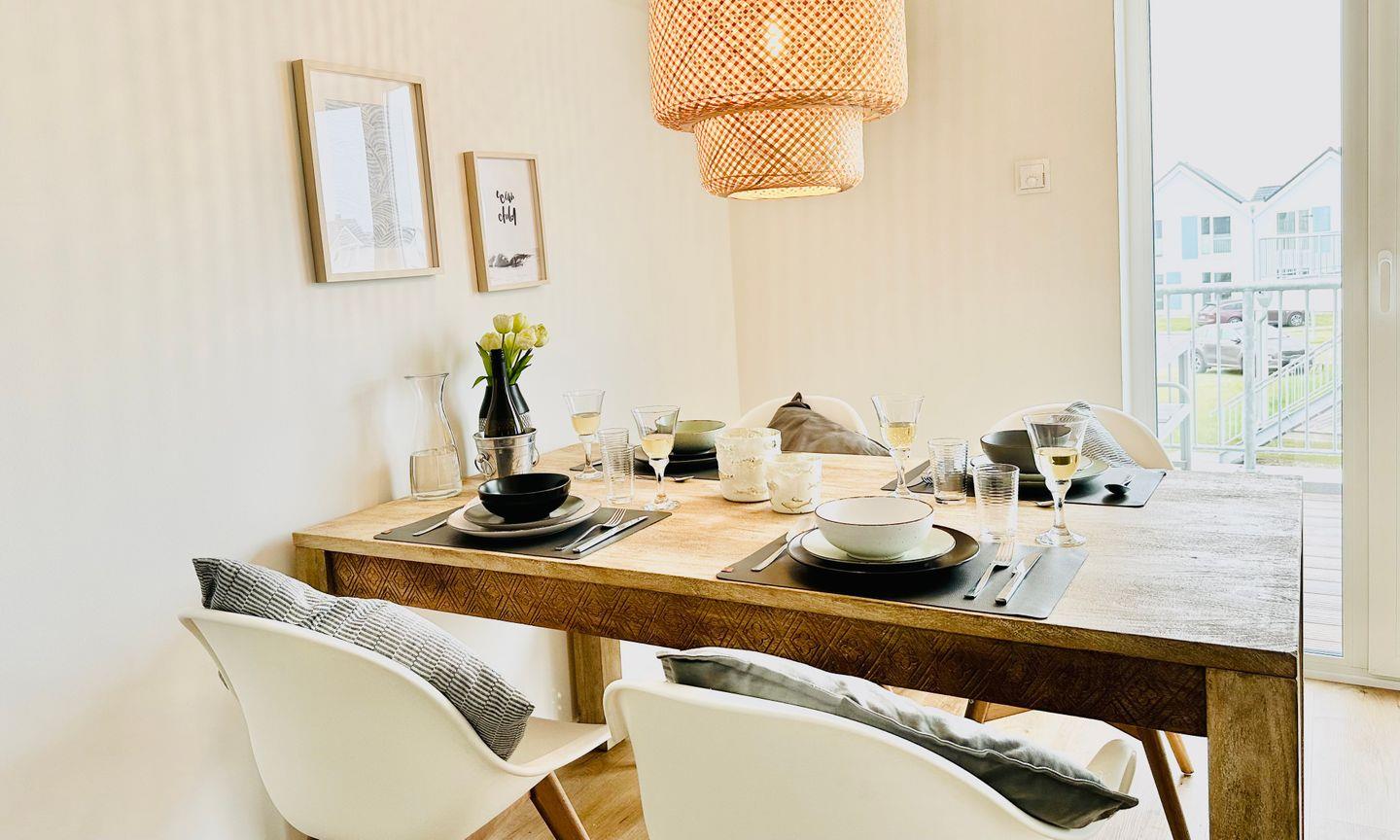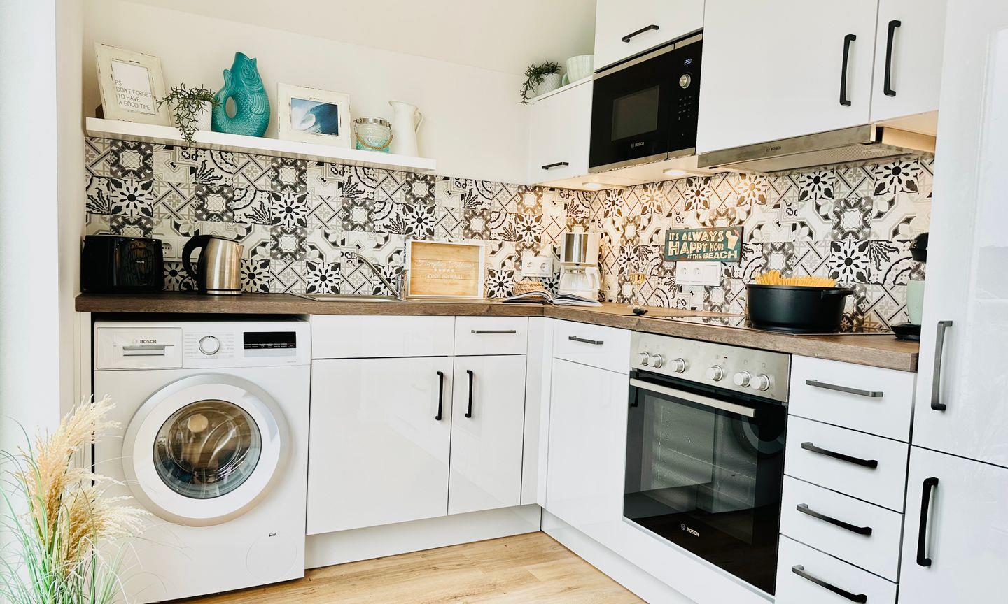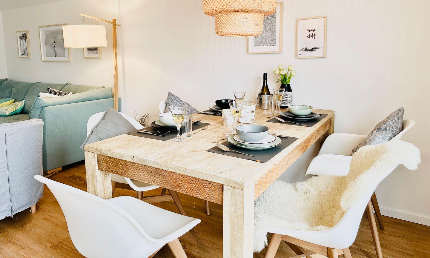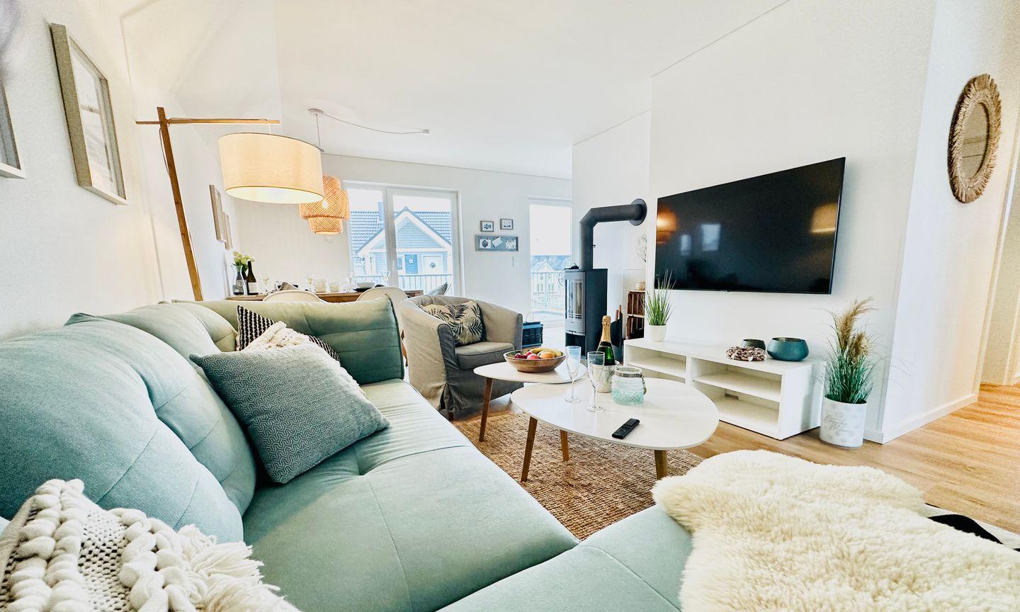 Freuen Sie sich auf eine stilvoll eingerichtete Ferienwohnung im Beachhouse-Stil, die durch ihre durchdachte Ausstattung überzeugt. Die großzügige Ferienwohnung im Obergeschoss bietet Platz für bis zu 5 Personen und besticht durch ein offenes Raumkonzept sowie einen sonnigen Süd-West-Balkon. Hier können Sie den Alltag hinter sich lassen und in entspannter Atmosphäre Urlaub machen. Der offene Wohn-/Essbereich, der durch bodentiefe Fensterfronten und den großen Balkon viel Licht hereinlässt, bildet das Herzstück der Wohnung. Die gemütliche Sofalandschaft lädt zum Entspannen ein, während der Esstisch ideale Bedingungen für gesellige Abende bietet. Sollte das norddeutsche Wetter einmal ungemütlich werden, sorgen ein Kamin und eine Infrarot-Sauna für wohlige Wärme. Bei schönem Wetter bietet der große Balkon die perfekte Gelegenheit, die frische Ostseeluft zu genießen oder einen gemütlichen Grillabend zu veranstalten. Die offene, gut ausgestattete Küche lässt Hobbyköche voll auf ihre Kosten kommen.