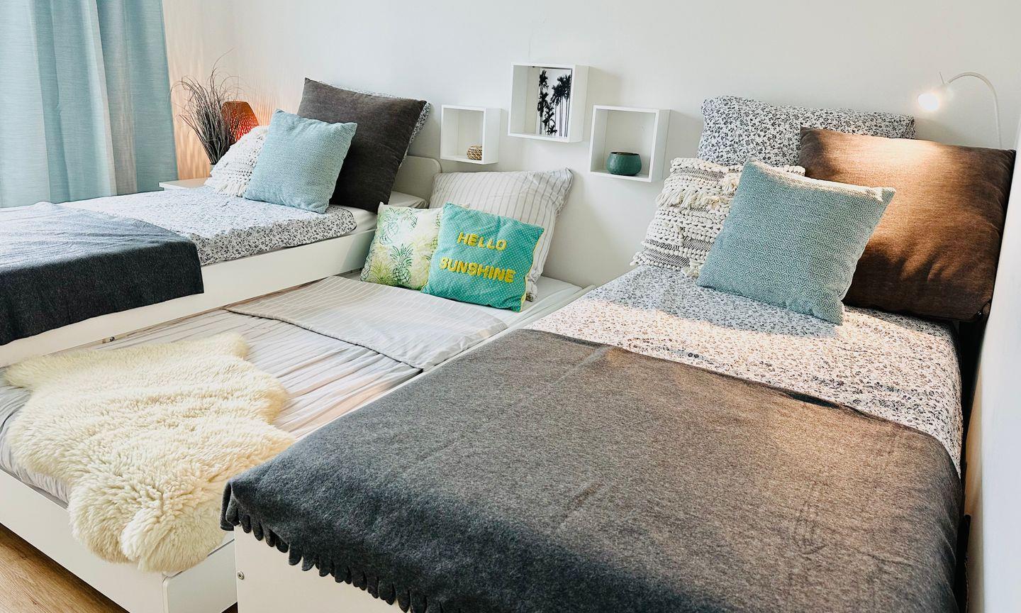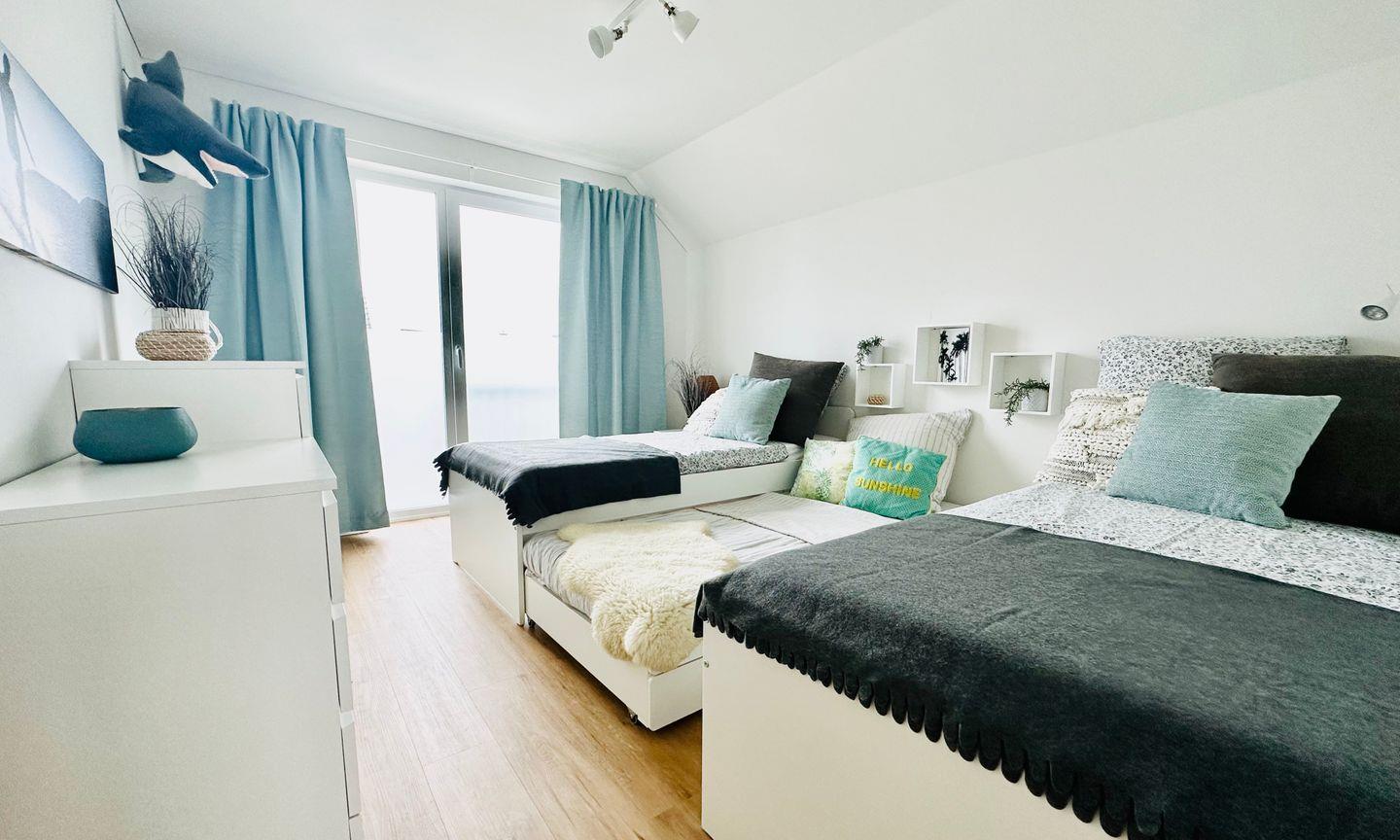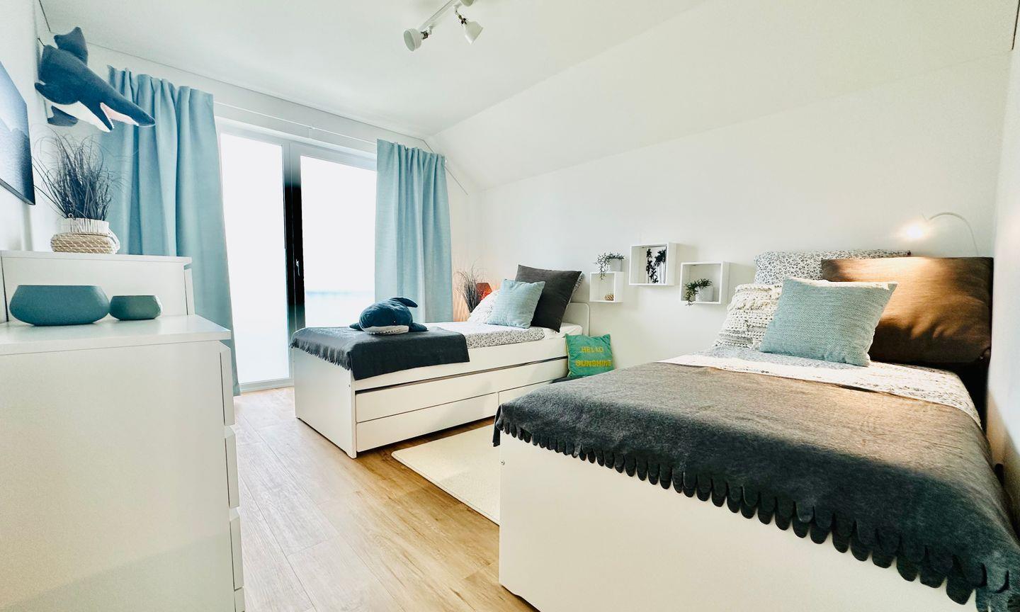 Zwei behagliche Schlafzimmer bieten erholsame Nächte: Das Hauptschlafzimmer ist mit einem Boxspringbett (180x200cm) und einem Fernseher ausgestattet, während im zweiten Schlafzimmer zwei Kojenbetten (je 90x200cm) stehen, von denen eins ausgezogen werden kann – ideal für Familien mit Kindern. Das moderne Badezimmer mit bodengleicher Dusche und Infrarot-Sauna lädt zur Entspannung ein – ein wunderbarer Abschluss eines gelungenen Urlaubstages. Für unsere kleinen Gäste stehen ein Kinderreisebett, ein Hochstuhl und ein Kindertritthocker bereit. Ein eigener PKW-Stellplatz direkt an der Ferienwohnung rundet das Komfortangebot ab. Falls Sie als Gruppe oder mit zwei Familien reisen, können Sie – je nach Verfügbarkeit – die Unterkunft „Nordlicht“ buchen, die sich im gleichen Gebäude direkt über der Wohnung „Surfbude“ befindet.