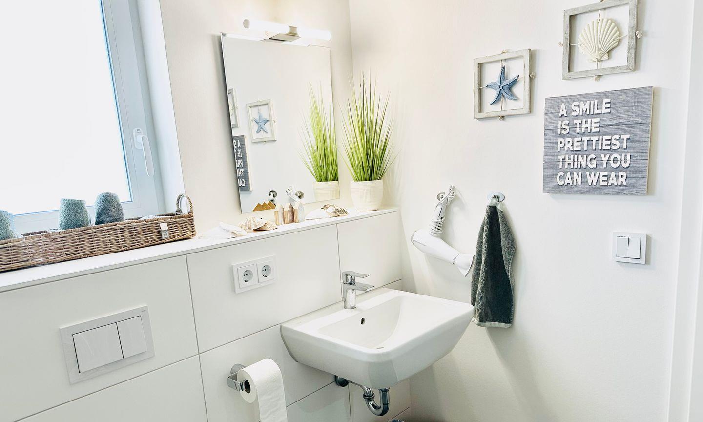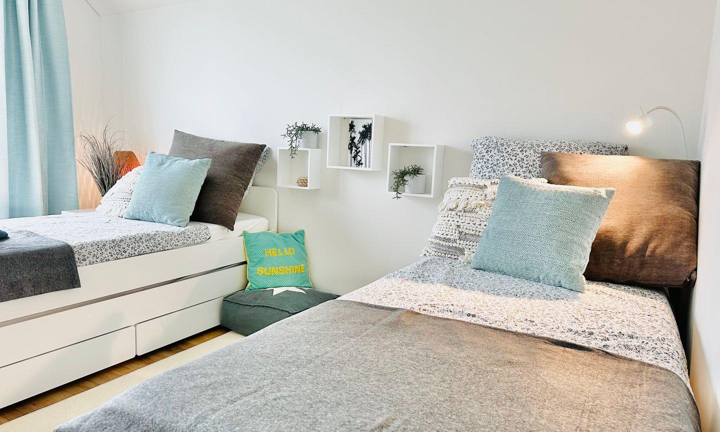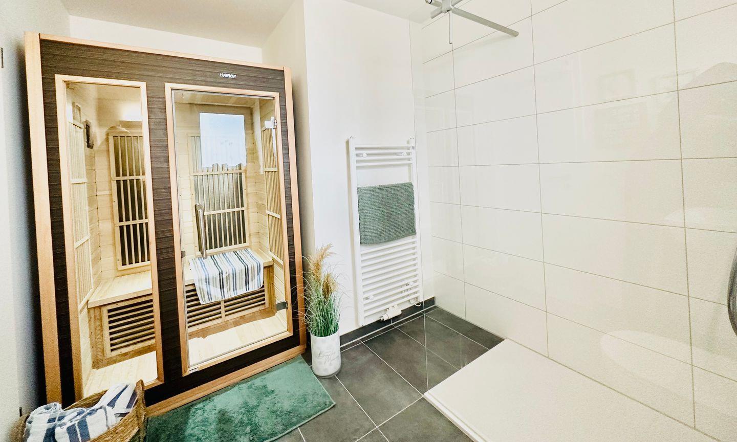 Zwei behagliche Schlafzimmer bieten erholsame Nächte: Das Hauptschlafzimmer ist mit einem Boxspringbett (180x200cm) und einem Fernseher ausgestattet, während im zweiten Schlafzimmer zwei Kojenbetten (je 90x200cm) stehen, von denen eins ausgezogen werden kann – ideal für Familien mit Kindern. Das moderne Badezimmer mit bodengleicher Dusche und Infrarot-Sauna lädt zur Entspannung ein – ein wunderbarer Abschluss eines gelungenen Urlaubstages. Für unsere kleinen Gäste stehen ein Kinderreisebett, ein Hochstuhl und ein Kindertritthocker bereit. Ein eigener PKW-Stellplatz direkt an der Ferienwohnung rundet das Komfortangebot ab. Falls Sie als Gruppe oder mit zwei Familien reisen, können Sie – je nach Verfügbarkeit – die Unterkunft „Nordlicht“ buchen, die sich im gleichen Gebäude direkt über der Wohnung „Surfbude“ befindet.