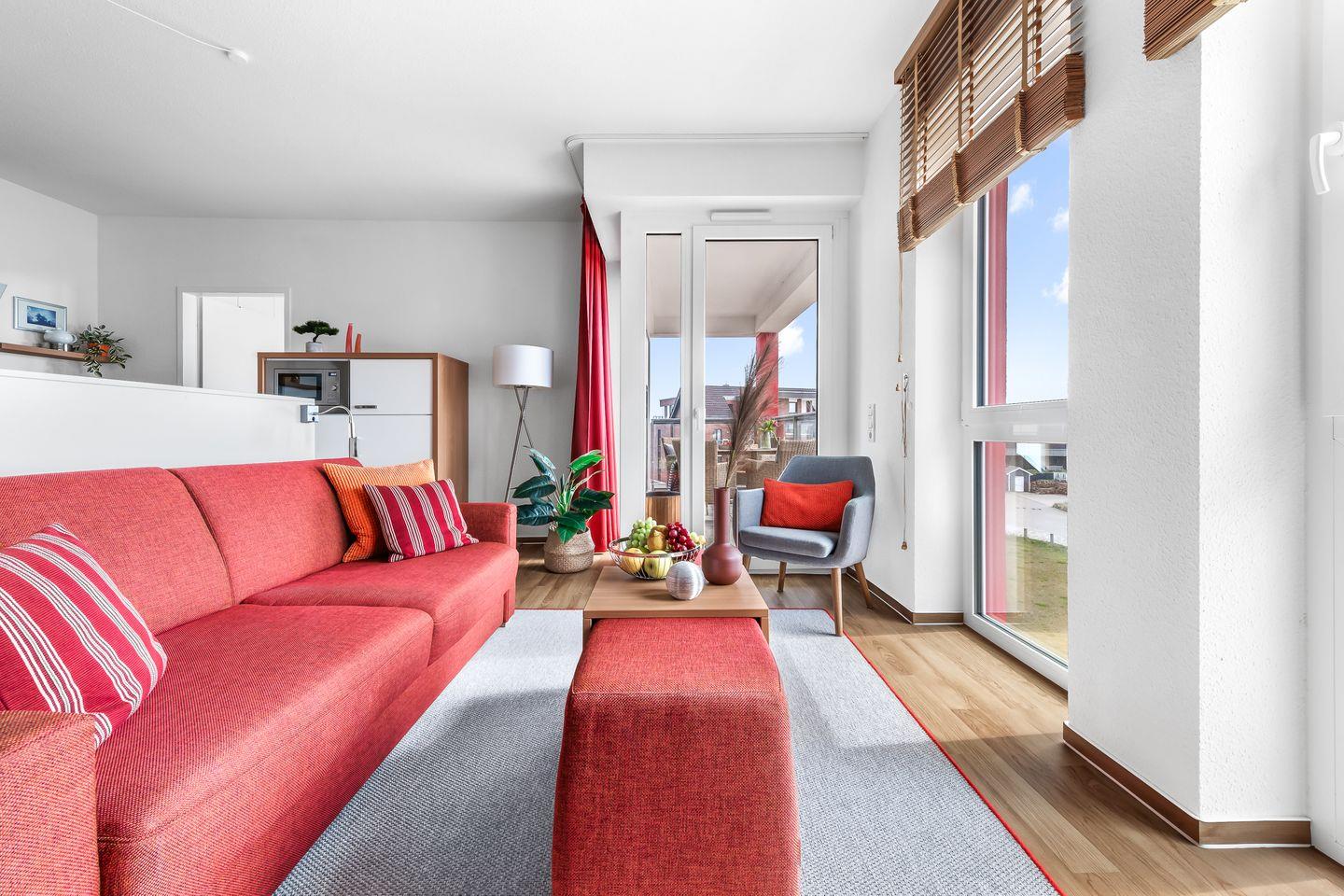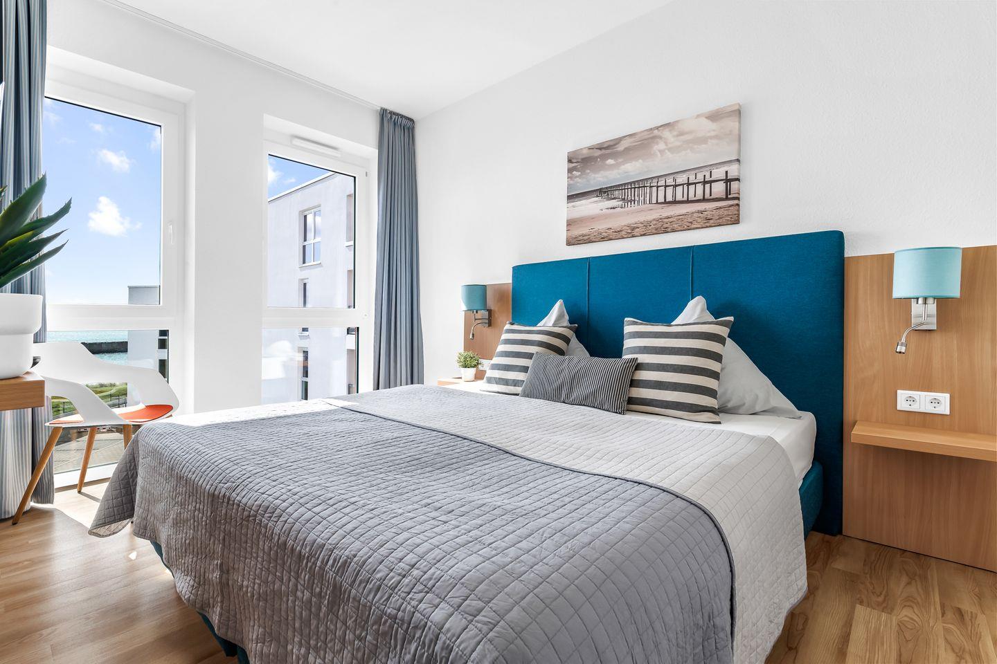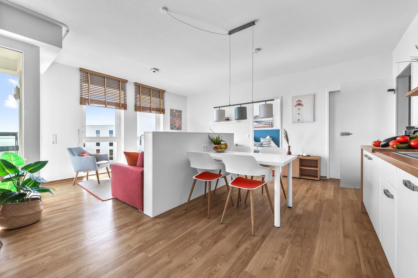 Willkommen in der Ferienwohnung "Meermarie" – Ihr perfekter Rückzugsort für Entspannung und Erholung! Diese charmante Wohnung im 3. Obergeschoss bietet auf 78m² ausreichend Platz für bis zu 4 Personen und lässt keine Wünsche offen. Am Ende einer Sackgasse direkt an der Ostsee gelegen, erwartet Sie hier absolute Idylle und eine fantastische Aussicht. Der Wohnbereich lädt mit einem gemütlichen Sofa, einem großen Hocker und praktischen Ablageflächen für Getränke, Bücher & Co. zum Verweilen ein. Für Unterhaltung sorgen ein Flachbild-Fernseher und ein Radio – ideal für entspannte Abende. Direkt angrenzend finden Sie die offene Küche mit Essbereich. Diese ist voll ausgestattet und verfügt über alles, was Sie brauchen, inklusive einer Espressomaschine und einem Mixer – so steht einem köstlichen Frühstück oder Dinner nichts im Weg. Vom Wohnbereich aus gelangen Sie auf den überdachten Balkon mit traumhaftem Blick auf die Ostsee. Hier können Sie bei Meeresrauschen den Tag genießen oder mit dem Elektrogrill einen geselligen Grillabend mit herrlicher Aussicht veranstalten. Die beiden Schlafzimmer bieten luxuriöse Boxspring-Doppelbetten (180x200cm), in denen Sie erholsam schlafen und den Tag mit Blick auf die Ostsee beginnen können. Jedes Zimmer ist zusätzlich mit einem Flachbild-Fernseher, Kleiderschrank und Verdunkelungsmöglichkeiten ausgestattet. Die zwei modernen Badezimmer bieten jeweils eine ebenerdige Dusche, einen Kosmetikspiegel und einen Föhn. Eines der Bäder verwöhnt Sie zudem mit einem Handtuchheizkörper für extra Komfort. Auch für Familien ist gesorgt: Ein Kinderreisebett, Hochstuhl und Tritthocker stehen bereit. Ihr Auto parken Sie sicher im Tiefgaragenstellplatz, und auch für Fahrräder gibt es einen abschließbaren Raum. In dem gemeinschaftlich genutzten Fahrradraum befinden sich an einigen Plätzen Steckdosen zur kostenfreien Nutzung. Zusätzlich stehen Ihnen im Keller eine Waschmaschine und ein Trockner zur gemeinschaftlichen Nutzung gegen Aufpreis zur Verfügung.