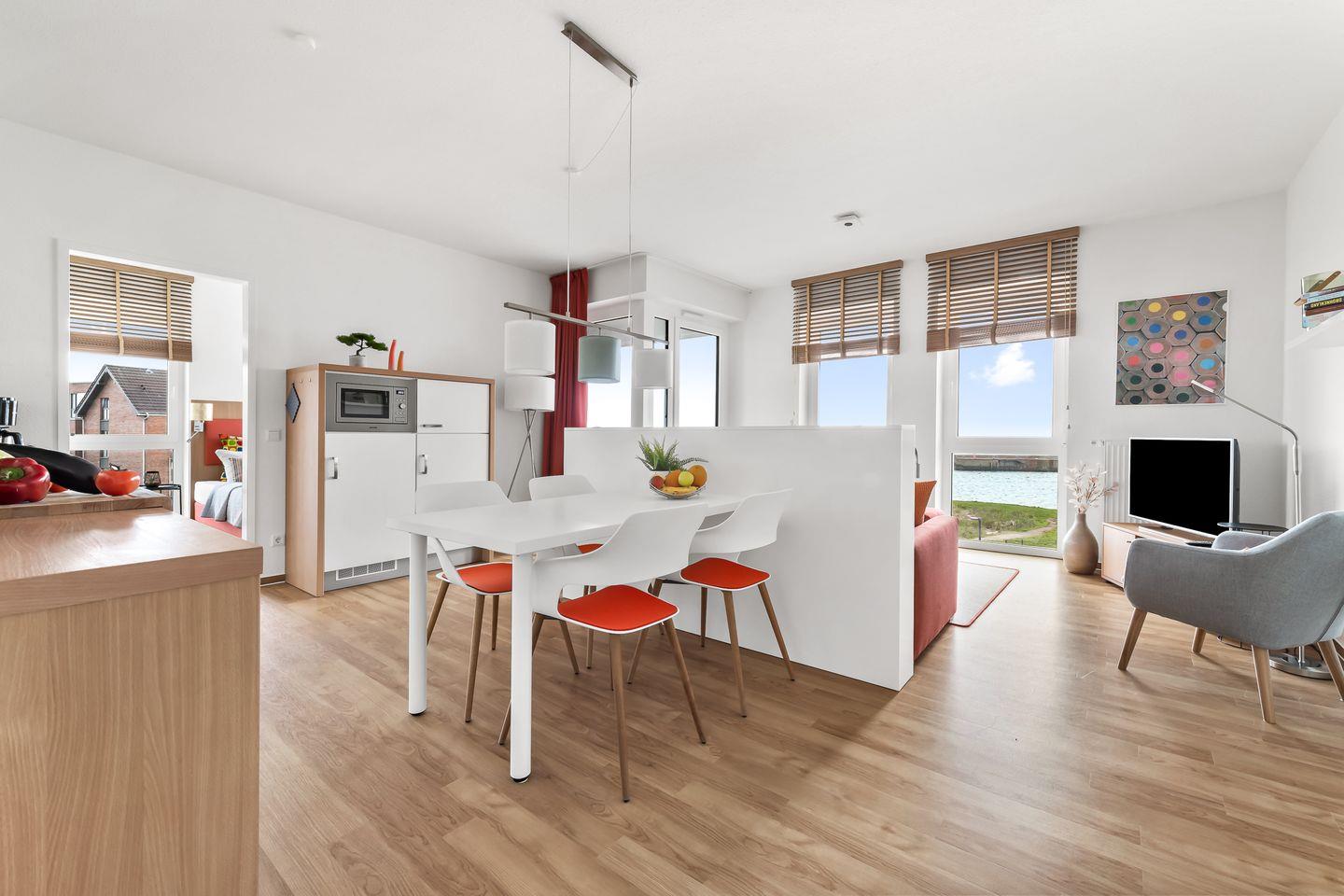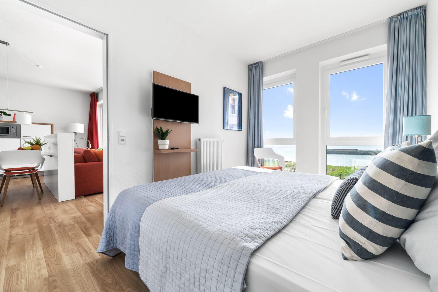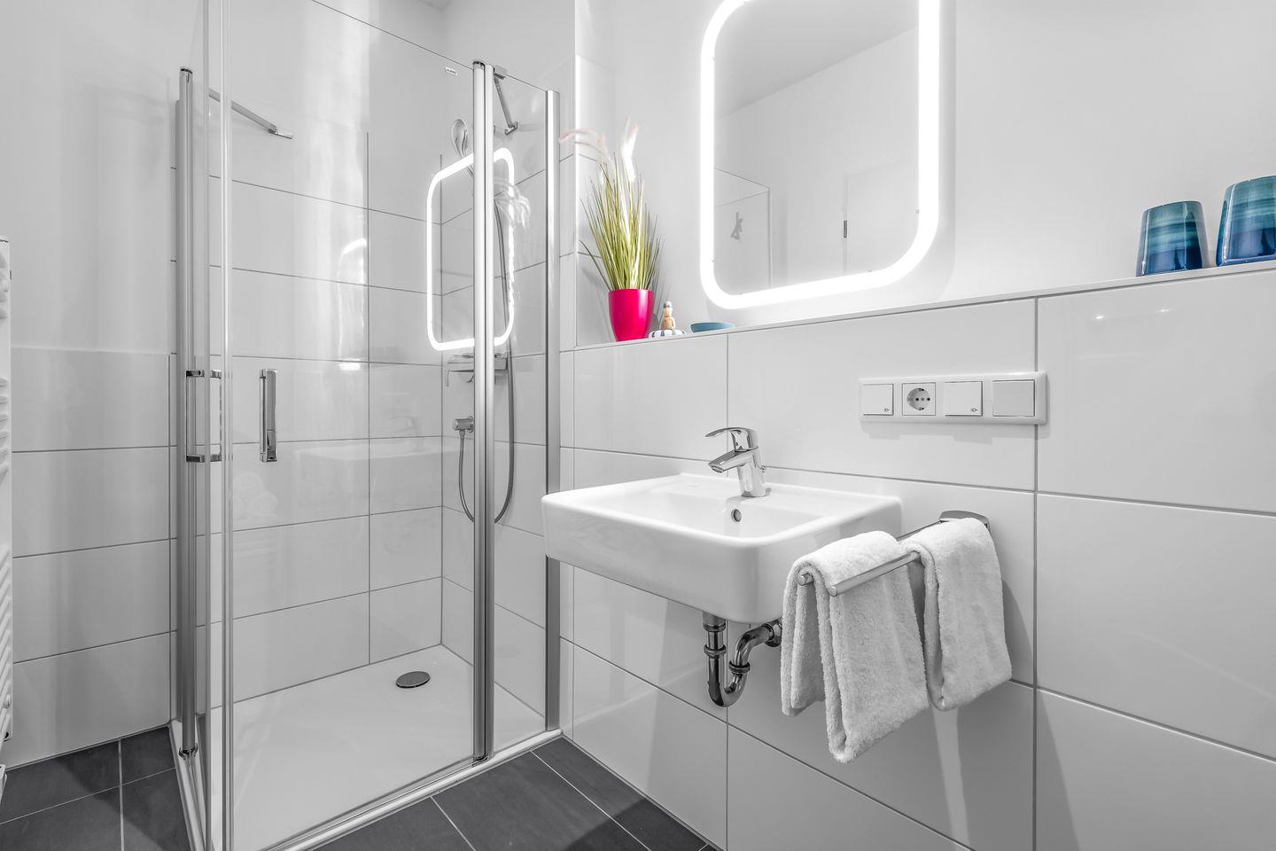 Willkommen in der Ferienwohnung "Meermarie" – Ihr perfekter Rückzugsort für Entspannung und Erholung! Diese charmante Wohnung im 3. Obergeschoss bietet auf 78m² ausreichend Platz für bis zu 4 Personen und lässt keine Wünsche offen. Am Ende einer Sackgasse direkt an der Ostsee gelegen, erwartet Sie hier absolute Idylle und eine fantastische Aussicht. Der Wohnbereich lädt mit einem gemütlichen Sofa, einem großen Hocker und praktischen Ablageflächen für Getränke, Bücher & Co. zum Verweilen ein. Für Unterhaltung sorgen ein Flachbild-Fernseher und ein Radio – ideal für entspannte Abende. Direkt angrenzend finden Sie die offene Küche mit Essbereich. Diese ist voll ausgestattet und verfügt über alles, was Sie brauchen, inklusive einer Espressomaschine und einem Mixer – so steht einem köstlichen Frühstück oder Dinner nichts im Weg. Vom Wohnbereich aus gelangen Sie auf den überdachten Balkon mit traumhaftem Blick auf die Ostsee. Hier können Sie bei Meeresrauschen den Tag genießen oder mit dem Elektrogrill einen geselligen Grillabend mit herrlicher Aussicht veranstalten. Die beiden Schlafzimmer bieten luxuriöse Boxspring-Doppelbetten (180x200cm), in denen Sie erholsam schlafen und den Tag mit Blick auf die Ostsee beginnen können. Jedes Zimmer ist zusätzlich mit einem Flachbild-Fernseher, Kleiderschrank und Verdunkelungsmöglichkeiten ausgestattet. Die zwei modernen Badezimmer bieten jeweils eine ebenerdige Dusche, einen Kosmetikspiegel und einen Föhn. Eines der Bäder verwöhnt Sie zudem mit einem Handtuchheizkörper für extra Komfort. Auch für Familien ist gesorgt: Ein Kinderreisebett, Hochstuhl und Tritthocker stehen bereit. Ihr Auto parken Sie sicher im Tiefgaragenstellplatz, und auch für Fahrräder gibt es einen abschließbaren Raum. In dem gemeinschaftlich genutzten Fahrradraum befinden sich an einigen Plätzen Steckdosen zur kostenfreien Nutzung. Zusätzlich stehen Ihnen im Keller eine Waschmaschine und ein Trockner zur gemeinschaftlichen Nutzung gegen Aufpreis zur Verfügung.