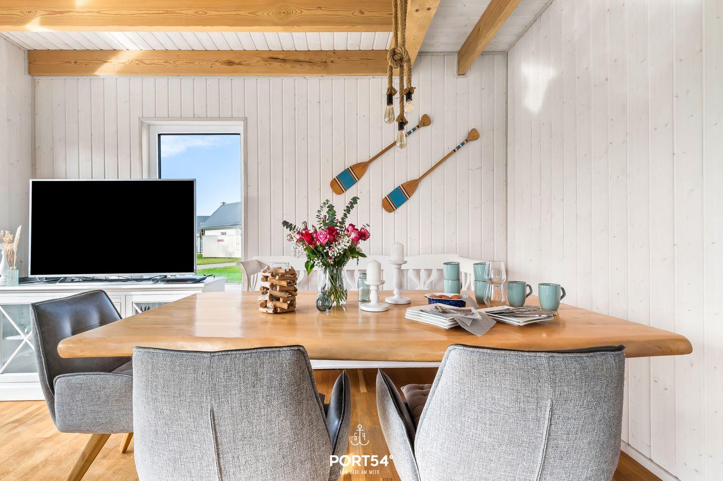 Willkommen im Ferienhaus "Meeresmuschel"! Auf großzügigen 82m² erwartet Sie ein freistehendes Urlaubsparadies, das durch seine unmittelbare Nähe zur Ostsee besticht. Der gemütliche Wohn- und Essbereich lädt mit einem wärmenden Kamin und einer bequemen Couch zum Entspannen ein. Dank der bodentiefen Fenster strömt viel Licht in die Räume und schafft eine freundliche, großzügige Atmosphäre. Die voll ausgestattete Küche lässt keine Wünsche offen: Hier finden Sie u.a. eine Spülmaschine, ein Ceranfeld, eine Mikrowelle und sogar eine Waschmaschine – alles, was Sie für einen entspannten Aufenthalt benötigen. Das Badezimmer im Erdgeschoss ist ein echtes Highlight: Genießen Sie die wohltuende Wärme der Infrarotkabine oder die erfrischende Dusche in ebenerdiger Ausführung. Ein Fenster mit Sichtschutz und eine Handtuchheizung runden den Komfort ab. Im Obergeschoss erwarten Sie zwei einladende Schlafzimmer. Das erste Schlafzimmer ist mit einem gemütlichen Boxspringbett (180x200cm) ausgestattet und der Kleiderschrank bietet ausreichend Stauraum. Das zweite Schlafzimmer verfügt über ein Doppel-Boxspringbett (180x200cm) und ein kleines Boxspringbett (90x200cm), ebenfalls über einen Kleiderschrank, einen Smart-TV sowie Fenster mit Sicht- und Insektenschutz. Ein weiteres Badezimmer mit WC und Badewanne sowie ein Dachfenster mit Sichtschutz sorgen für zusätzlichen Komfort. Die Terrasse ist der perfekte Ort, um die frische Ostseeluft zu genießen. Hier finden Sie bequeme Outdoormöbel, einen Sonnenschirm und einen Holzkohlegrill – ideal für gesellige Abende im Freien. Und das Beste: Hunde sind nicht nur erlaubt, sondern herzlich willkommen! Ein eigener Parkplatz steht direkt vor dem Haus zur Verfügung. Erleben Sie unvergessliche Tage im Ferienhaus "Meeresmuschel" – Ihr perfekter Ort für Erholung und Abenteuer an der Ostsee!