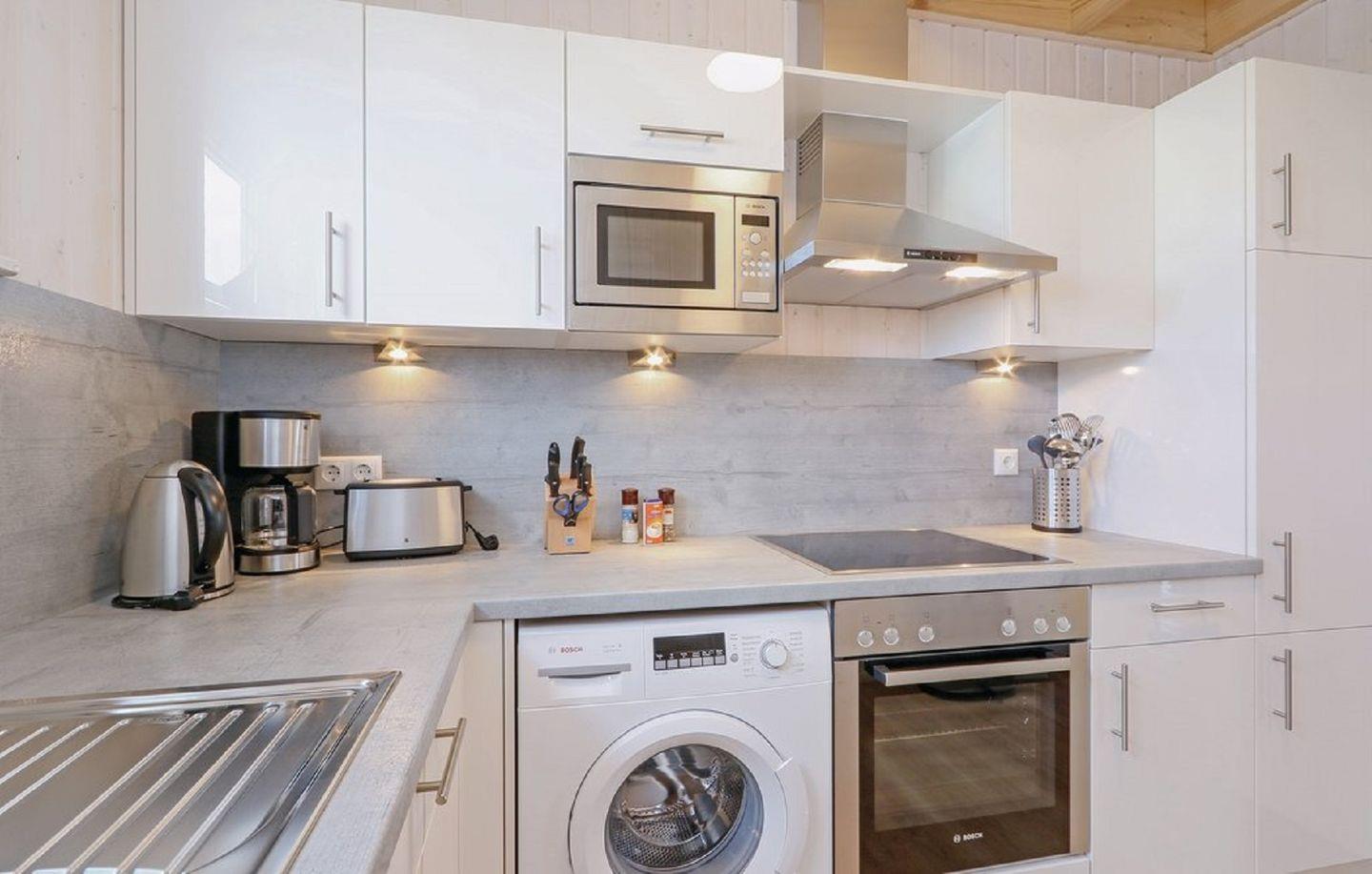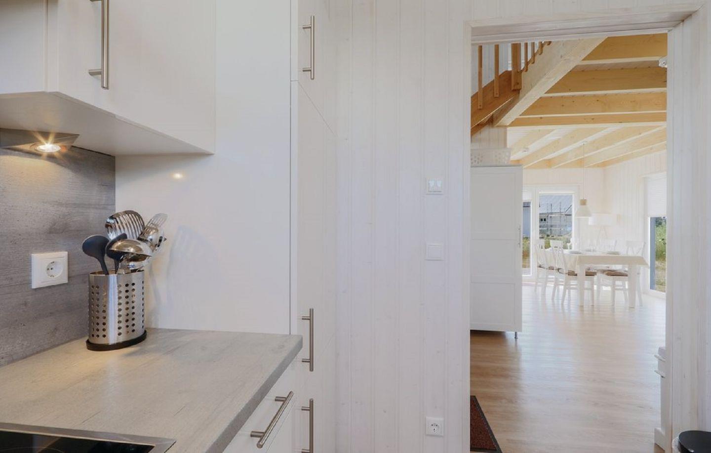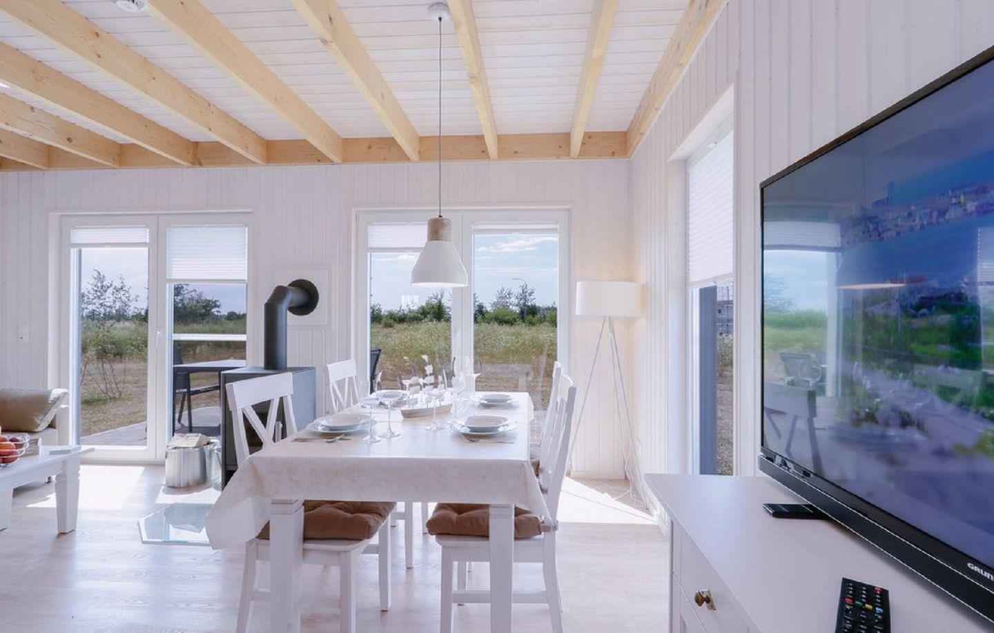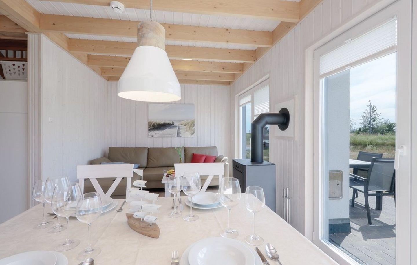 Das Ferienhaus bietet auf 80m² einen offenen Wohn- und Essbereich mit Kamin, eine voll ausgestattete Küche, zwei Schlafzimmer, zwei Badezimmer und eine Terrasse. Das eine Schlafzimmer bietet ein Doppelbett und das andere Schlafzimmer zwei Einzelbetten. Eine Couch lässt sich mit wenigen Handgriffen zu einer weiteren Schlafmöglichkeit für ein Kind umfunktionieren. Die Bäder bieten eine Dusche und eine Badewanne. Auf der Terrasse gibt es Gartenmöbel, einen Sonnenschirm, sowie einen Holzkohlegrill.