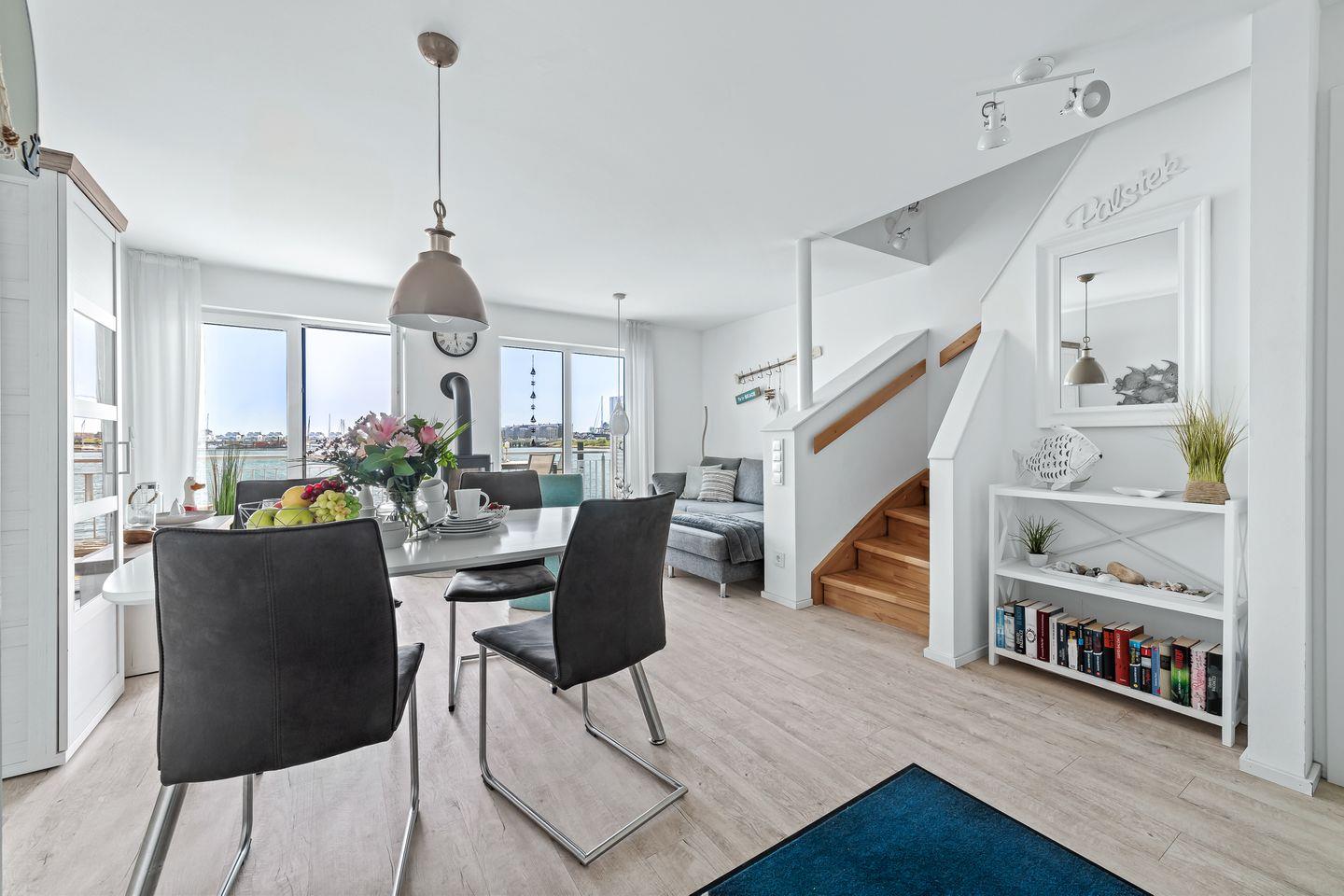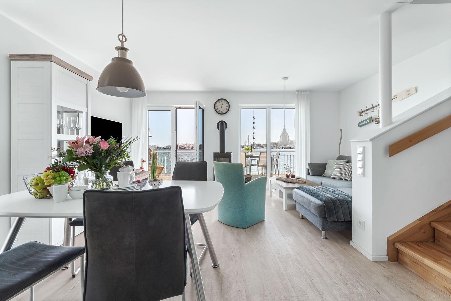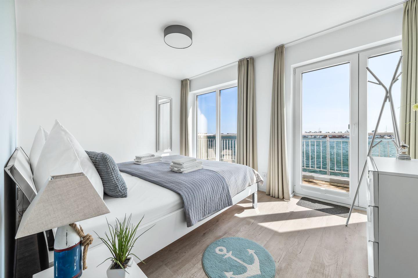 Mit dem Segel- und Sportboothafen des OstseeResort Olpenitz zur einen und dem Ostseefjord Schlei zur anderen Seite, überzeugt dieses Ferienhaus "Palstek" durch seine rundum Wasserlage auf einer schmalen Landzunge umgeben von Wasser. Der weiße Sandstrand des OstseeResort Olpenitz sowie der Weidefelder Sandstrand befinden sich nur wenige Gehminuten entfernt. Ihr Blick fällt durch bodentiefe Panorama Fensterfronten auf eine wunderschöne Wasserkulisse. Auf jeder Ebene verfügt das Ferienhaus über eine Terrasse mit Hafenblick. Das Highlight: Die große 360° Dachterrasse mit ganztags Sonne. Und wer sich einen Wellness Urlaub wünscht, der wird hier fündig. Die Finnische Sauna und eine Relax-Whirlwanne sorgen für Entspannung nach einem ausgiebigen Strandspaziergang. Der offen gestaltete, lichtdurchflutete Wohn- und Essbereich befindet sich im Erdgeschoss des Ferienobjekts. Von hier aus gelangt man direkt auf die angrenzende Terrasse. Frühstücken bei Morgensonne oder ein gemeinsamer Grillabend – Hafenkino ist hierbei garantiert. Die Küche lässt keine Wünsche offen. Rundum ausgestattet erlaubt sie vollen Urlaubskomfort. Das ganze Haus ist mit Fußbodenheizung ausgestattet. Finnische Sauna, Whirlwanne und Kaminofen versprechen Komfort zu jeder Jahreszeit und machen dieses Ferienhaus richtig kuschelig – auch an nordischen Schietwettertagen. Für zusätzliche Unterhaltung sorgt das Smart TV mit Telekom Home Entertainment Programm. Der Ruhebereich des Ferienhauses befindet sich im ersten Obergeschoss. In zwei Schlafzimmern dürfen Sie einschlafen und aufwachen bei Wasserblick. Das Hauptschlafzimmer ist zum Hafen hin ausgerichtet und mit einem Doppelbett (180x200cm)ausgestattet. Bei einem morgendlichen Kaffee können Sie auf der angrenzenden Terrasse ablegende Segelschiffe beobachten. Das zweite Schlafzimmer erlaubt einen Blick auf den Ostseefjord Schlei und verfügt über zwei bequeme Einzel-Boxspringbetten (je 90x200cm) sowie einen zusätzlichen Flatscreen-TV. Ebenfalls auf dieser Ebene befindet sich das voll ausgestattete Badezimmer mit Wasserblick. Ein Gäste WC im Erdgeschoss sorgt für zusätzlichen Komfort. Bei dem Ferienhaus "Palstek" handelt es sich um eine Haushälfte. Direkt vor dem Haus stehen ein Stellplatz sowie ein eigener Fahrradschuppen mit extra Fahrradständern zur Verfügung. Homeoffice mit Wasserblick? Kein Problem in "Palstek" - für ein Schreibtisch ist gesorgt.