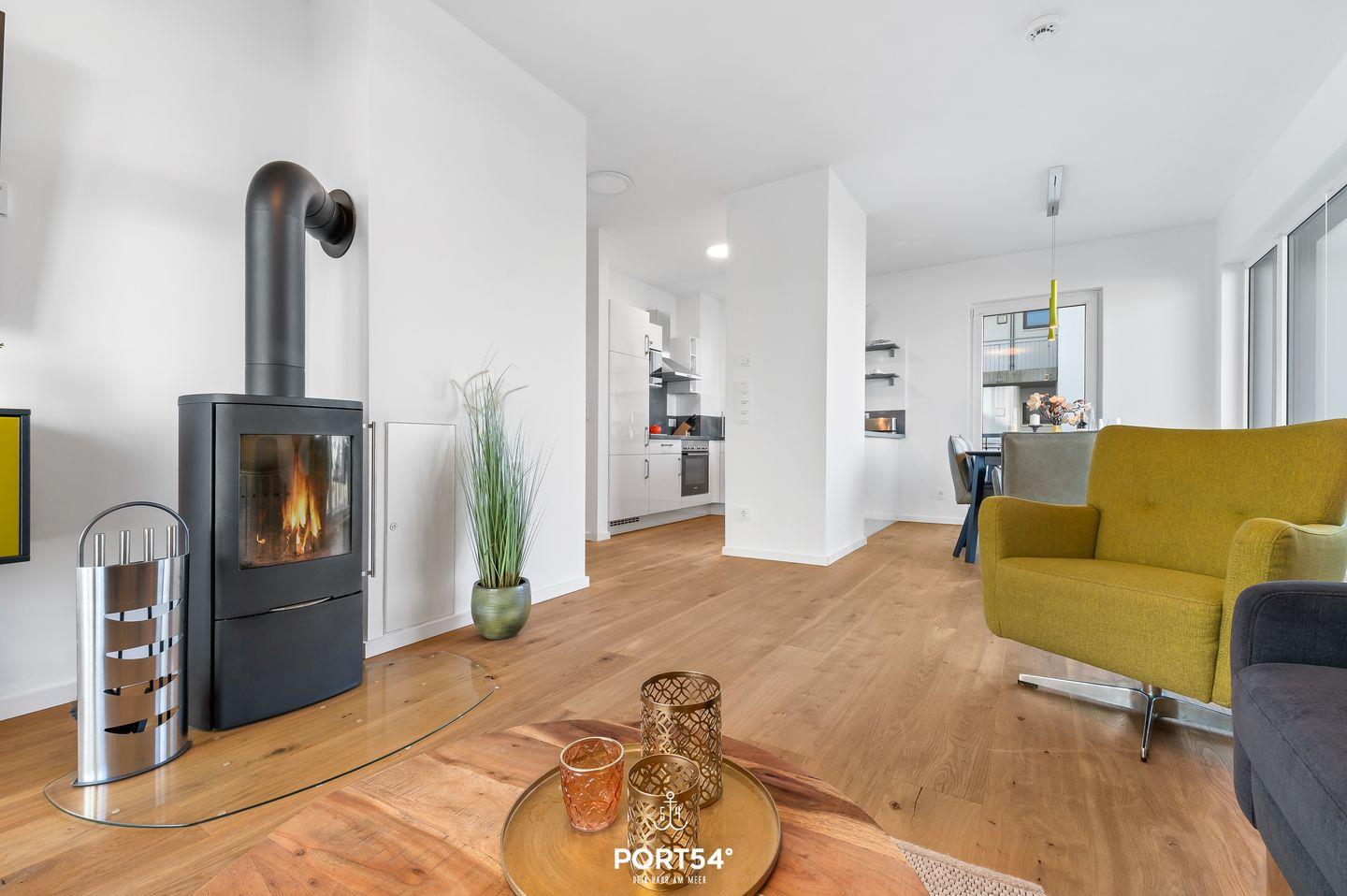Der Kaminofen im Wohnbereich verbreitet an kälteren Tagen eine kuschelige Wärme im gesamten Wohn- und Essbereich. Hier kannst Du es Dir auf dem Sofa oder dem Sessel gemütlich machen und einen spannenden Film auf dem Flachbild-TV ansehen oder auf der Playstation 4 ein wenig spielen. Vom Wohn- und Essbereich aus gelangst Du zudem auf den zweiten Balkon mit Blick über das Resort.